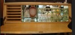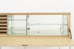 Style: Mid-Century Materials & Techniques: Arch, brass, glass, inlaid, veneer, wood Category: Cabinets & Case Goods, Dining Room