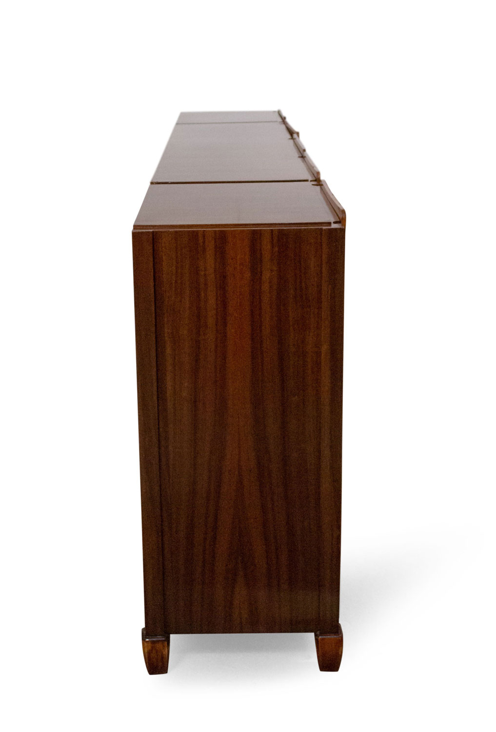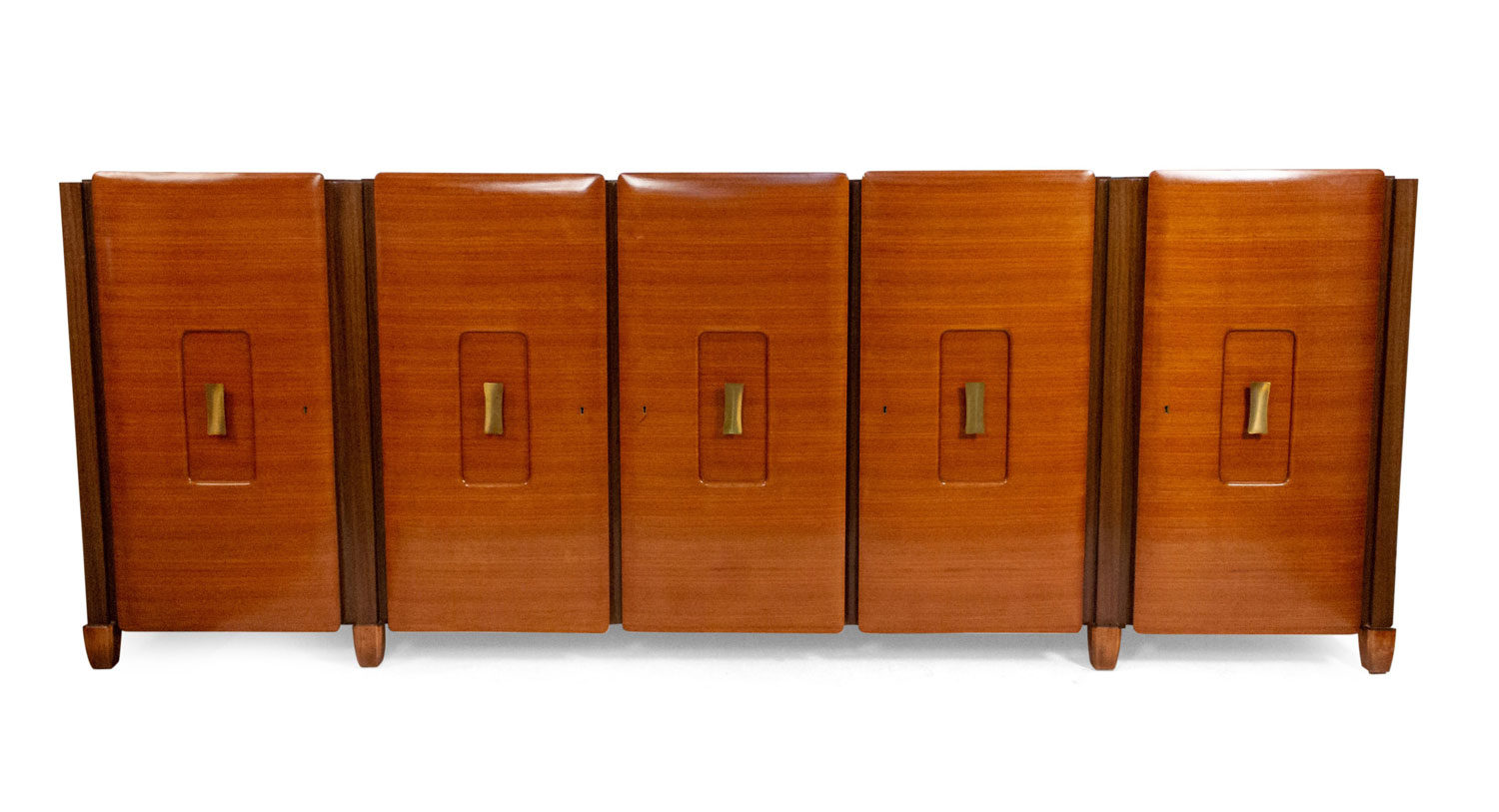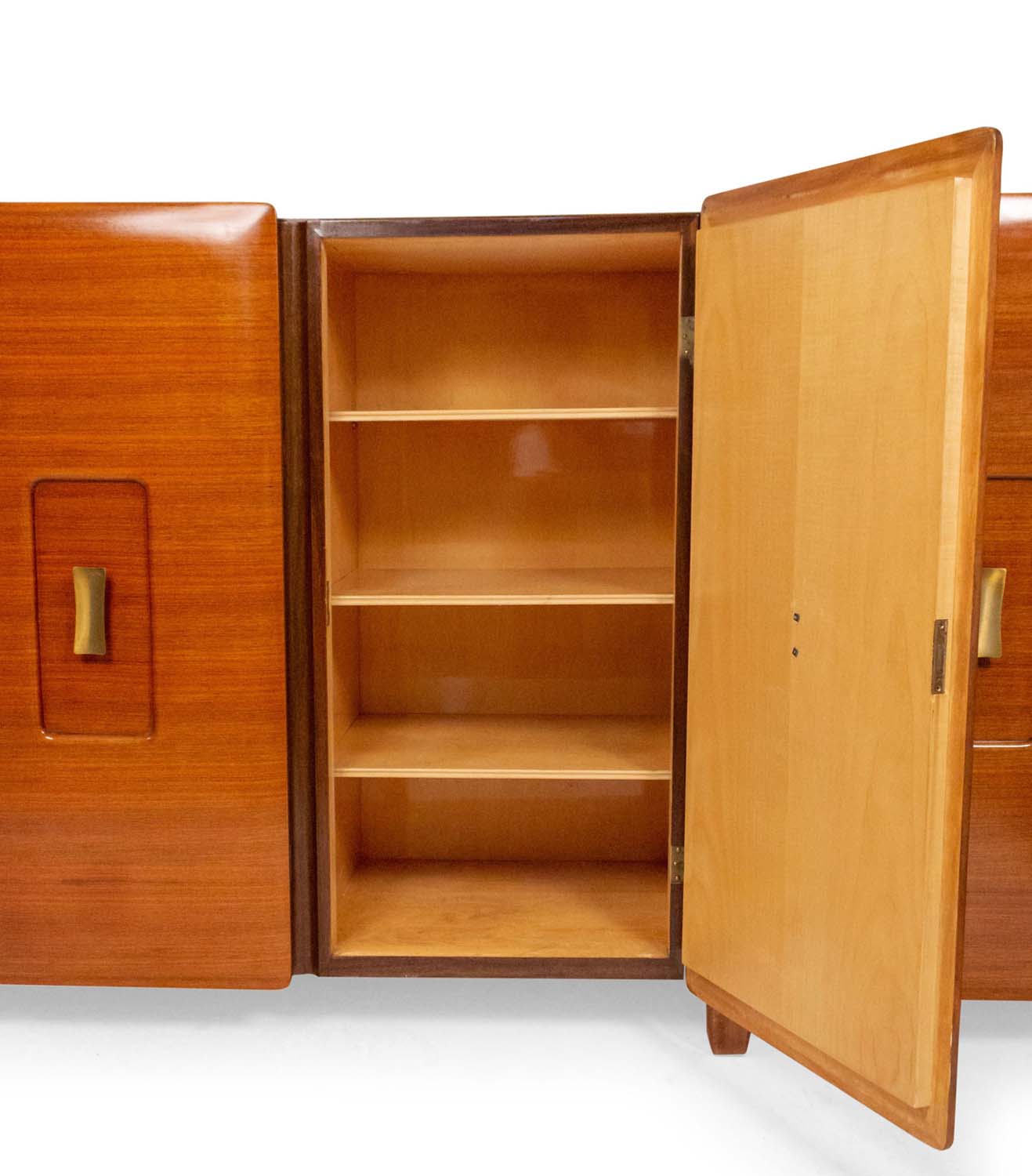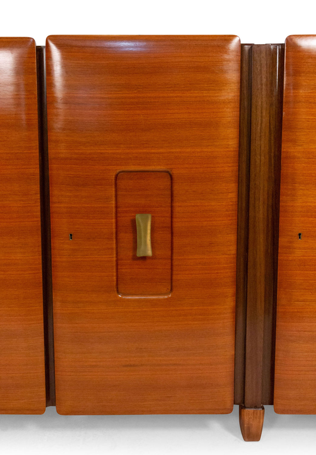 Italian Mid-Century (1950s) rosewood sideboard with 5 teak doors having a rectangular brass handle and supported on low tapered square legs (Attributed to OSVALDO BORSANI)