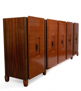 Italian Mid-Century (1950s) rosewood sideboard with 5 teak doors having a rectangular brass handle and supported on low tapered square legs (Attributed to OSVALDO BORSANI).
