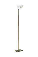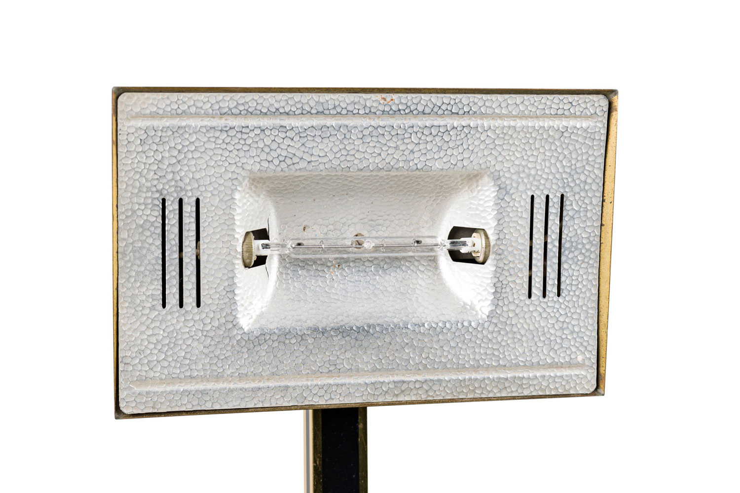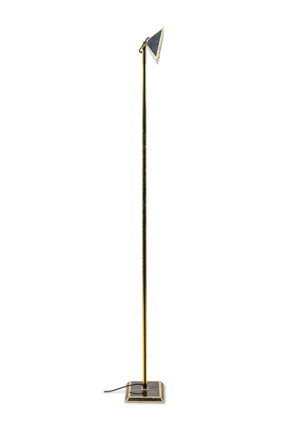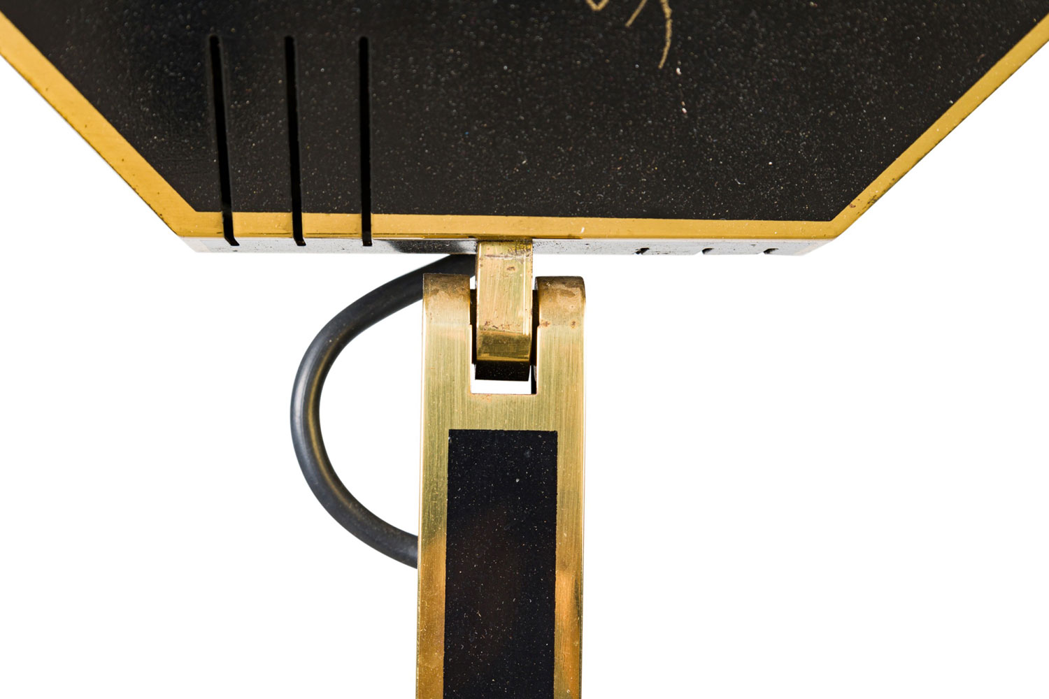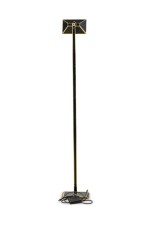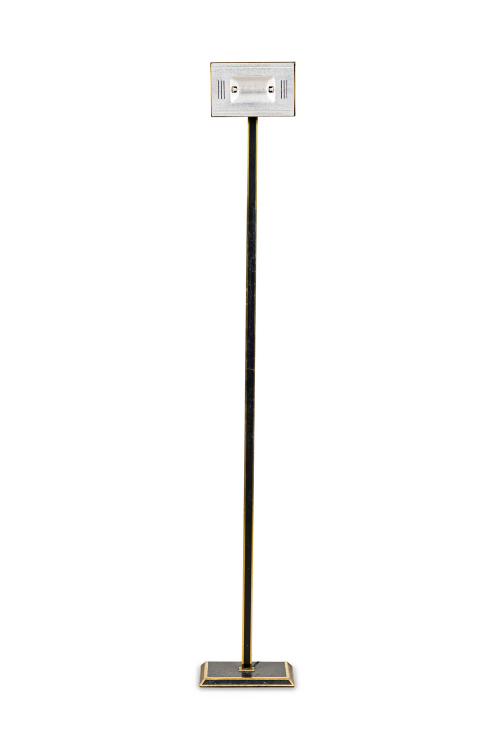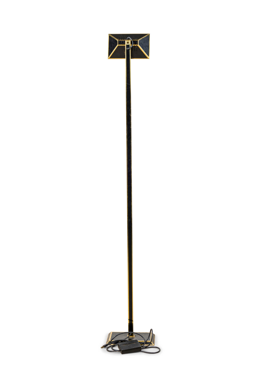 Italian Mid-Century Tall Brass and Black Lacquer trimmed floor lamp with a rectangular top light fixture and base connected by a narrow rectangular column.