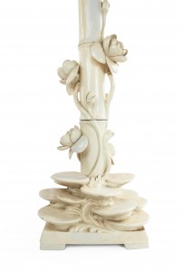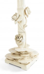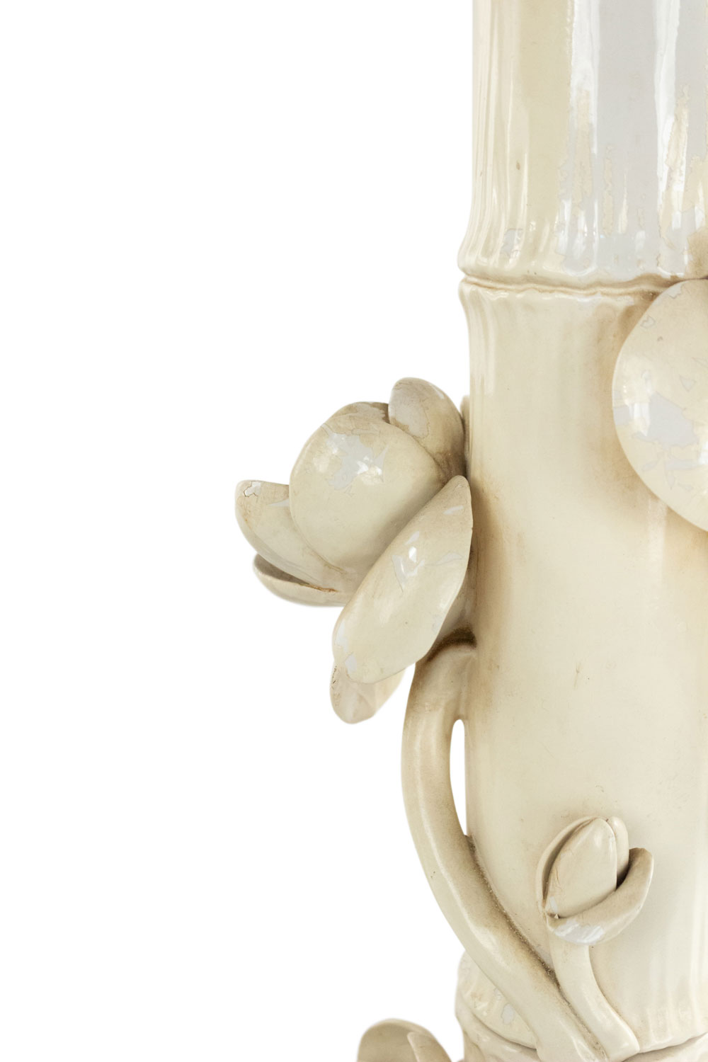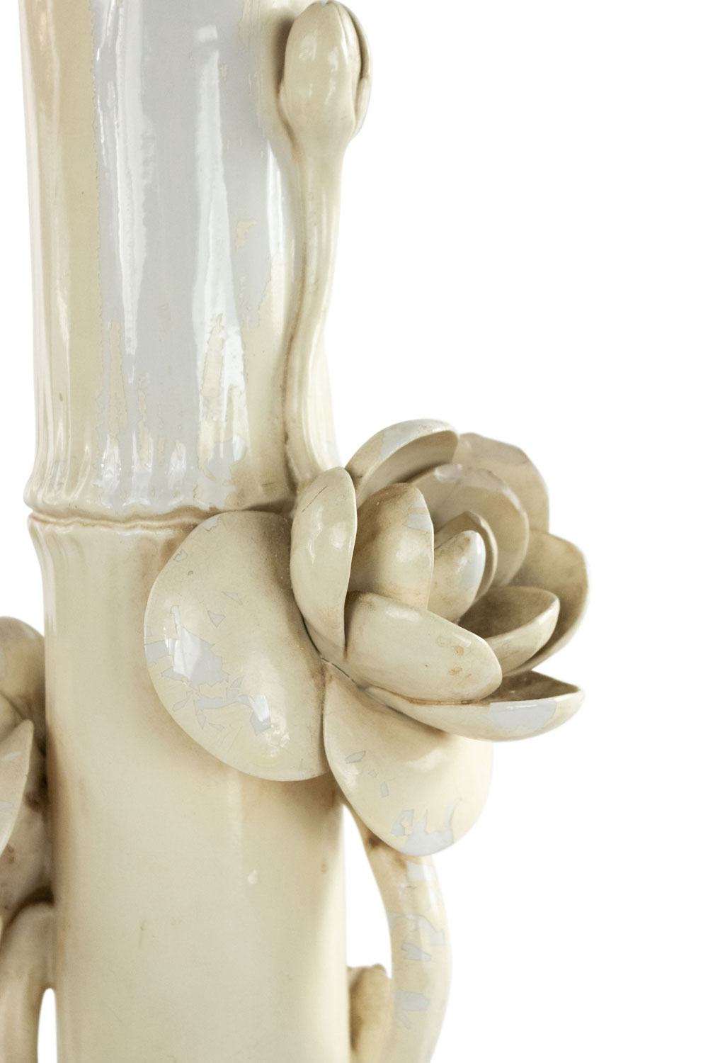 Italian 1950s white porcelain and painted table lamp with a bamboo stem emanating from a tiered square shaped lily pad base with flowers..