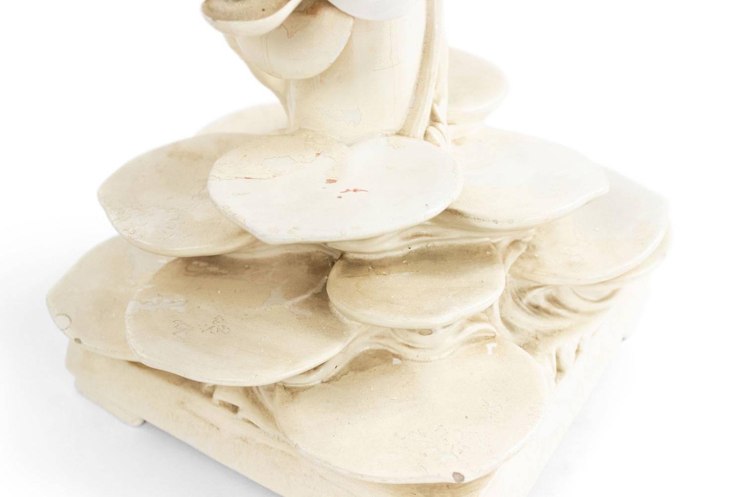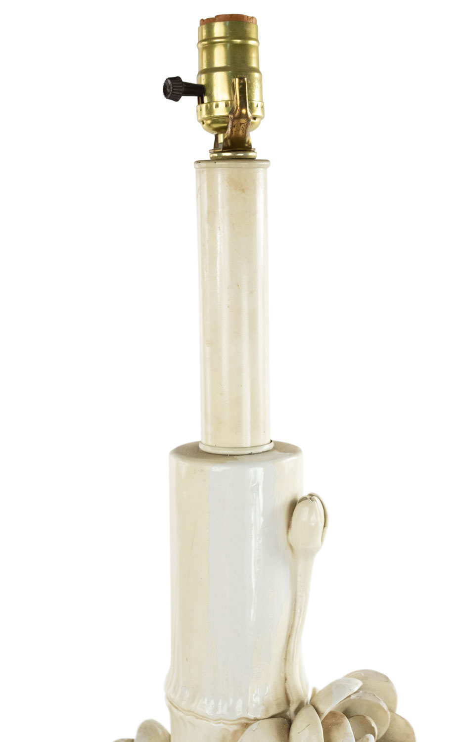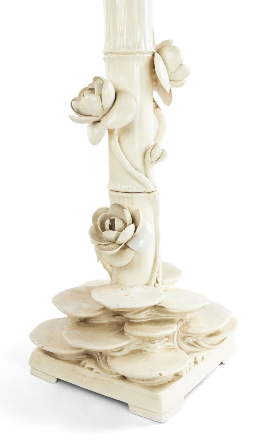 Italian 1950s white porcelain and painted table lamp with a bamboo stem emanating from a tiered square shaped lily pad base with flowers.