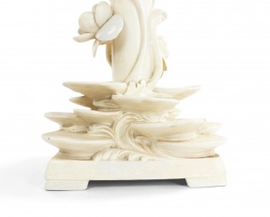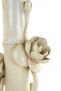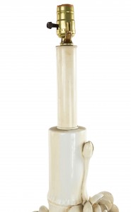 Style: Mid-Century Materials & Techniques: Porcelain, bamboo Category: Lighting Condition: Loss to paint finish and some small chips, Ships without a shade