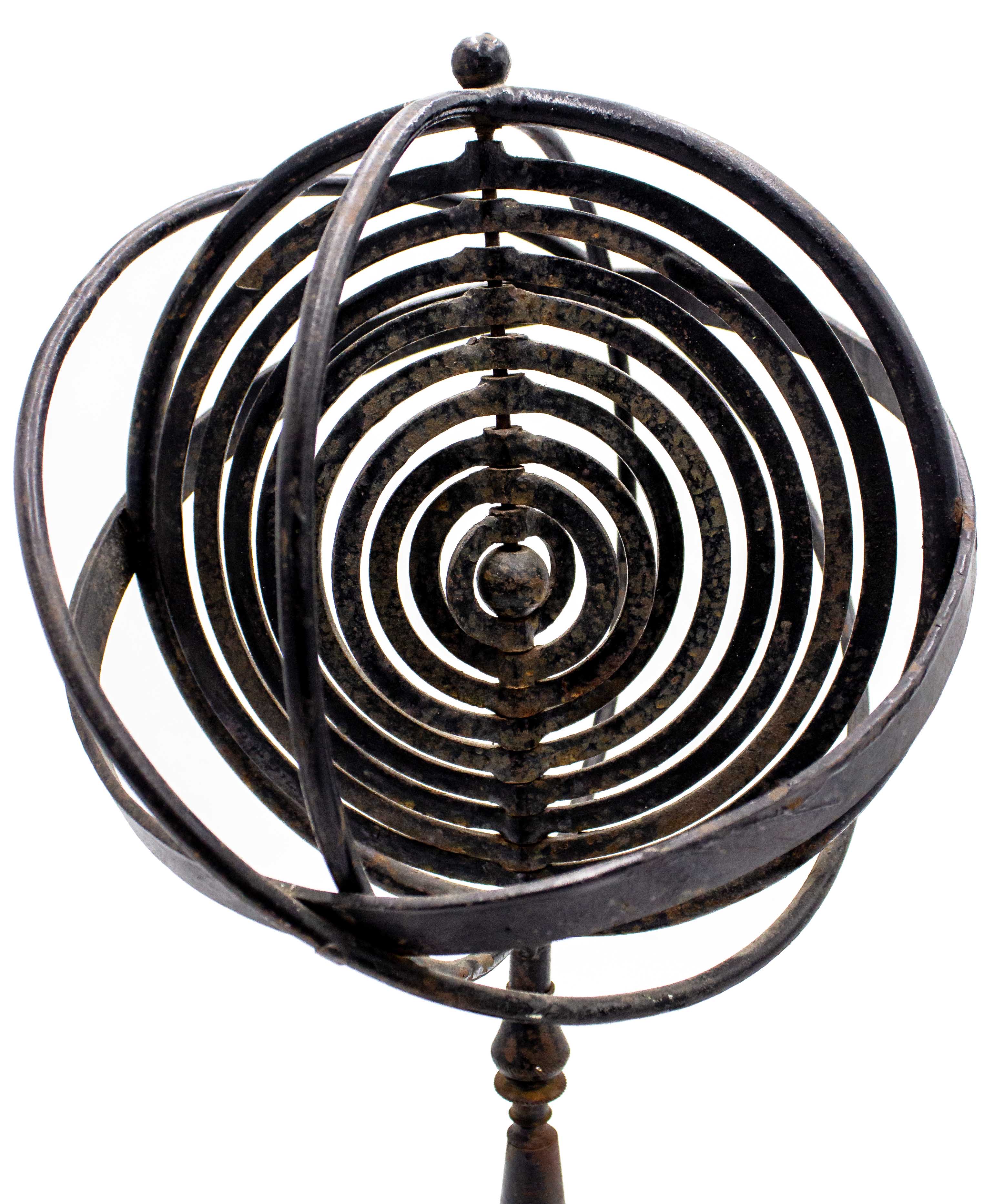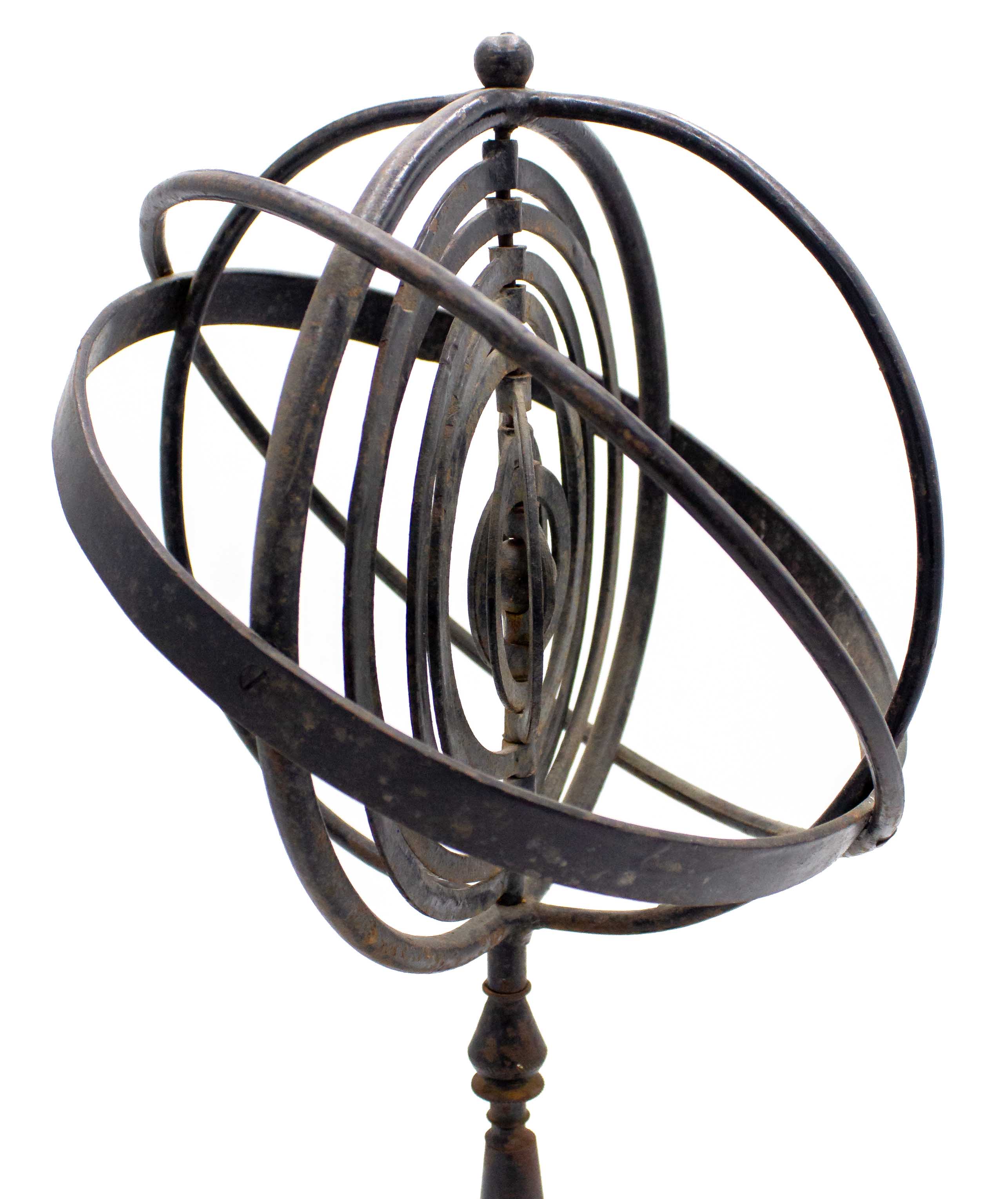 Italian Mid-Century Modern wrought iron armillary globe with a center sun surrounded by 9 movable planetary rings on a platform base.