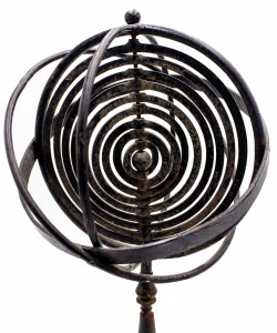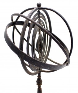 Italian Mid-Century Modern wrought iron armillary globe with a center sun surrounded by 9 movable planetary rings on a platform base..