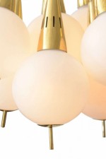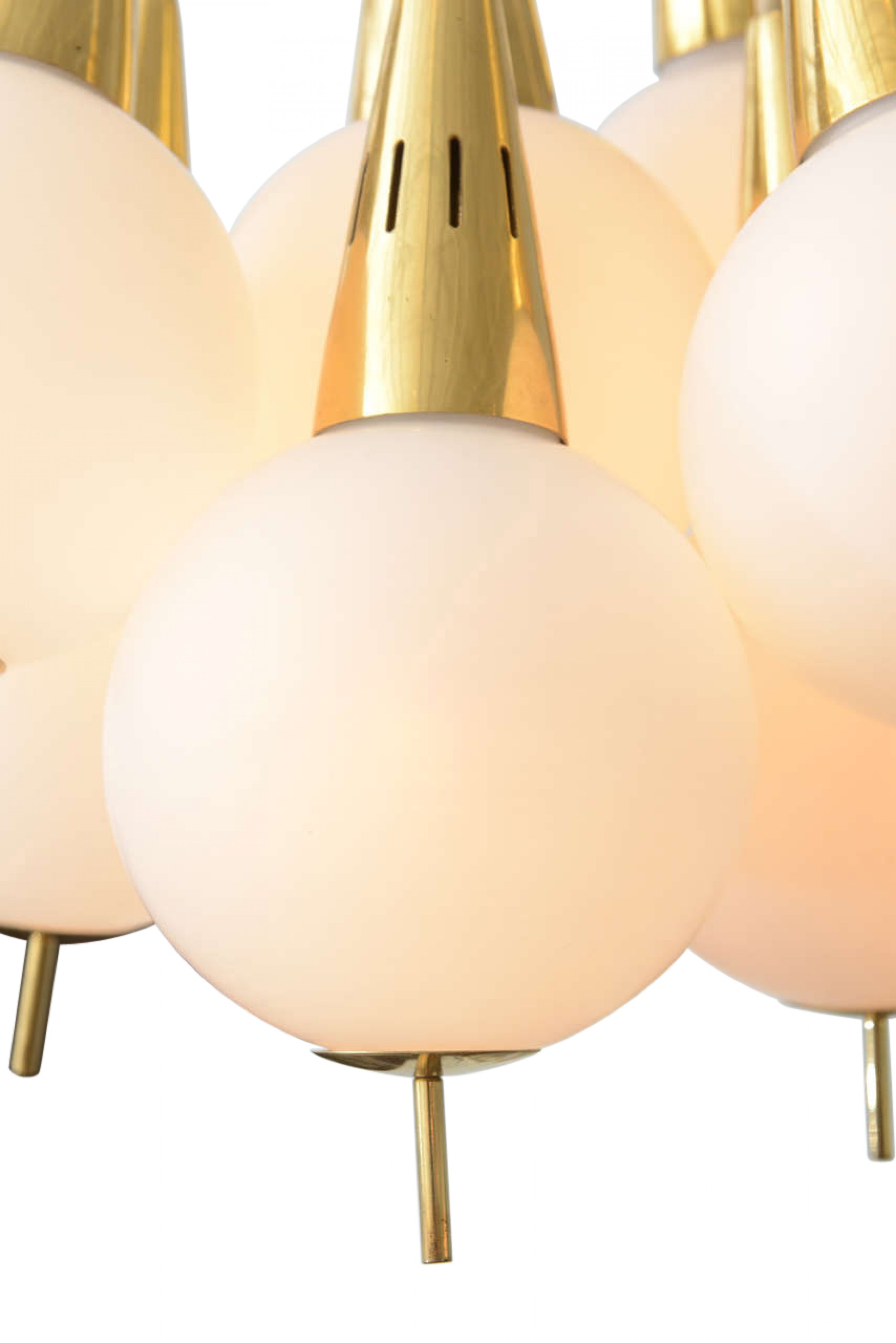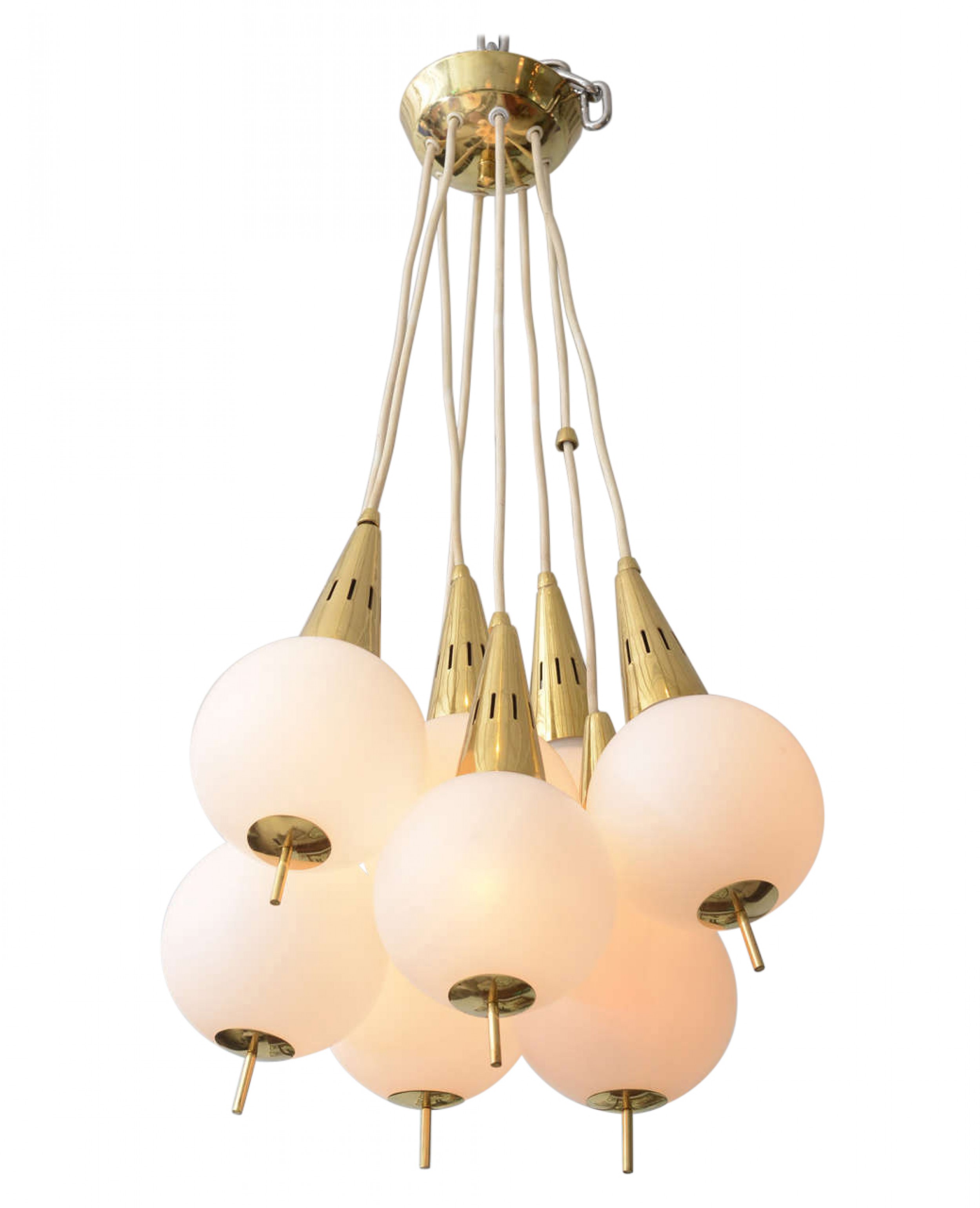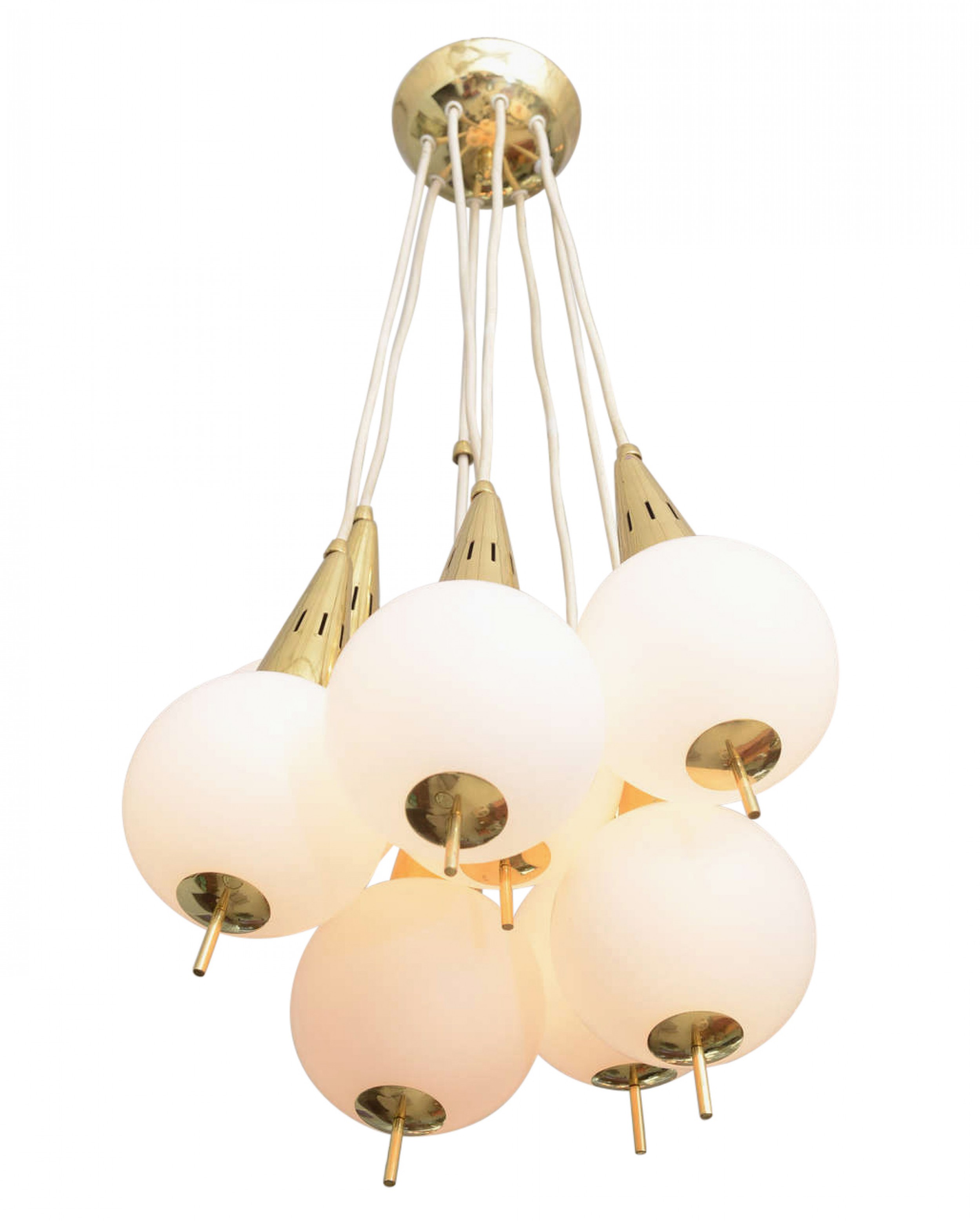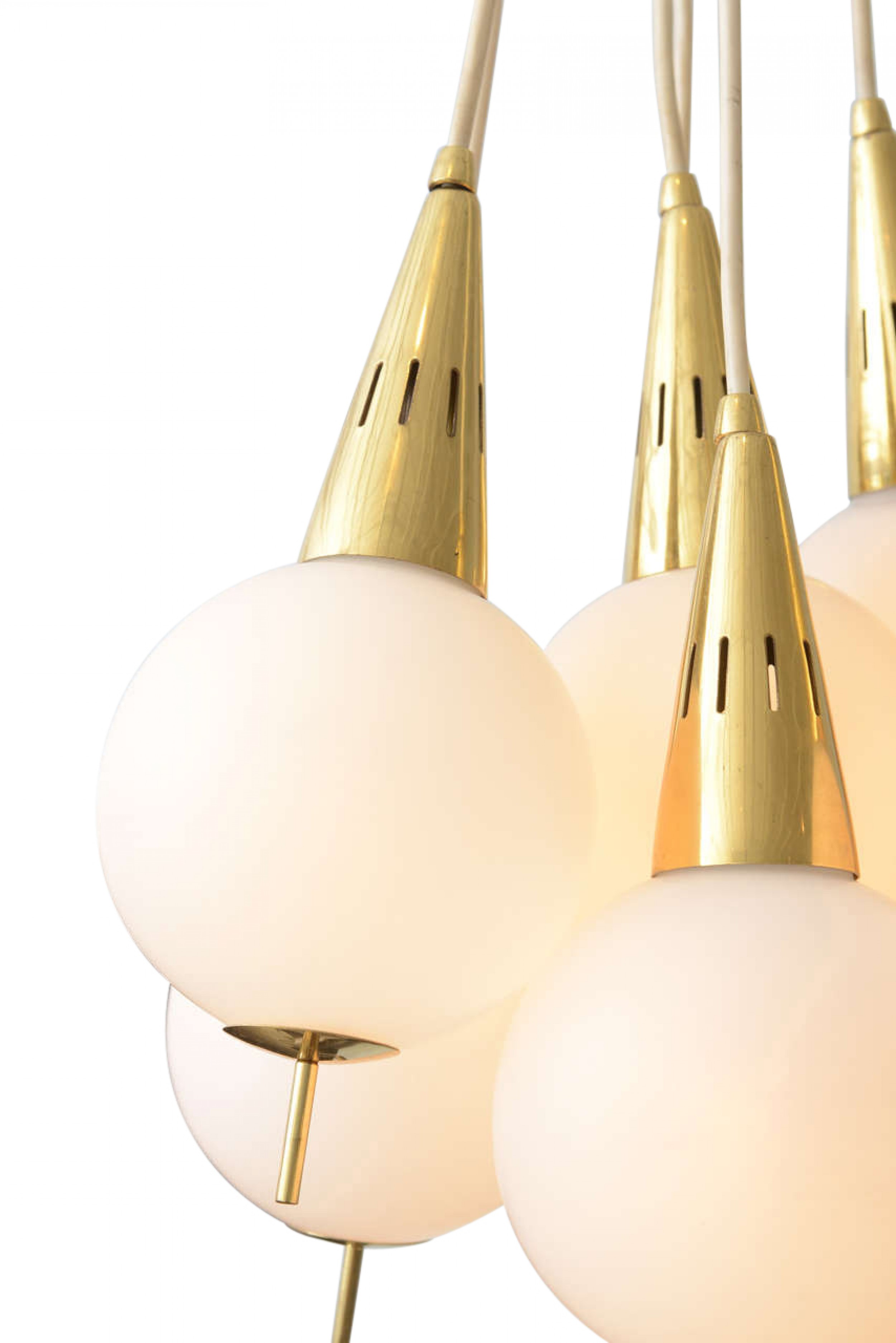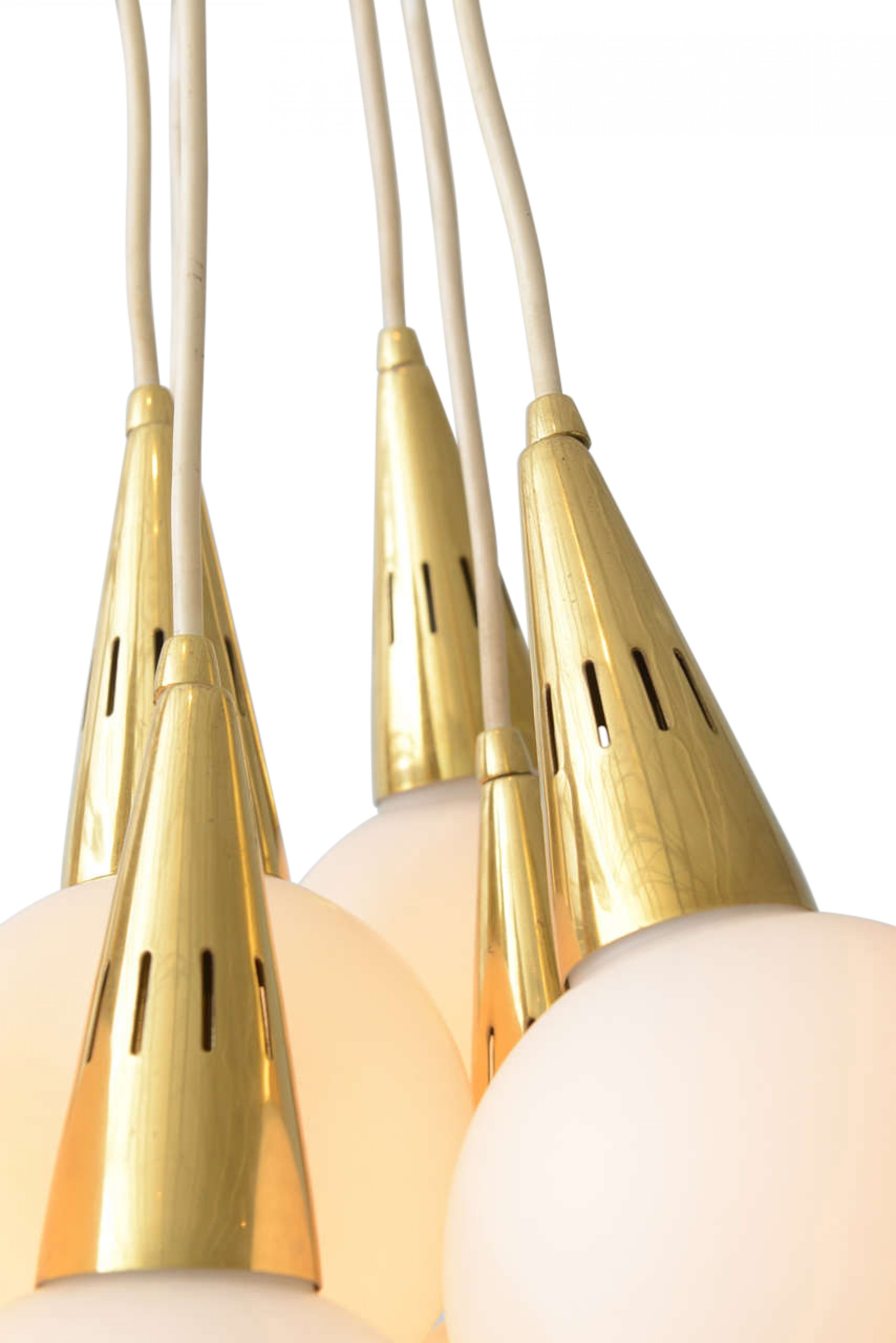 Italian Mid-Century Modern Chandelier with a cluster of 8 white glass spheres having brass finial bottoms and suspended from brass cones connected by white cords to a central ceiling canopy (Manner of STILNOVO)