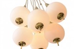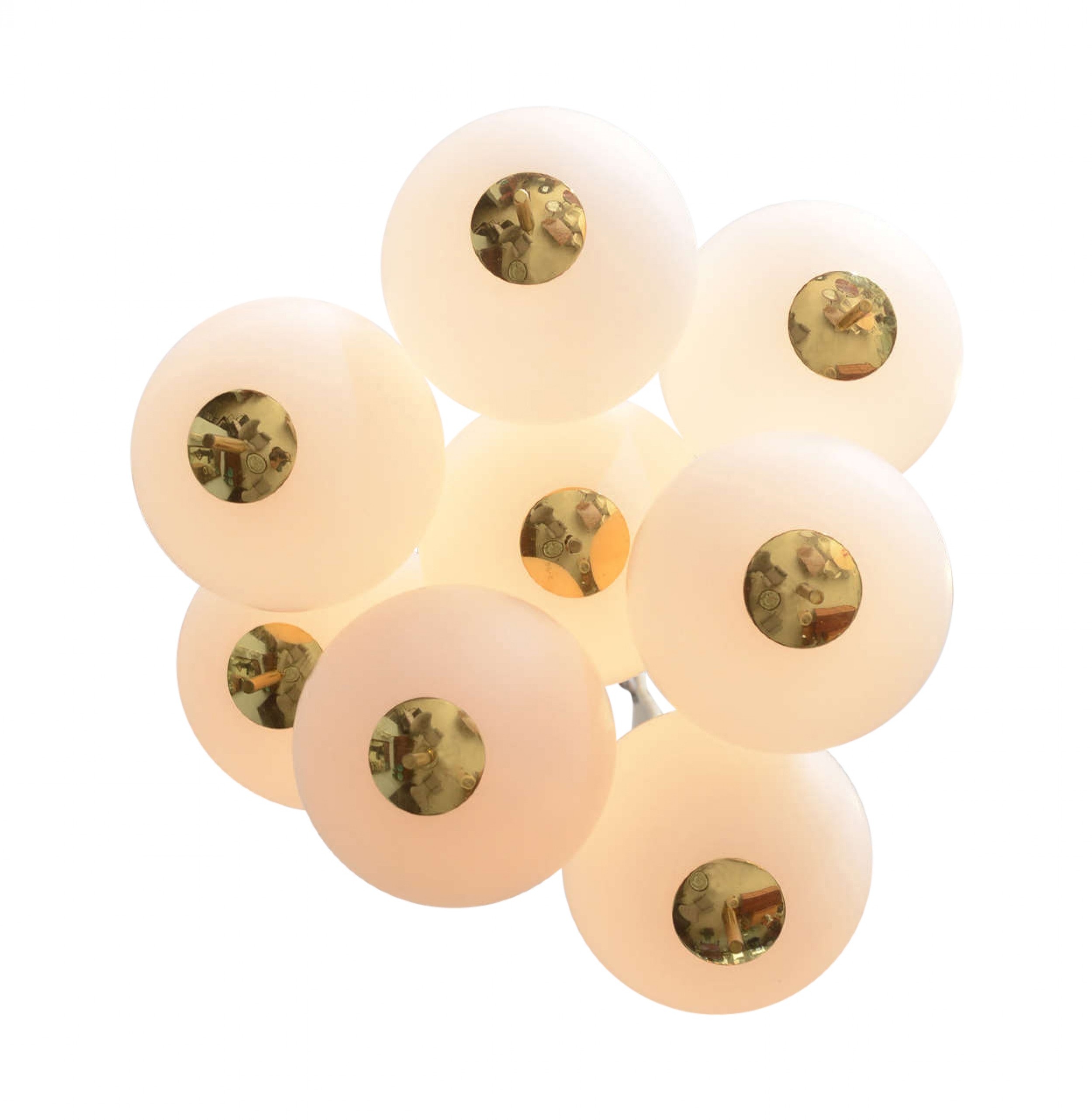 Italian Mid-Century Modern Chandelier with a cluster of 8 white glass spheres having brass finial bottoms and suspended from brass cones connected by white cords to a central ceiling canopy (Manner of STILNOVO).