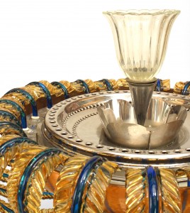 Mid-Century Italian (1940s) Murano metal and glass fountain with 36 amber & blue colored glass feather shaped leaves arranged around a central clear glass fluted bowl, has minor damage, please inquire..