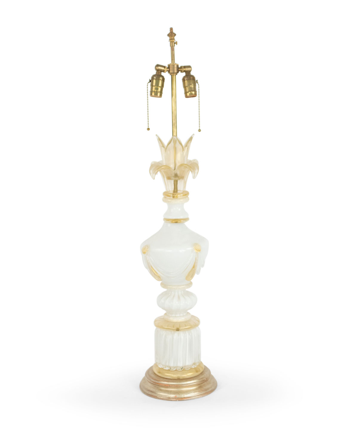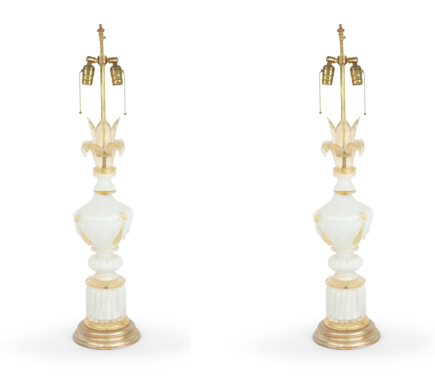 4 Italian Murano Neo-classic style "INCAMICIATO" white overlay glass table lamps with swag applied urn above a round gilt wood base with gold dusted trim. (PRICED EACH) Modern