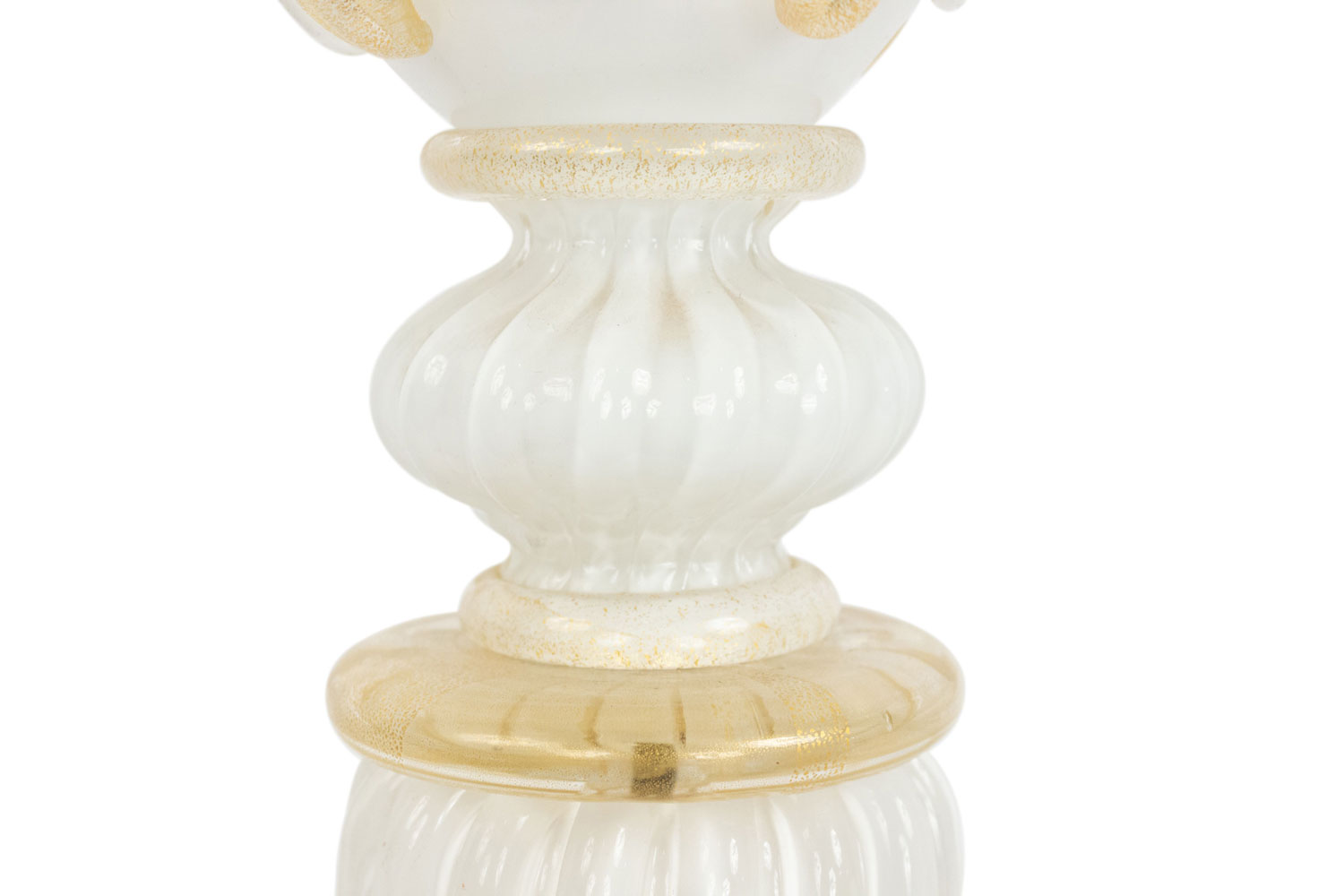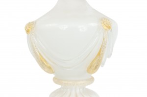 4 Italian Murano Neo-classic style "INCAMICIATO" white overlay glass table lamps with swag applied urn above a round gilt wood base with gold dusted trim. (PRICED EACH) Modern.