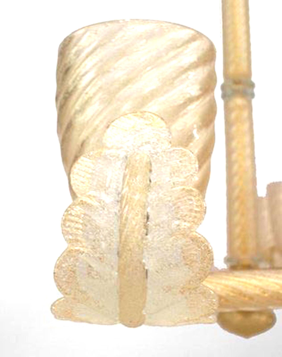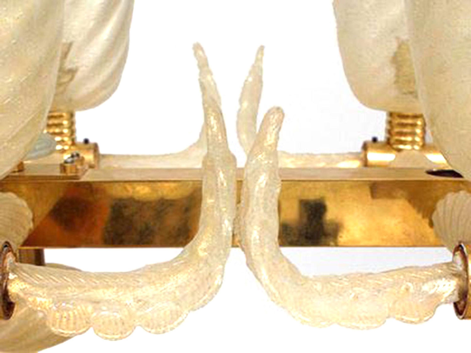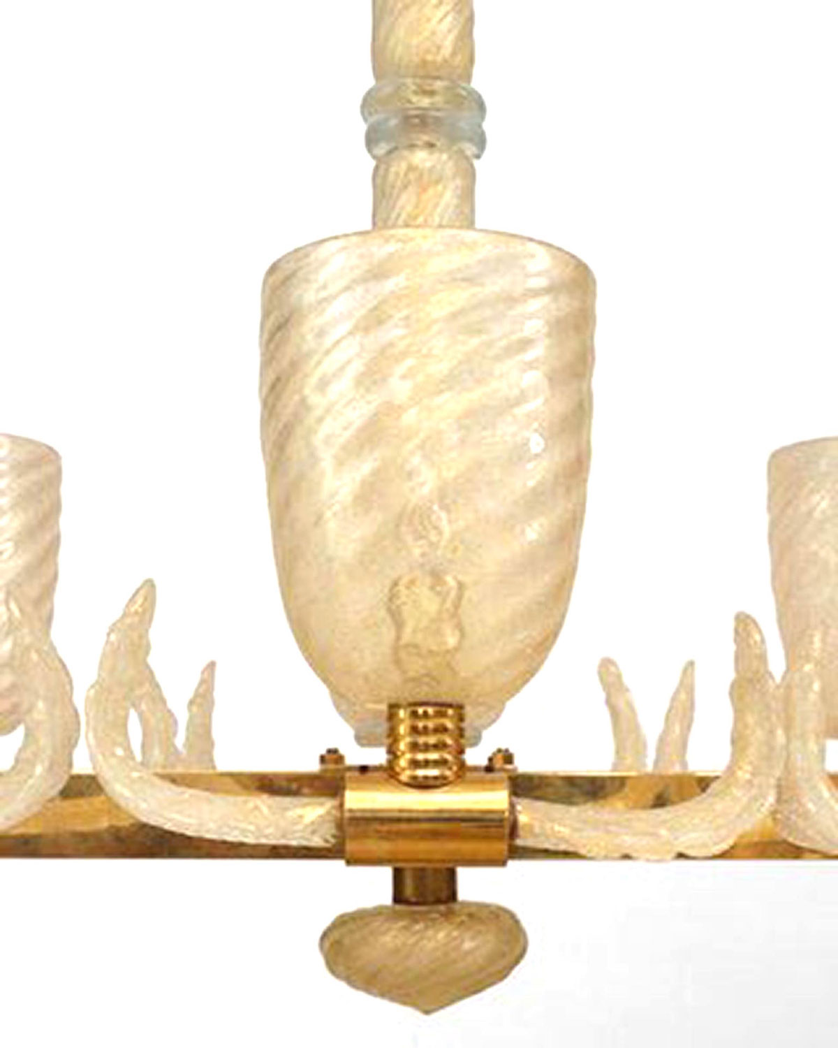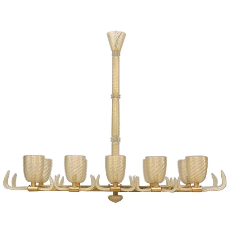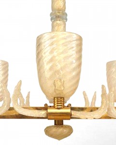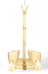 Italian Murano gold dusted "PULEGOSO" bubbled glass & brass chandelier of rectangular form with 10 swirl design shades & center stem and feather branches..