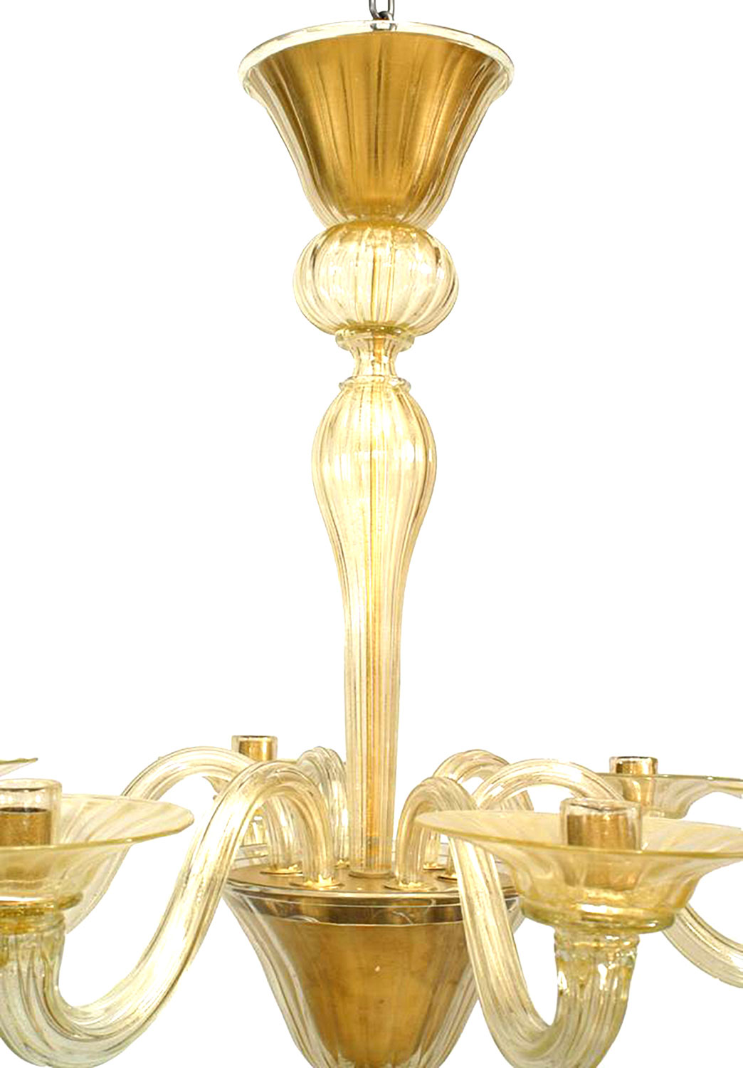 3 Italian Murano "SOMMERSO" gold dusted glass chandeliers with 6 fluted & scroll design arms supporting a dish shaped shade/canopy. (PRICED EACH).