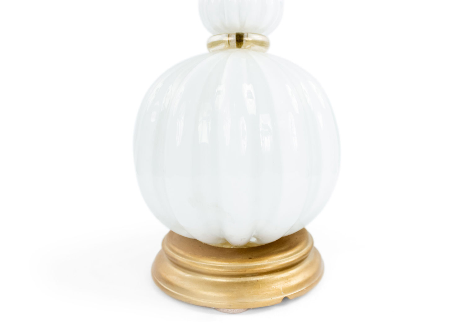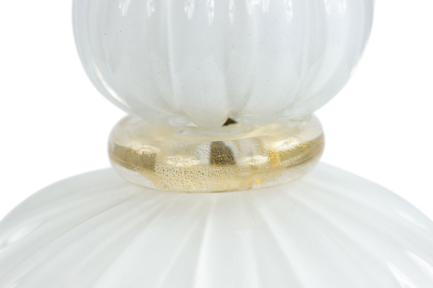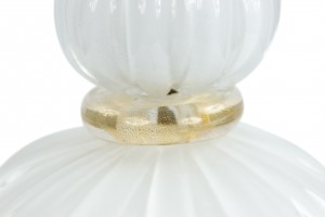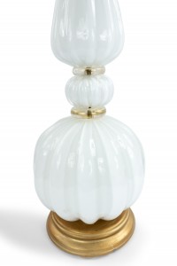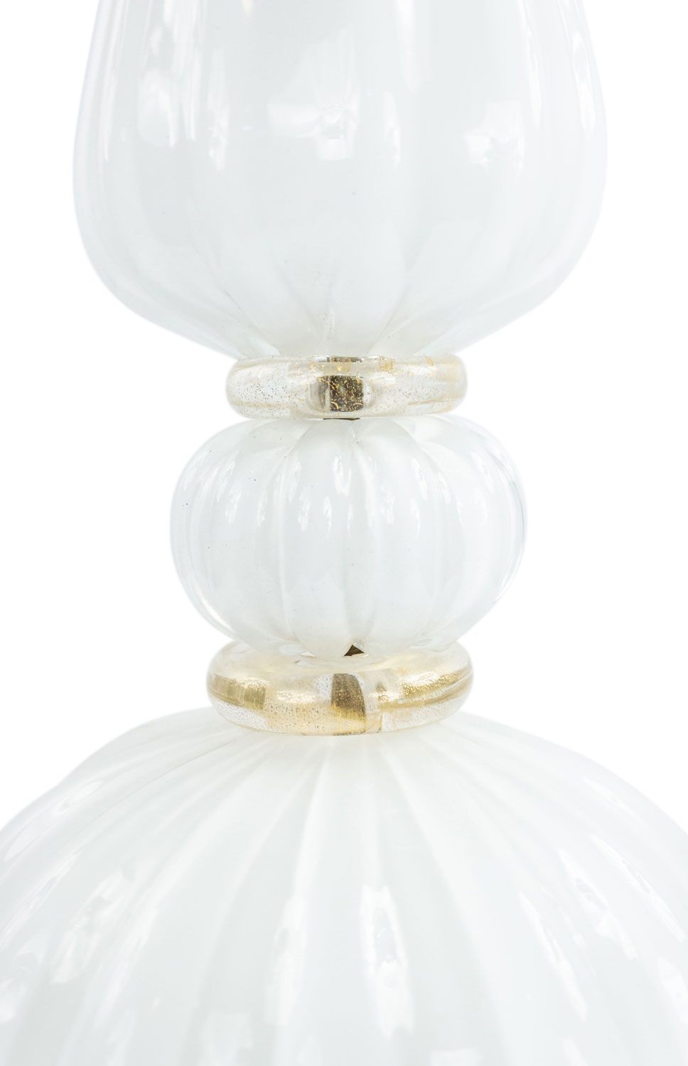 Italian Murano white "INCAMICIATO" glass table lamp with 3 fluted design sections separated by gold dusted glass rings resting on a round wood platform base.