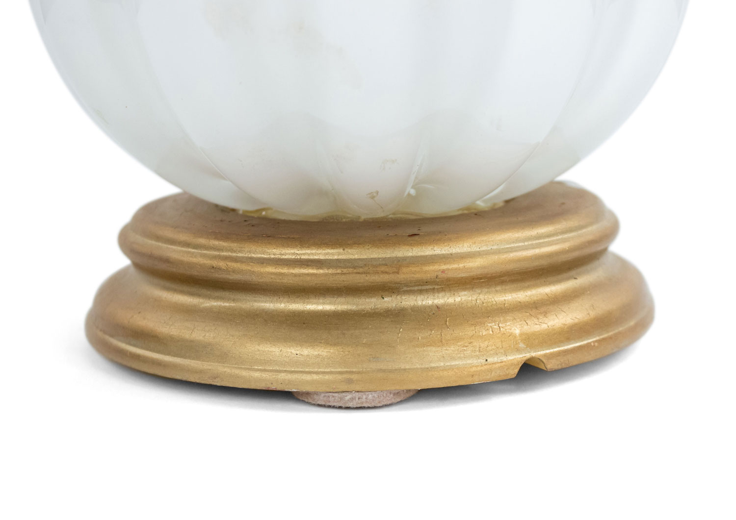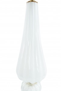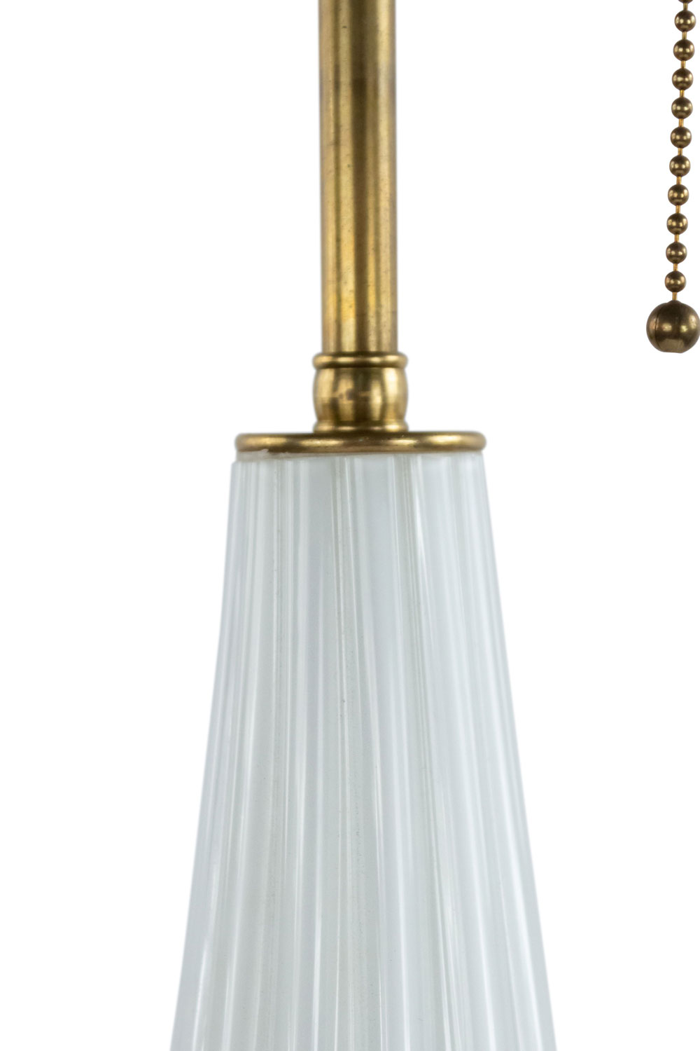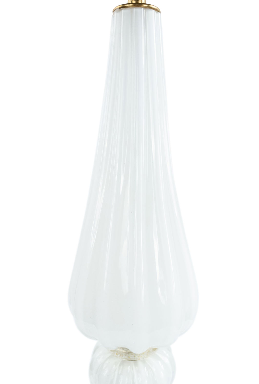 Italian Murano white "INCAMICIATO" glass table lamp with 3 fluted design sections separated by gold dusted glass rings resting on a round wood platform base.