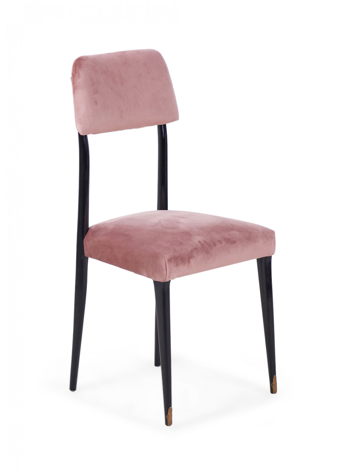 SET of 6 Italian 1940s ebonized side chairs with brass trim sabot on the feet and mauve pink velvet upholstery. (design att: VITTORIO DASSI).