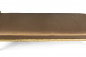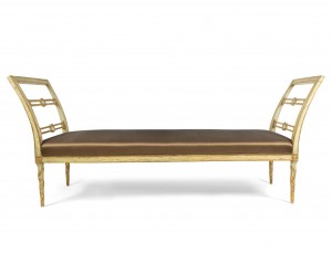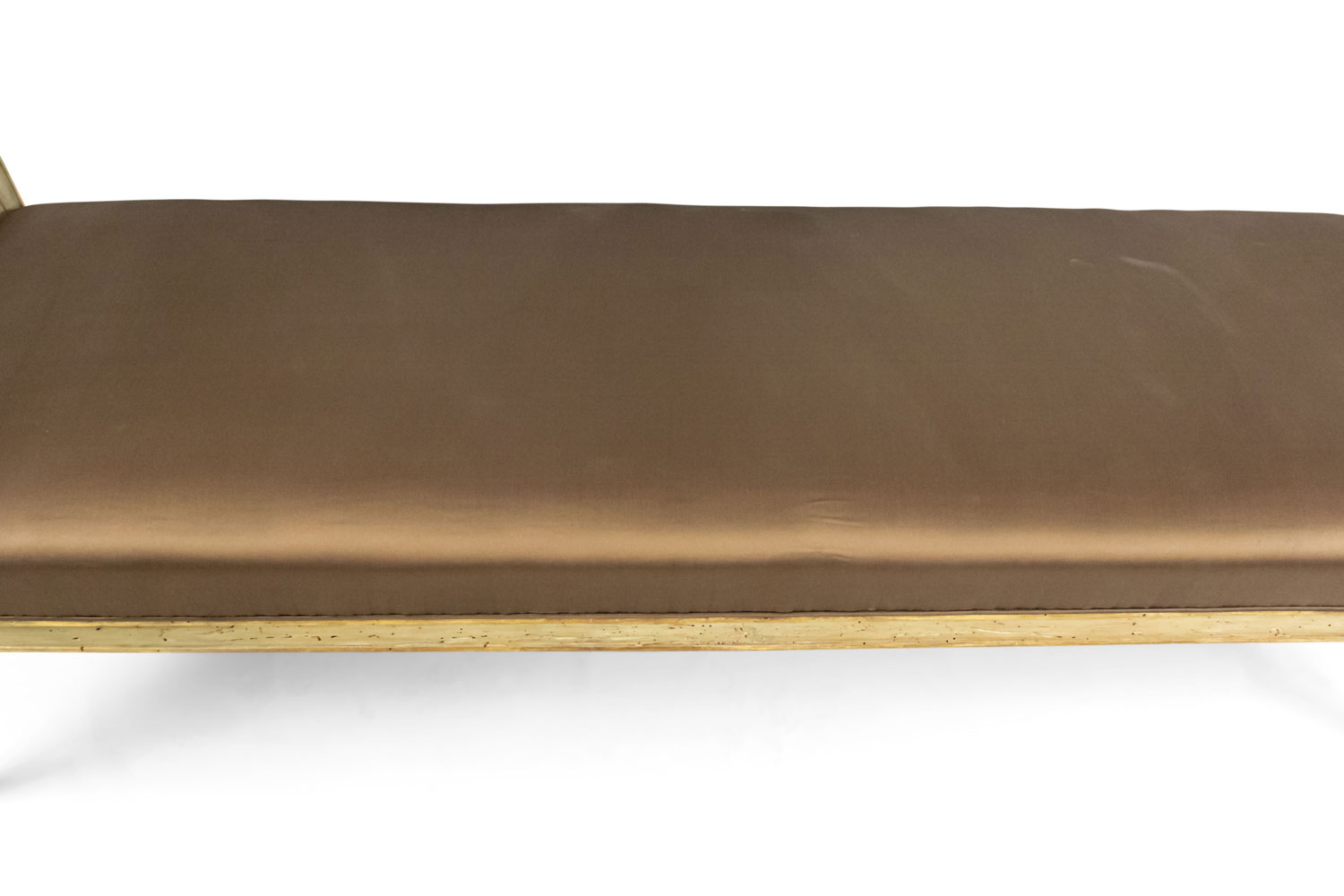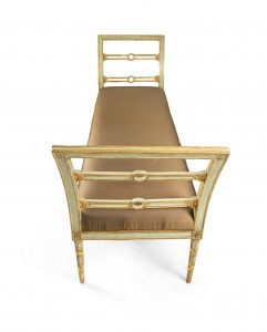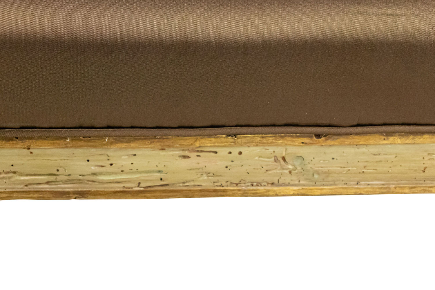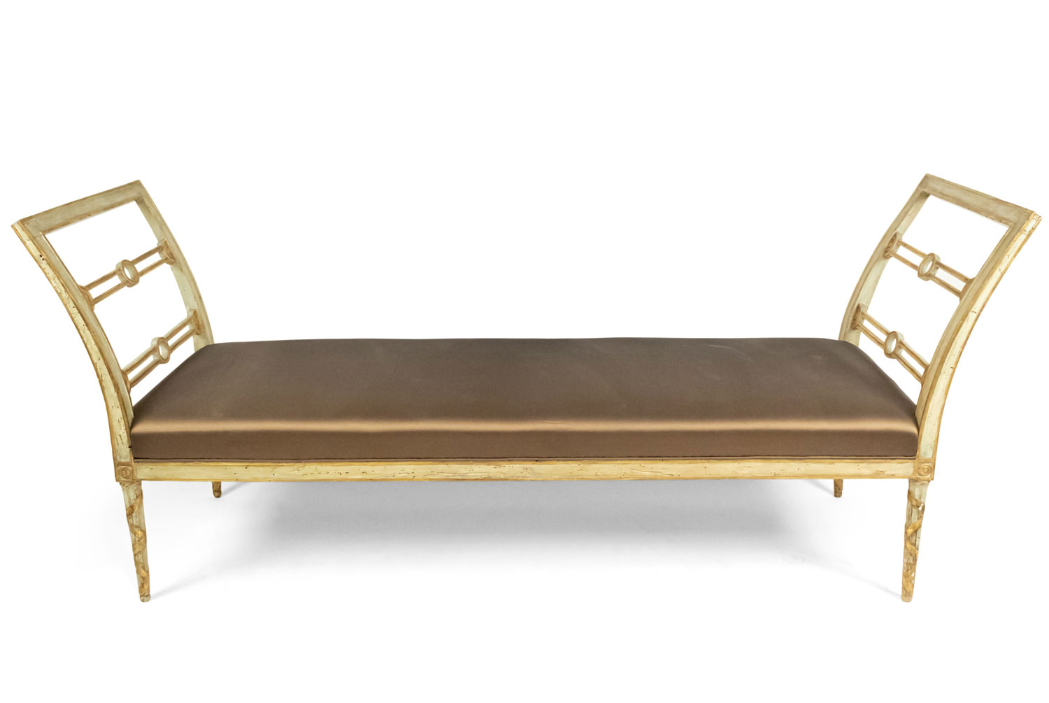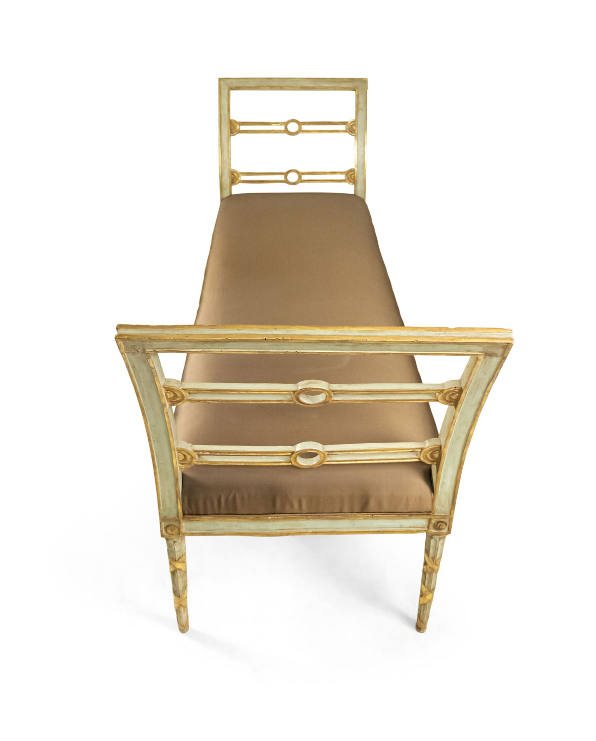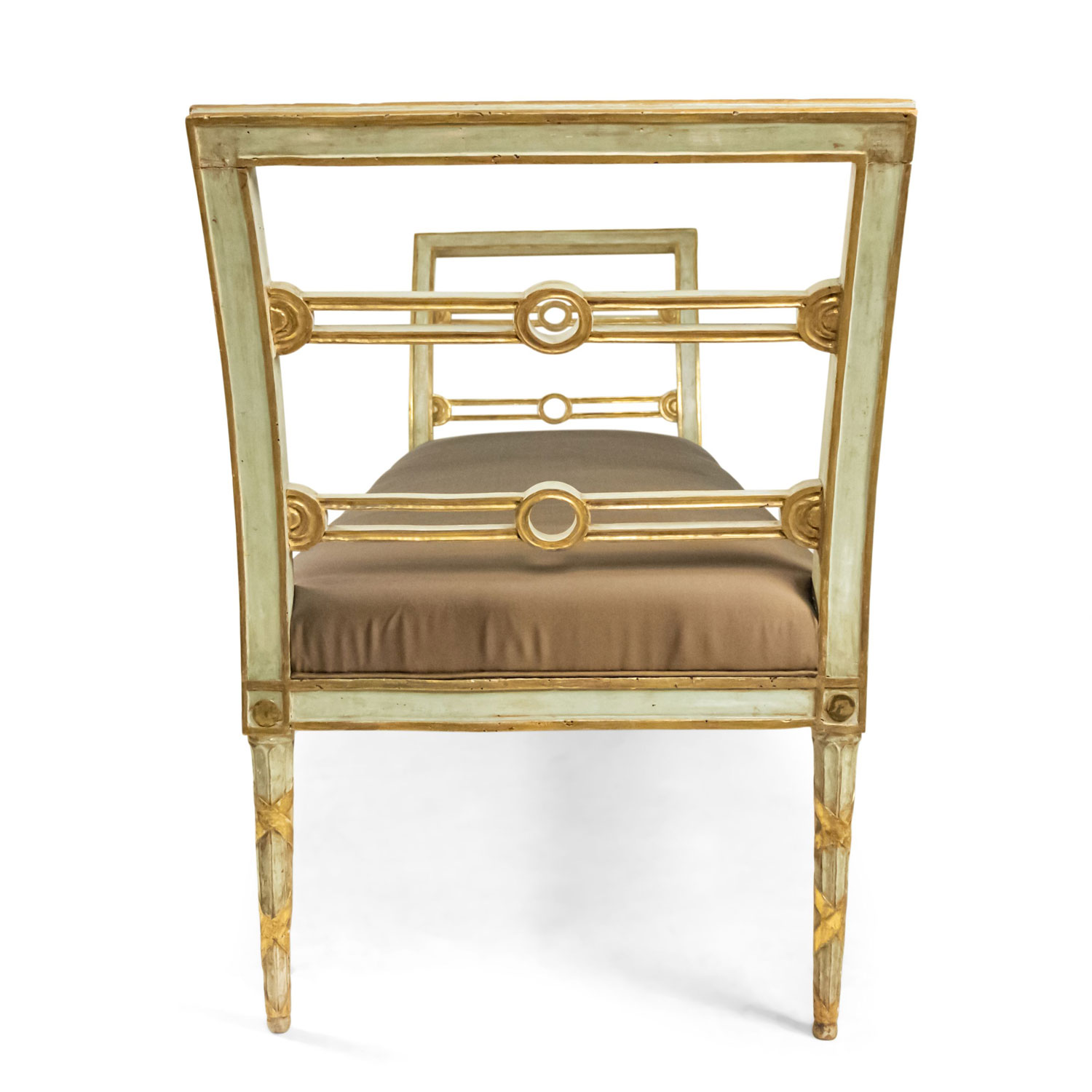 Italian Neo-classic (18th Century) celadon painted bench with gilt trim and open side arms with a raised inset set cushion and ribbon carved fluted legs.