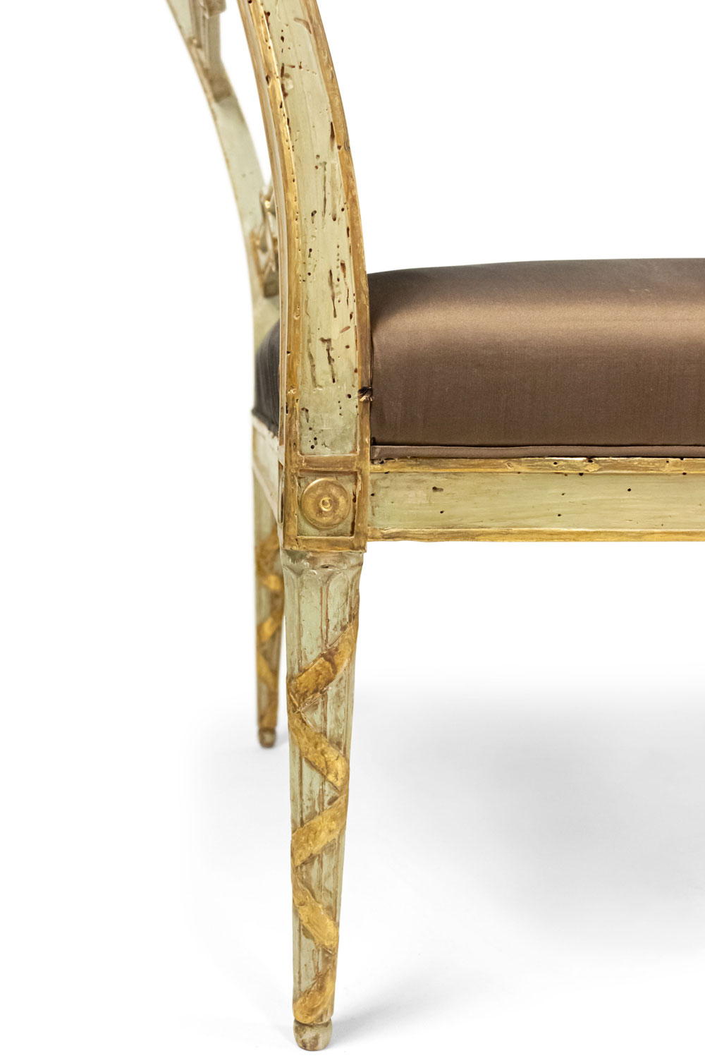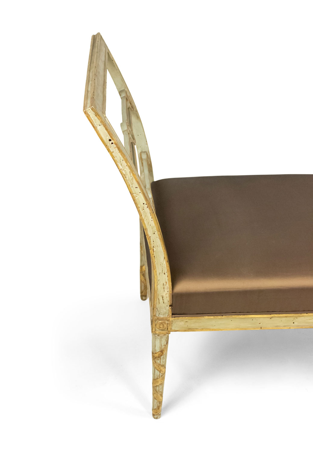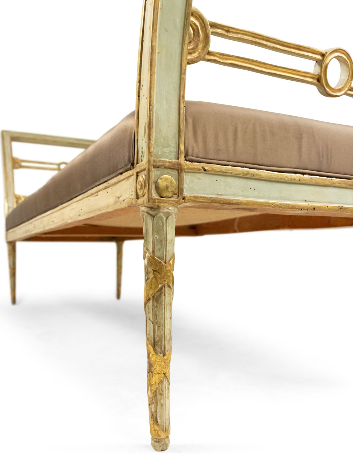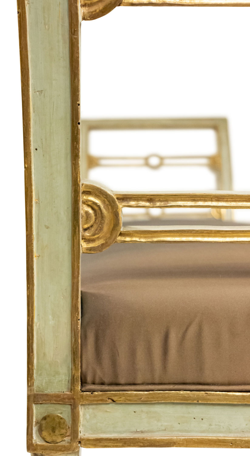 Italian Neo-classic (18th Century) celadon painted bench with gilt trim and open side arms with a raised inset set cushion and ribbon carved fluted legs..