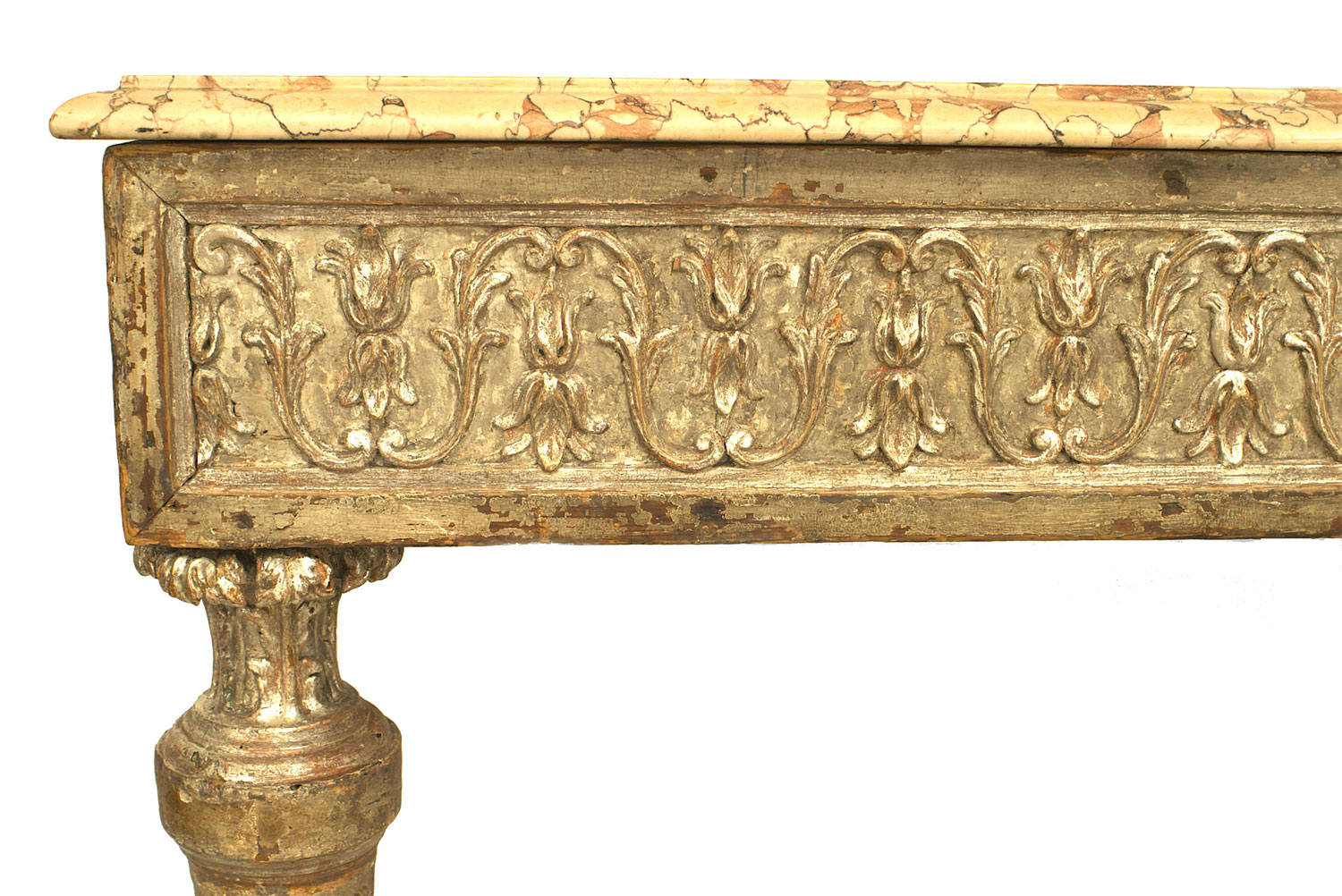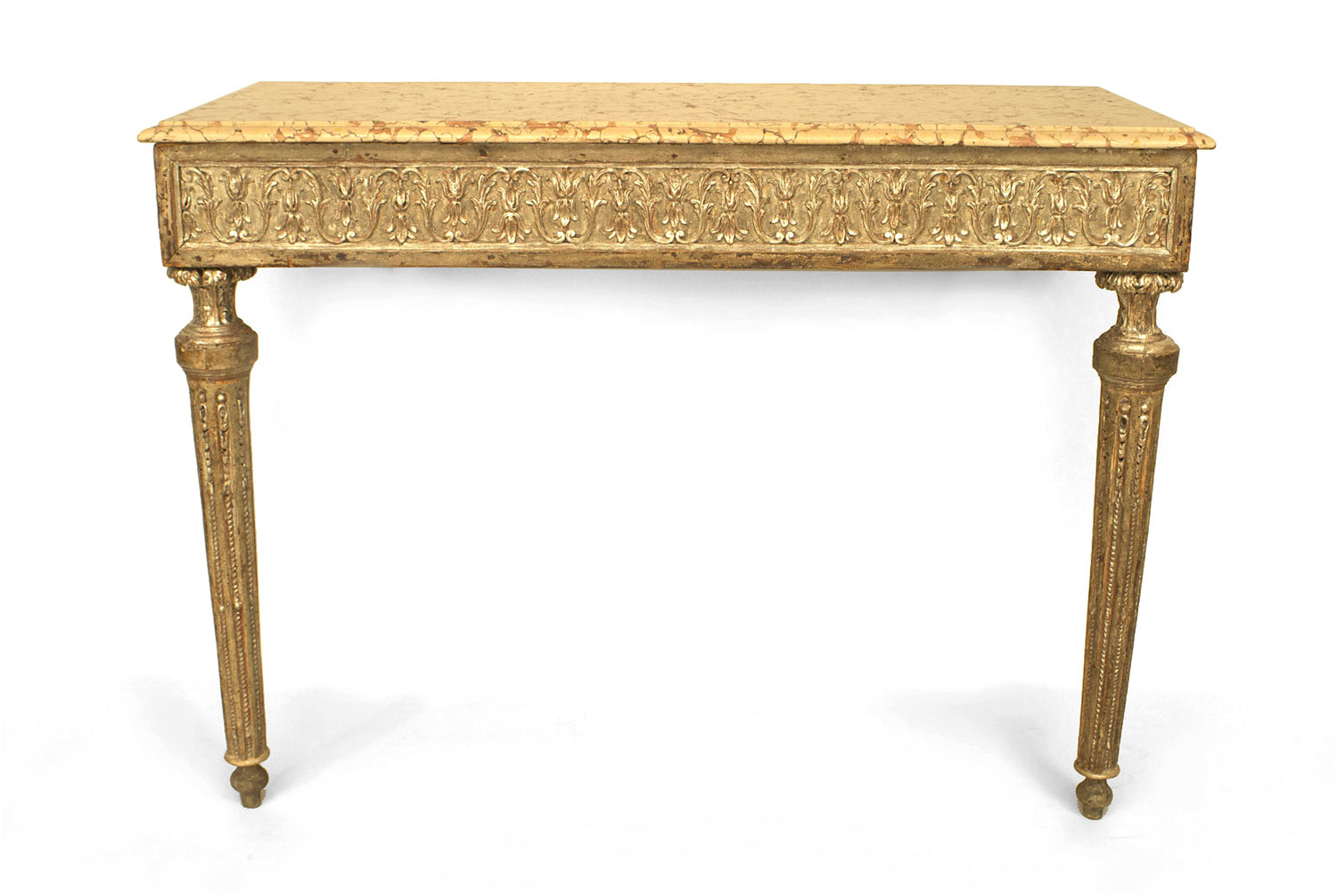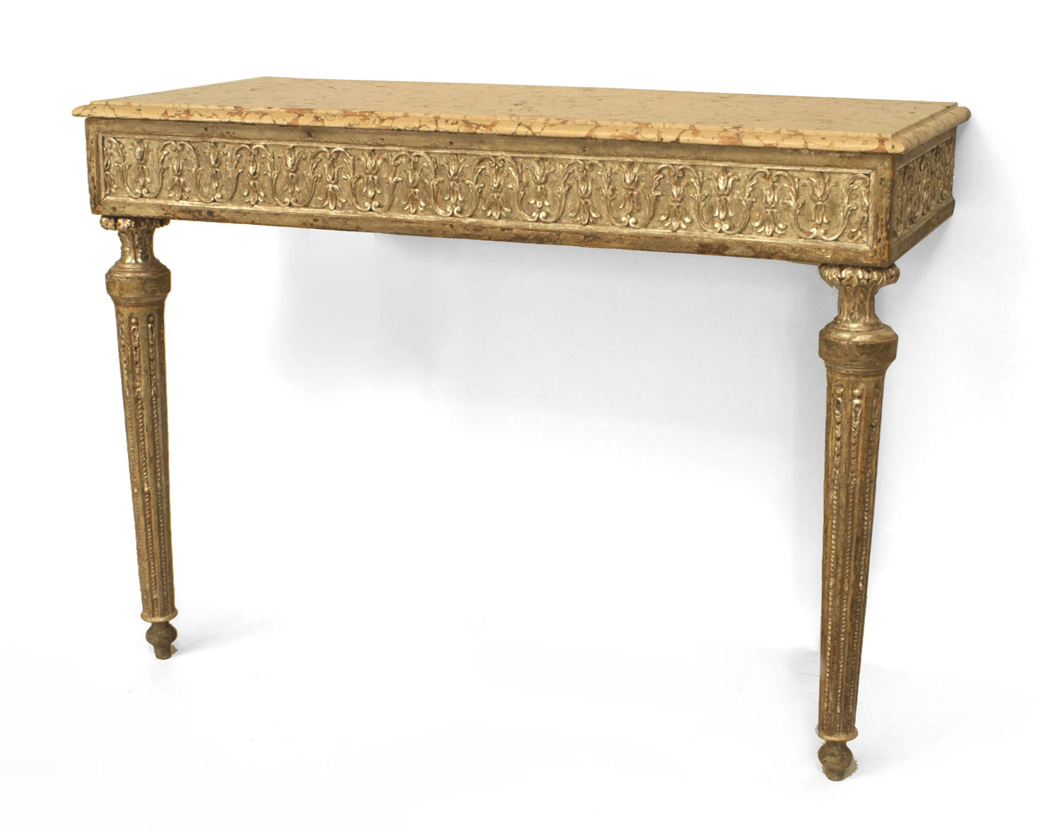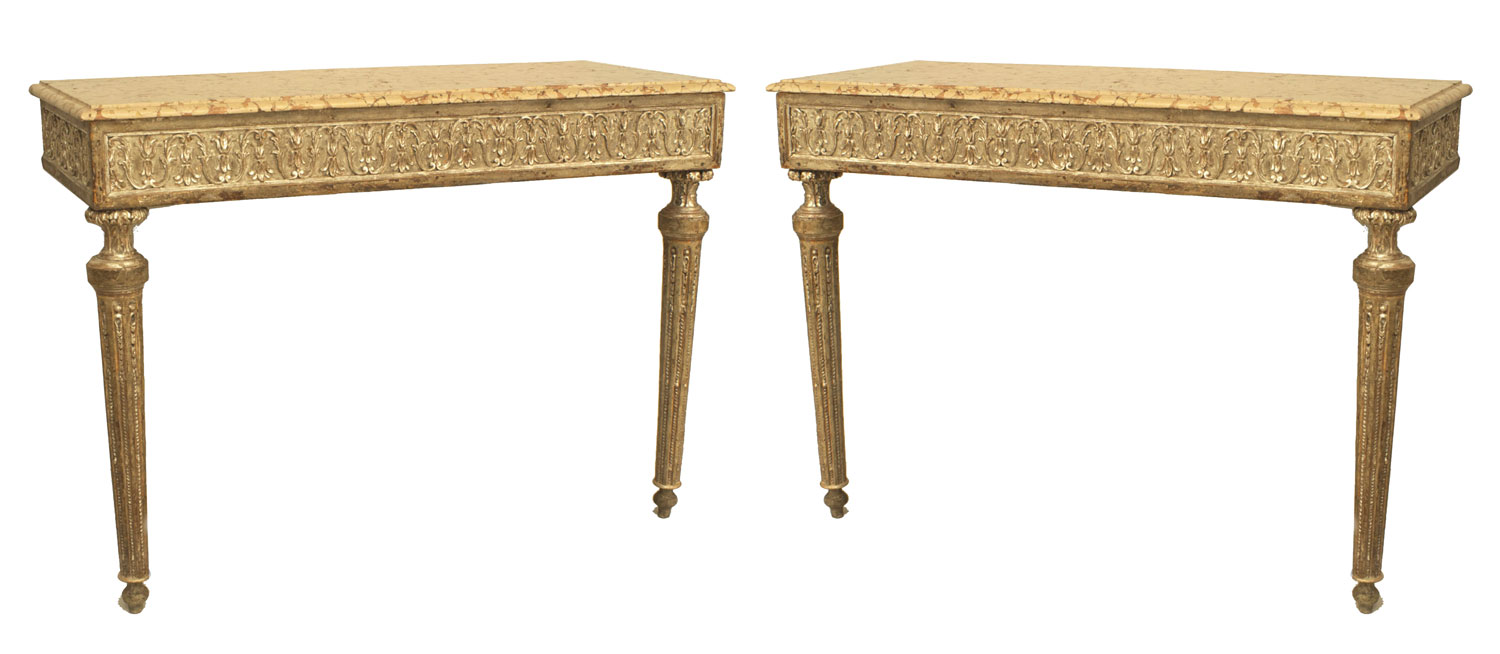 PAIR of Italian Neo-classic (18th Century) silver gilt bracket form console tables with 2 round fluted tapered front legs and a carved apron supporting rectangular marble tops. (PRICED AS PAIR).