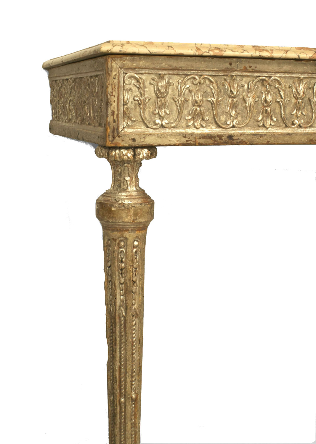 PAIR of Italian Neo-classic (18th Century) silver gilt bracket form console tables with 2 round fluted tapered front legs and a carved apron supporting rectangular marble tops. (PRICED AS PAIR)