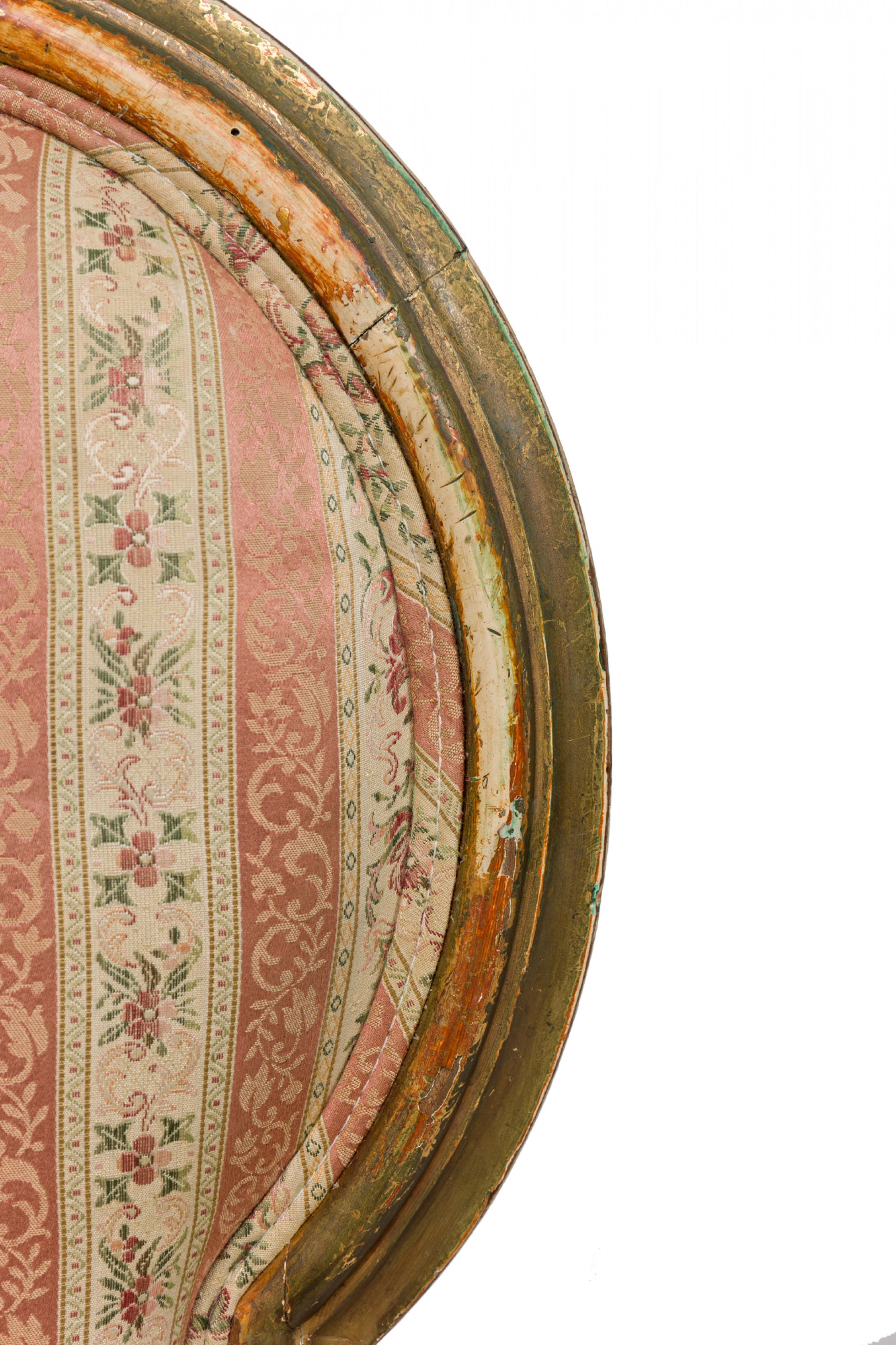 Italian Neo-Classic (18th Century) giltwood dining / side chair featuring a shaped oval back upper section having a carved foliate crest and ornate painted frame with decorative embellishments upholstered in a floral stripe pink and beige patterned fabric, standing on 4 fluted and shaped tapered legs