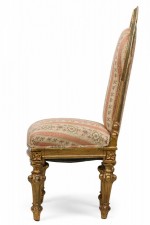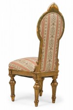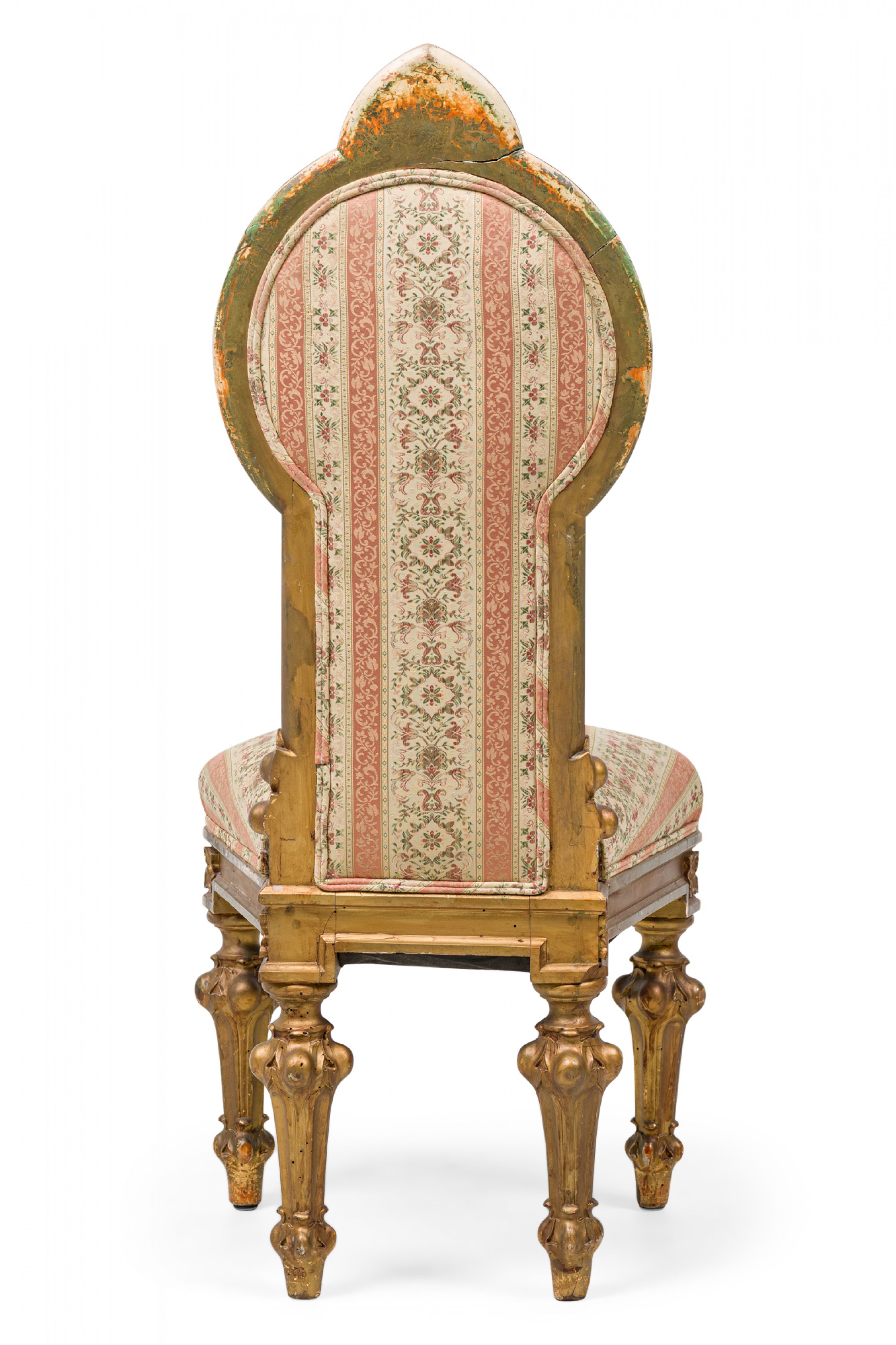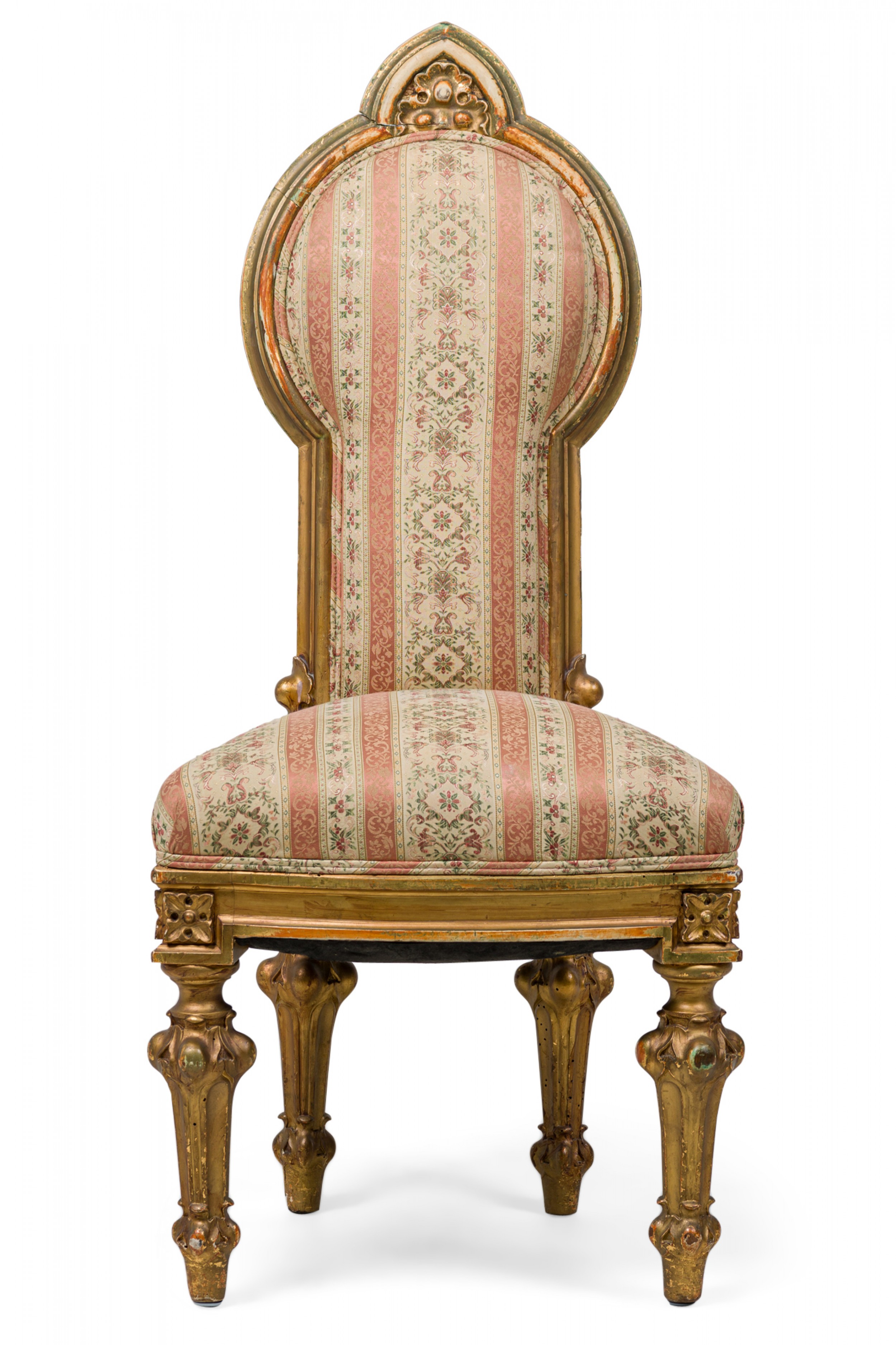 Italian Neo-Classic (18th Century) giltwood dining / side chair featuring a shaped oval back upper section having a carved foliate crest and ornate painted frame with decorative embellishments upholstered in a floral stripe pink and beige patterned fabric, standing on 4 fluted and shaped tapered legs.