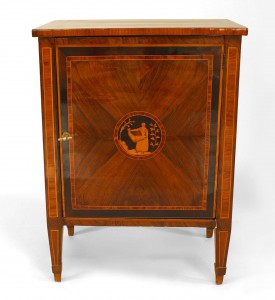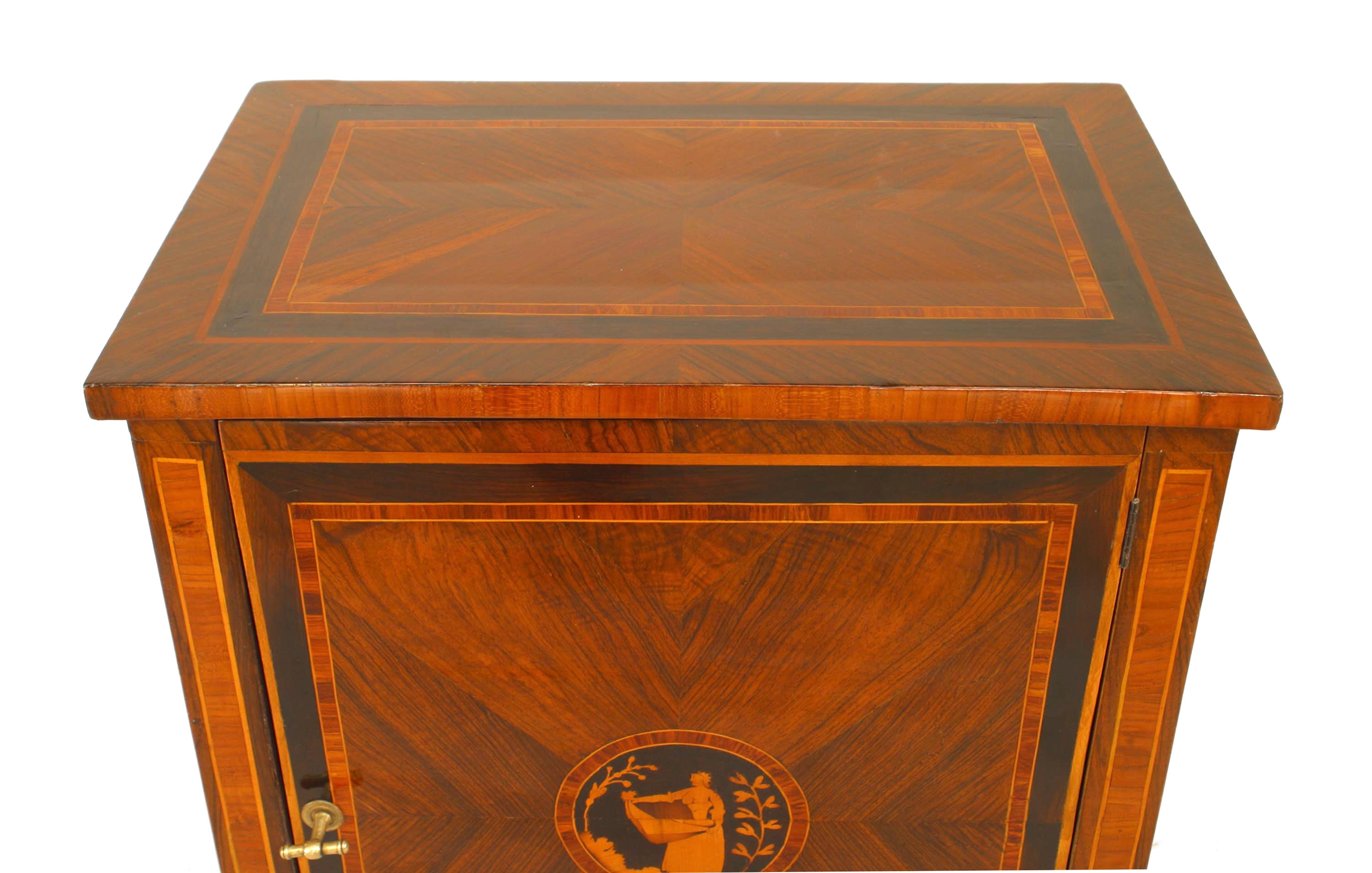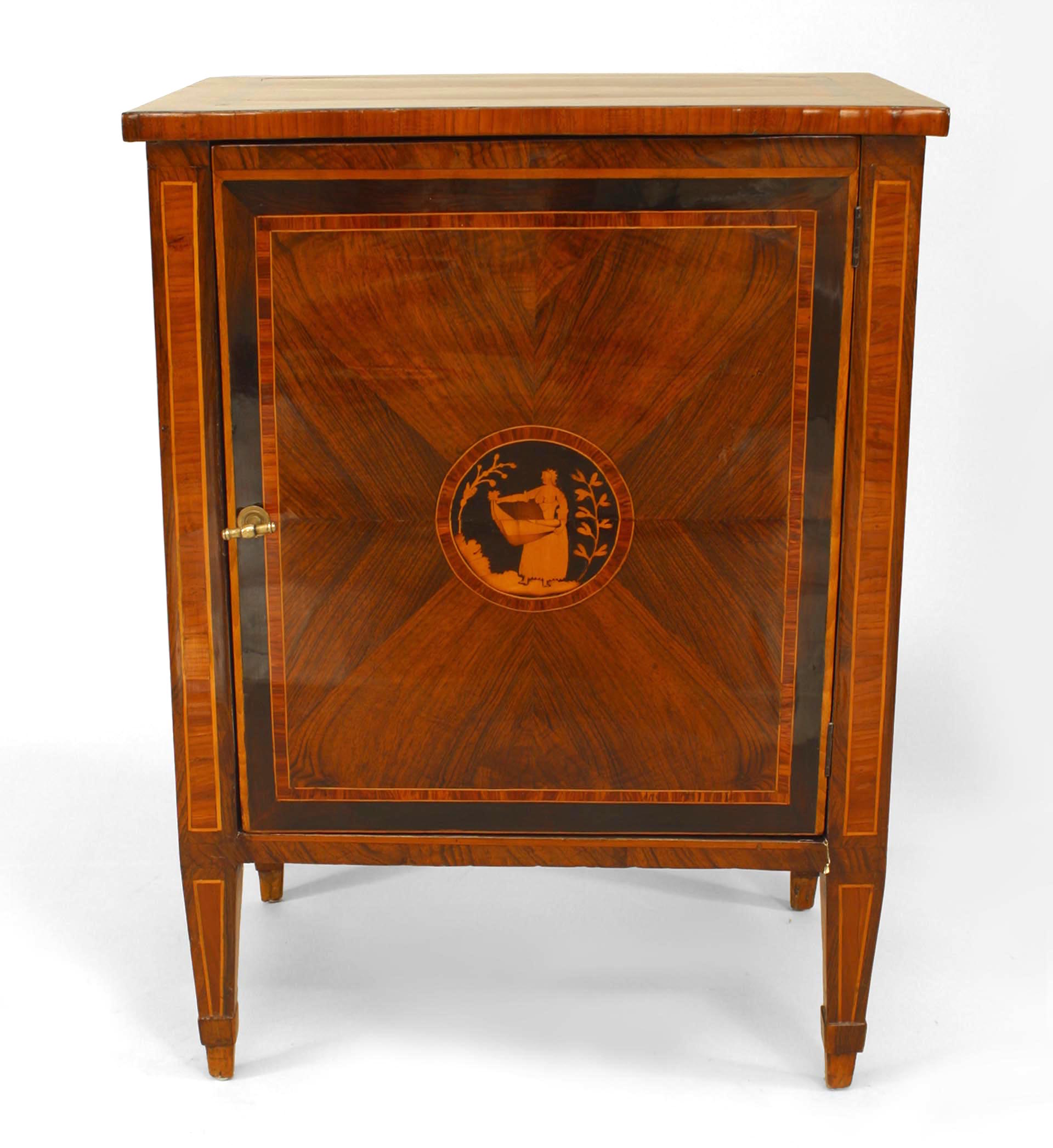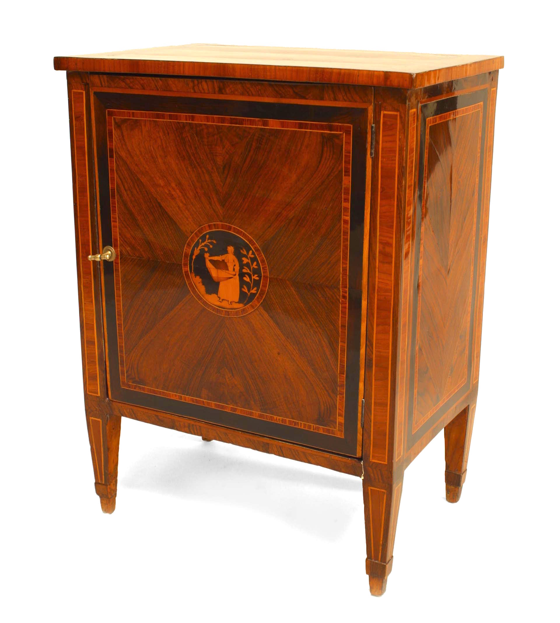 Italian Neo-classic (18/19th Century) kingwood veneer small commode with a single drawer and inlaid trim and medallion on door panel.