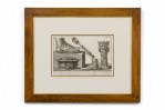 Italian Neo-classic style print of various military arms, armor, and objects matted in stained walnut frame (part of a set of 15; associated pieces: 040101A-040101O)