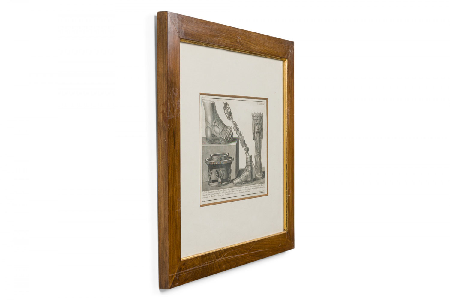 Italian Neo-classic style print of various military arms, armor, and objects matted in stained walnut frame (part of a set of 15; associated pieces: 040101A-040101O).