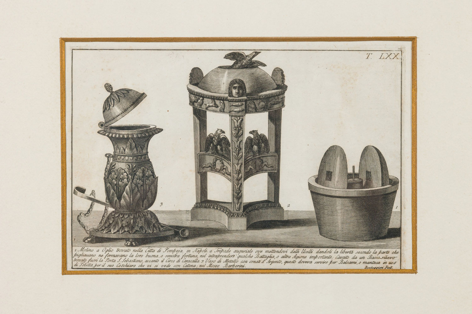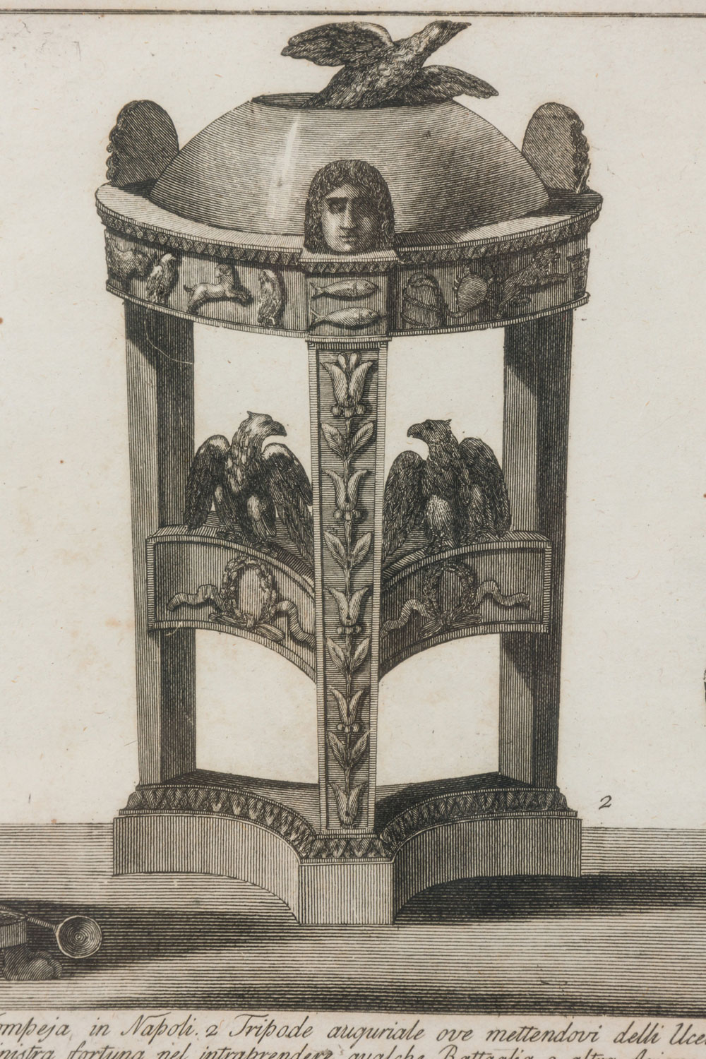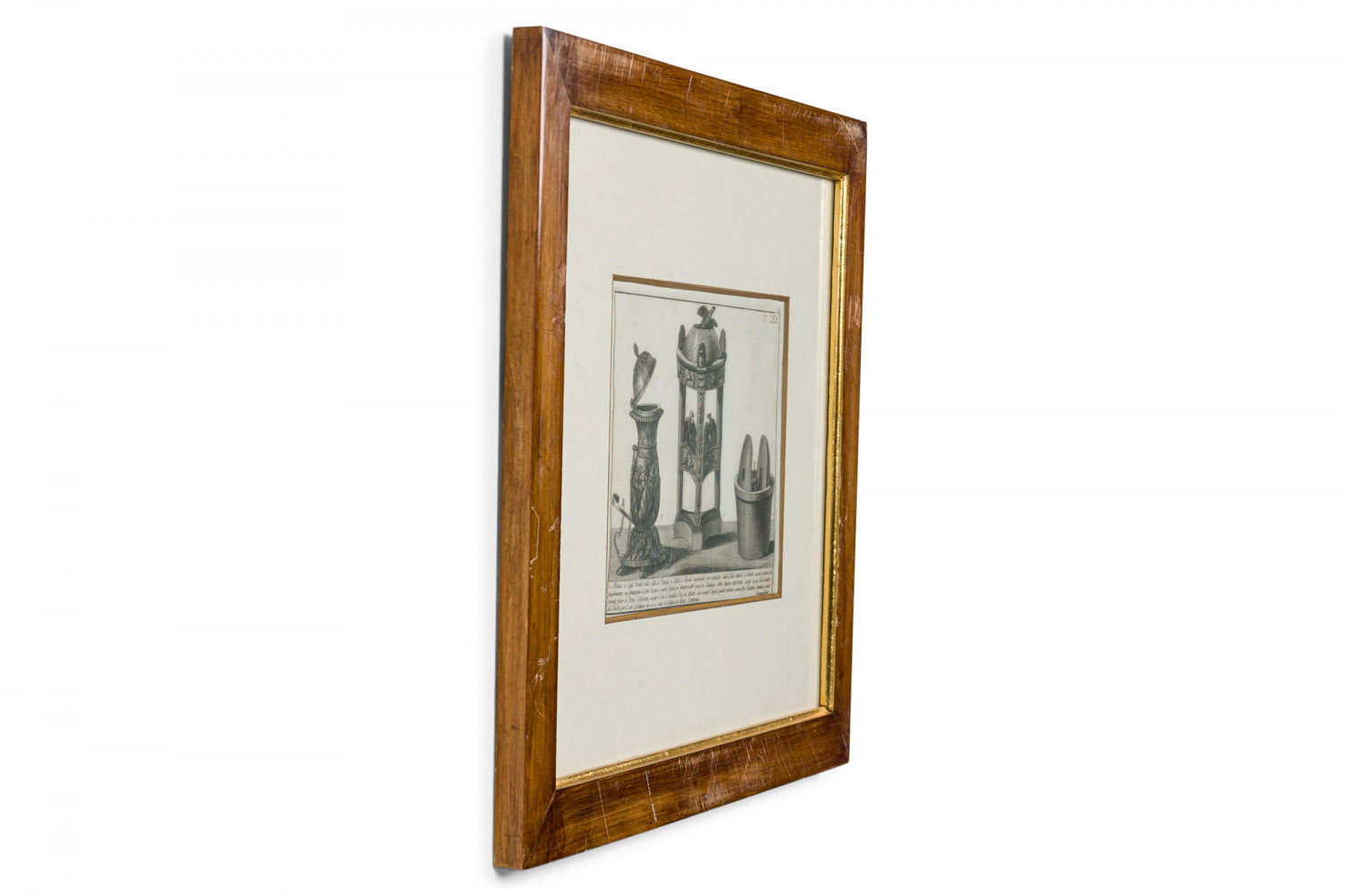 Italian Neo-classic style print of various military arms, armor, and objects matted in stained walnut frame (part of a set of 15; associated pieces: 040101A-040101O).