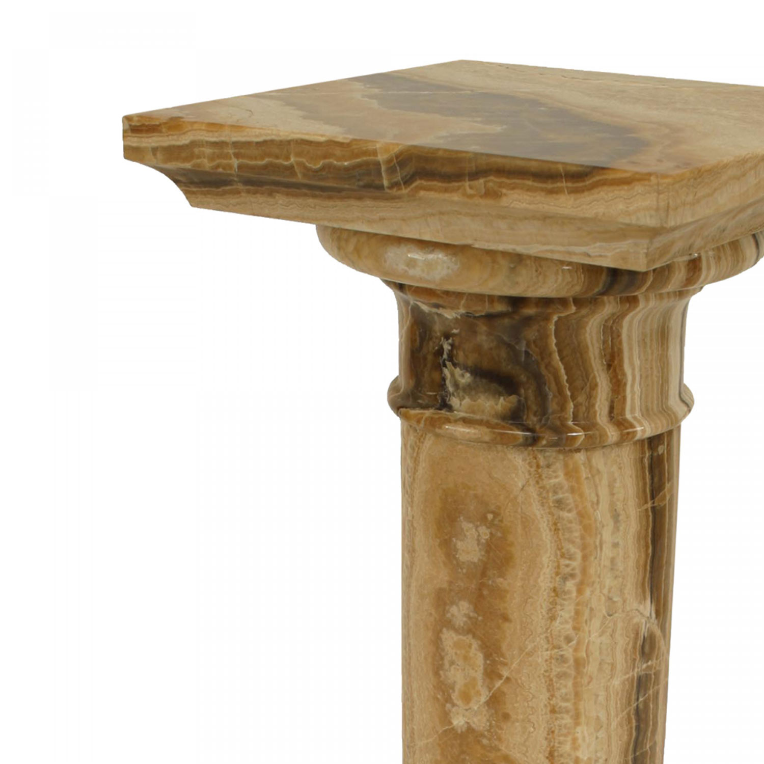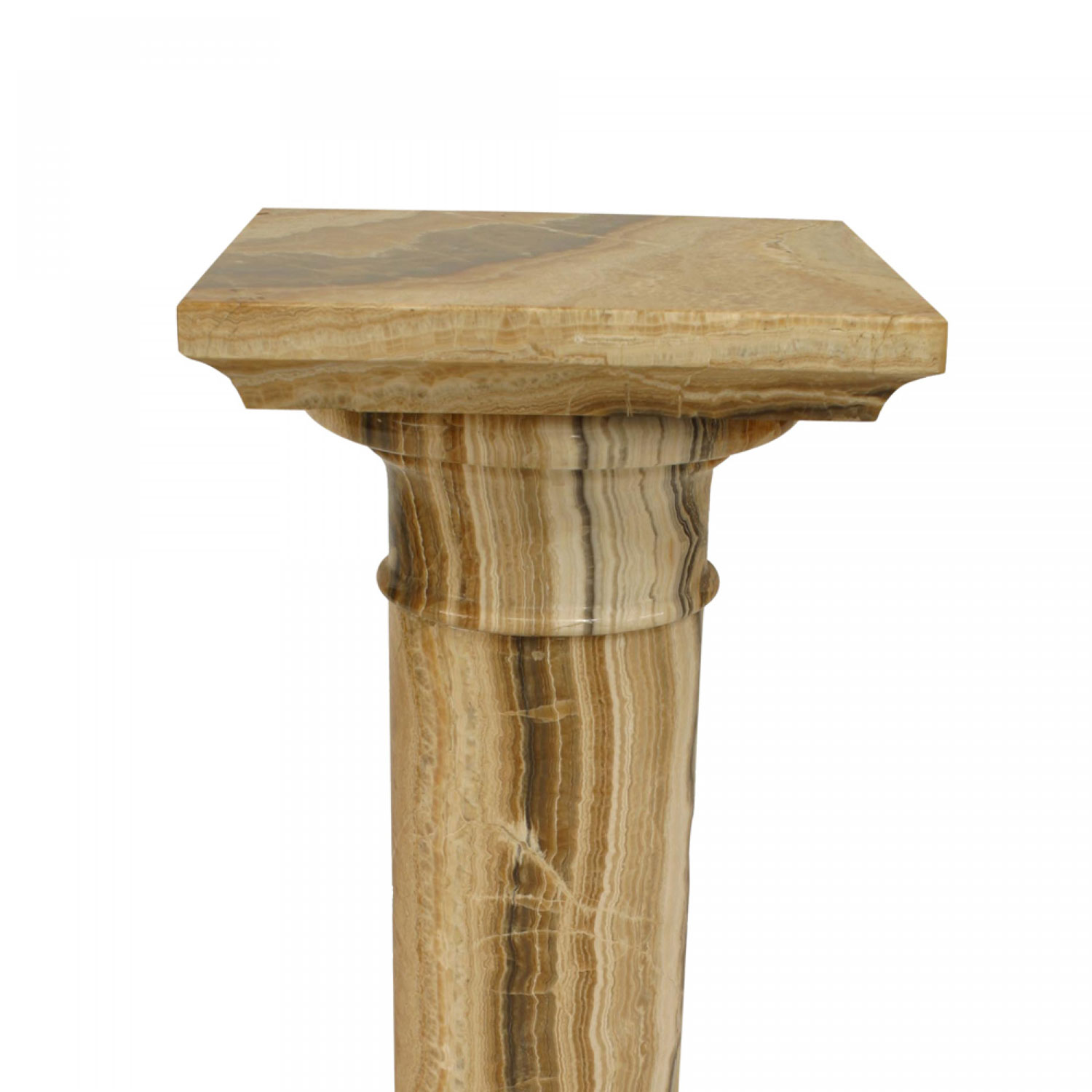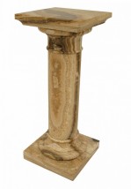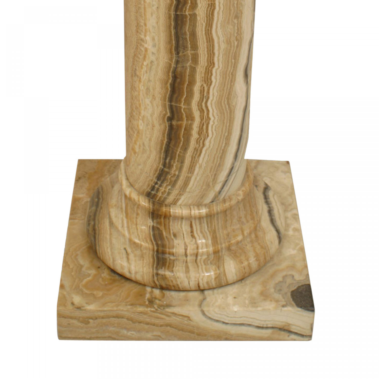 Italian Neo-classic style (19th/20th Cent) beige and brown veining marble low pedestal with a cylindrical form centered between a square top and base.