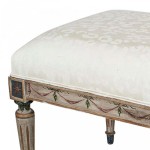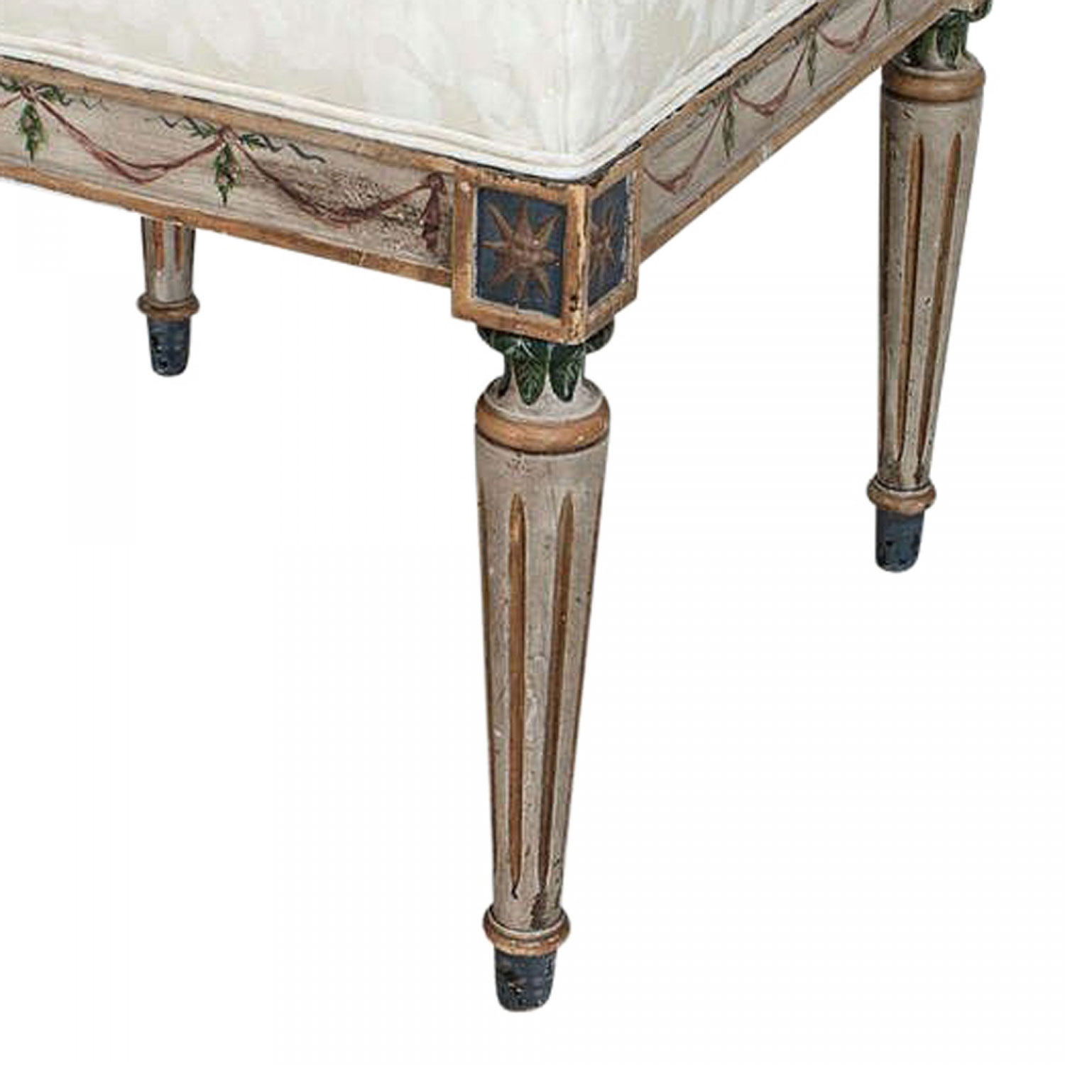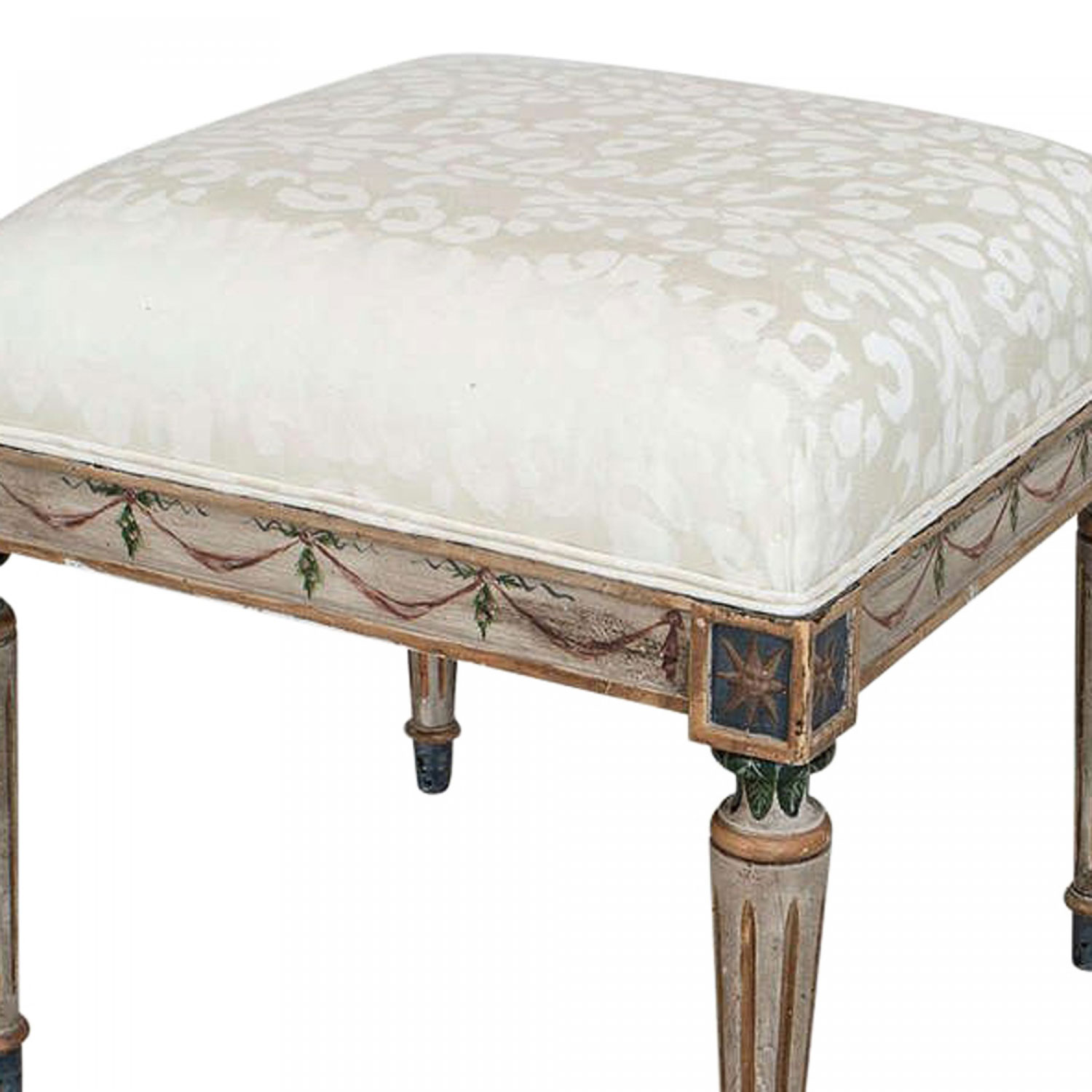 Italian Neo-classic style (19th Century) cream painted square bench with swag and festoon decoration supported on tapered fluted and gilt trim legs..