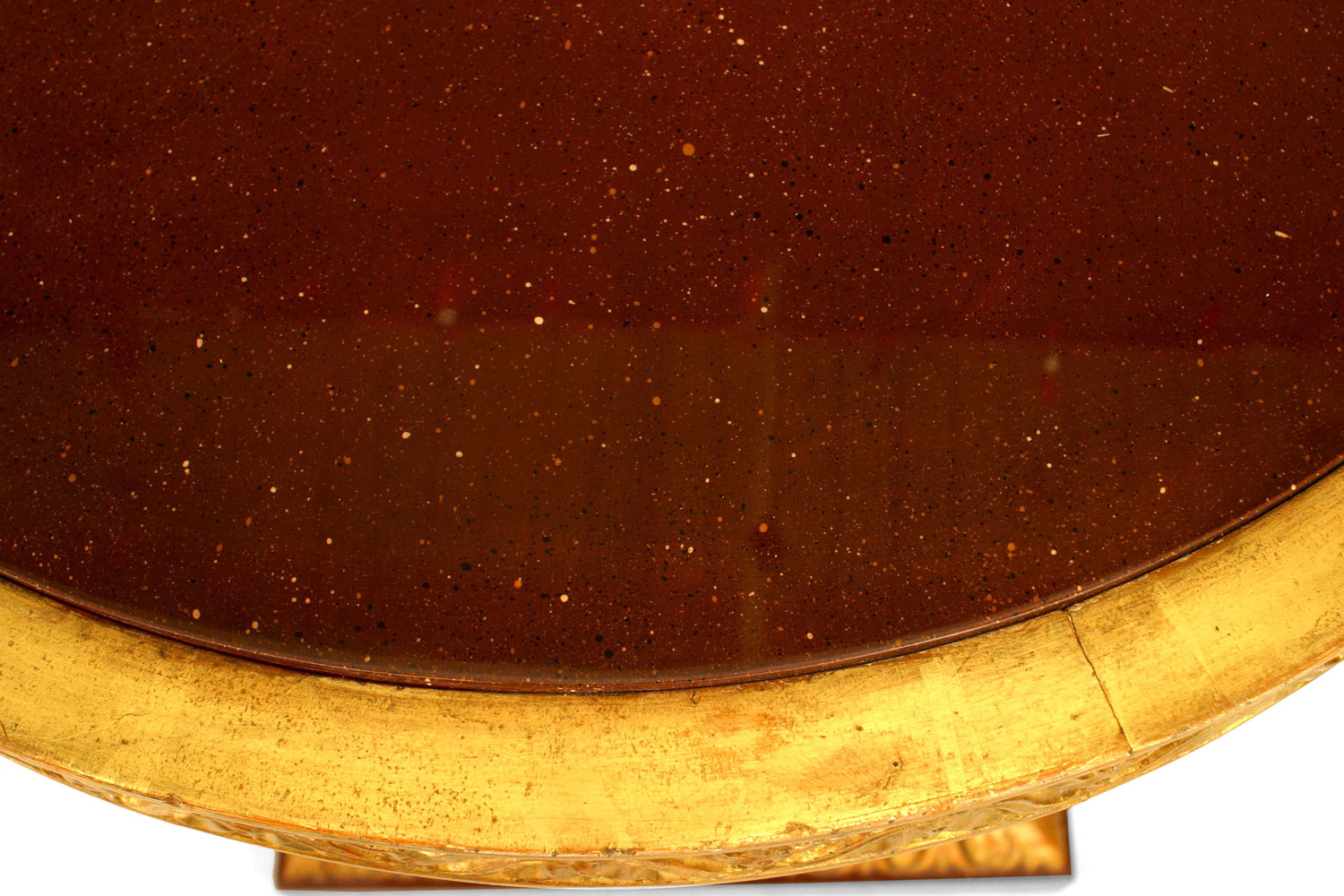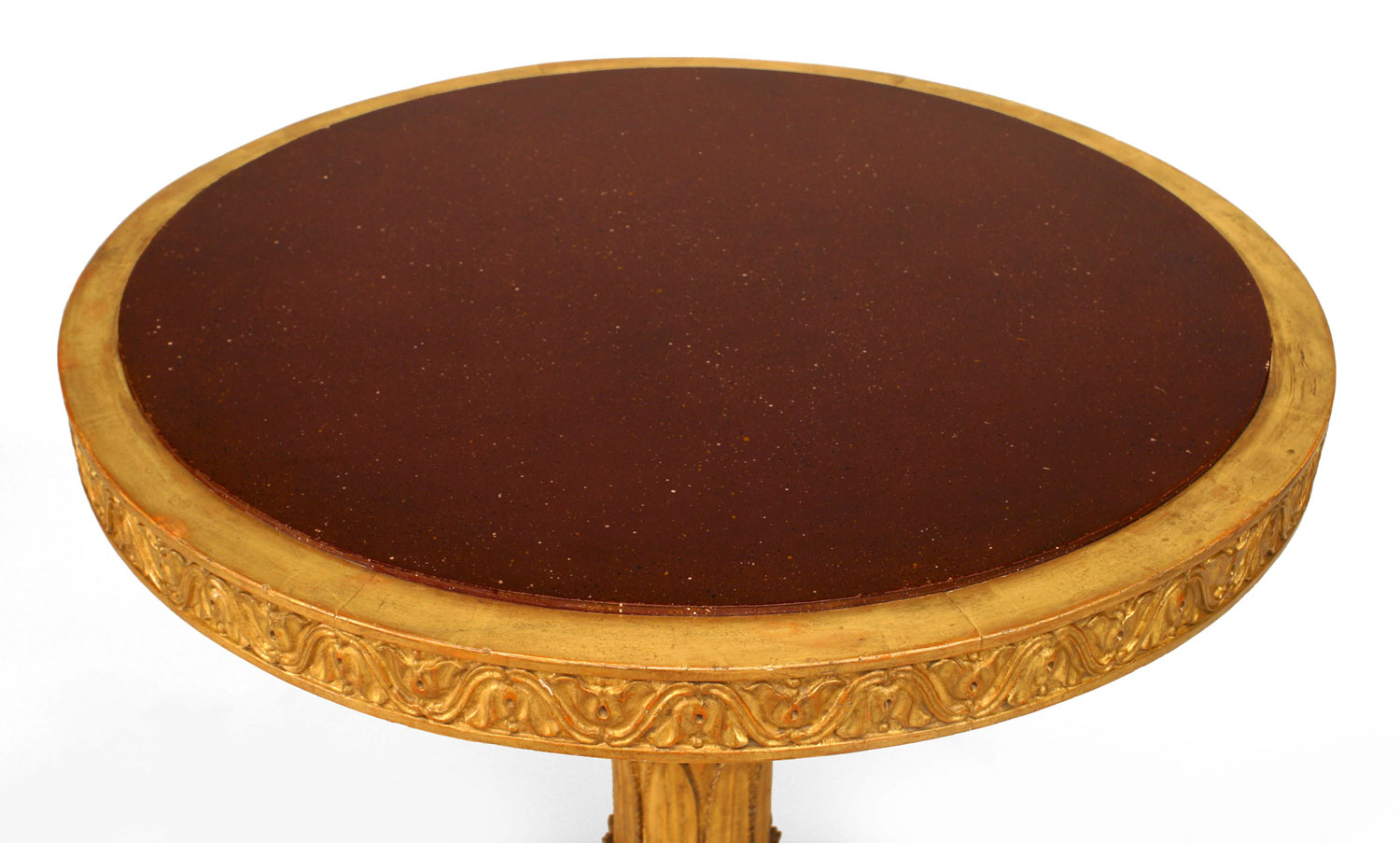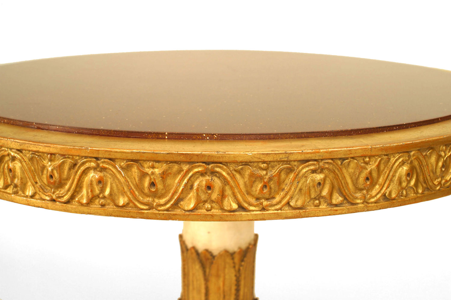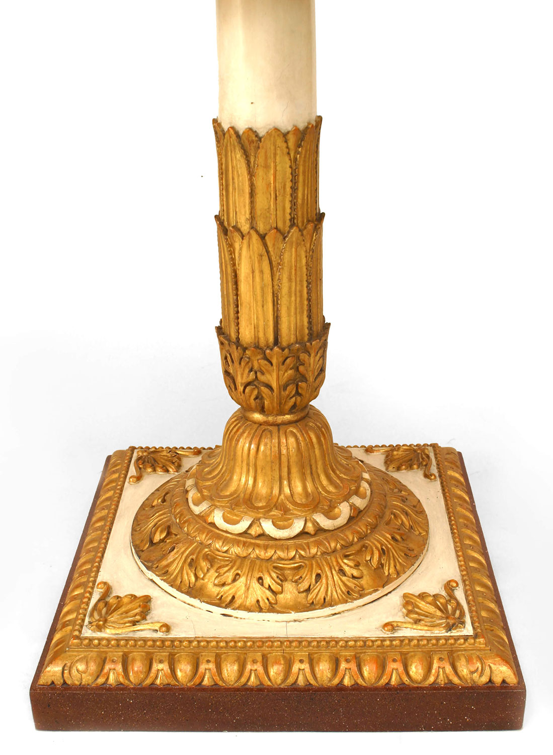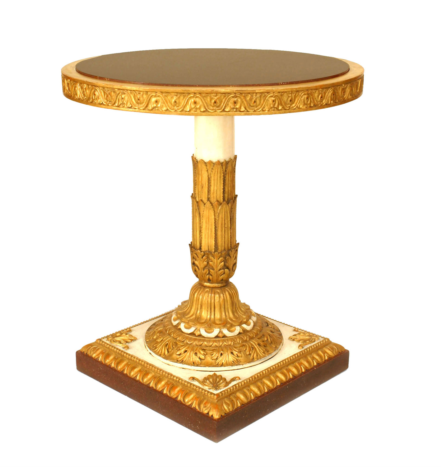 PAIR of Italian Neo-classic (19th Century) white painted and gilt carved pedestal end tables with a round inset faux porphyry top and trimmed edge of a square base (PRICED AS PAIR)