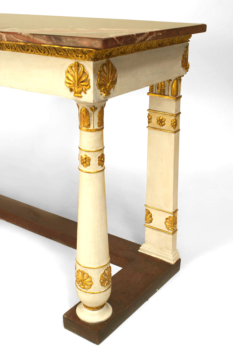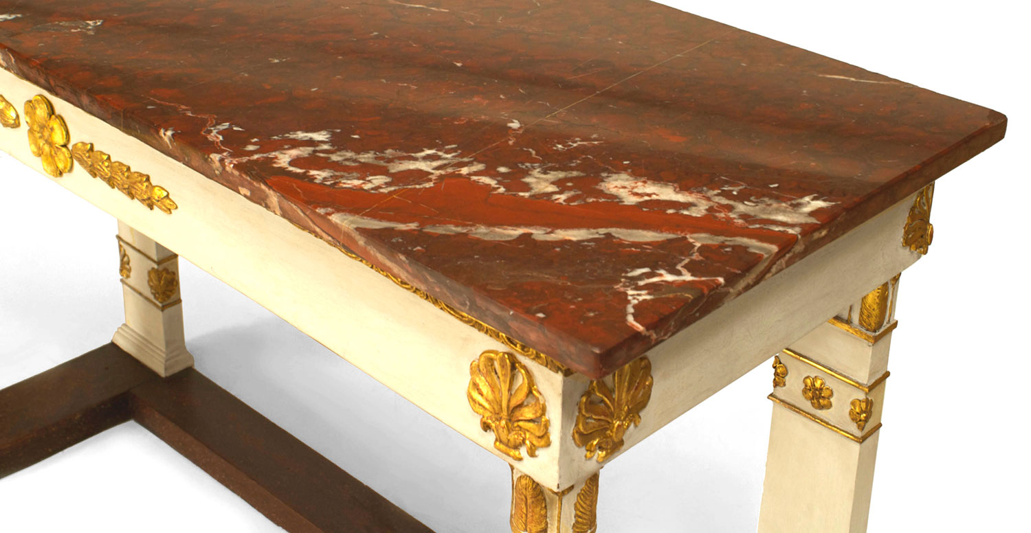 Italian Neo-classic (18/19th Century) white painted and gilt carved trim console table with a faux porphyry painted platform base and a rouge marble top..