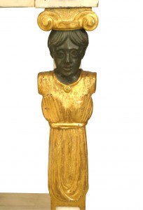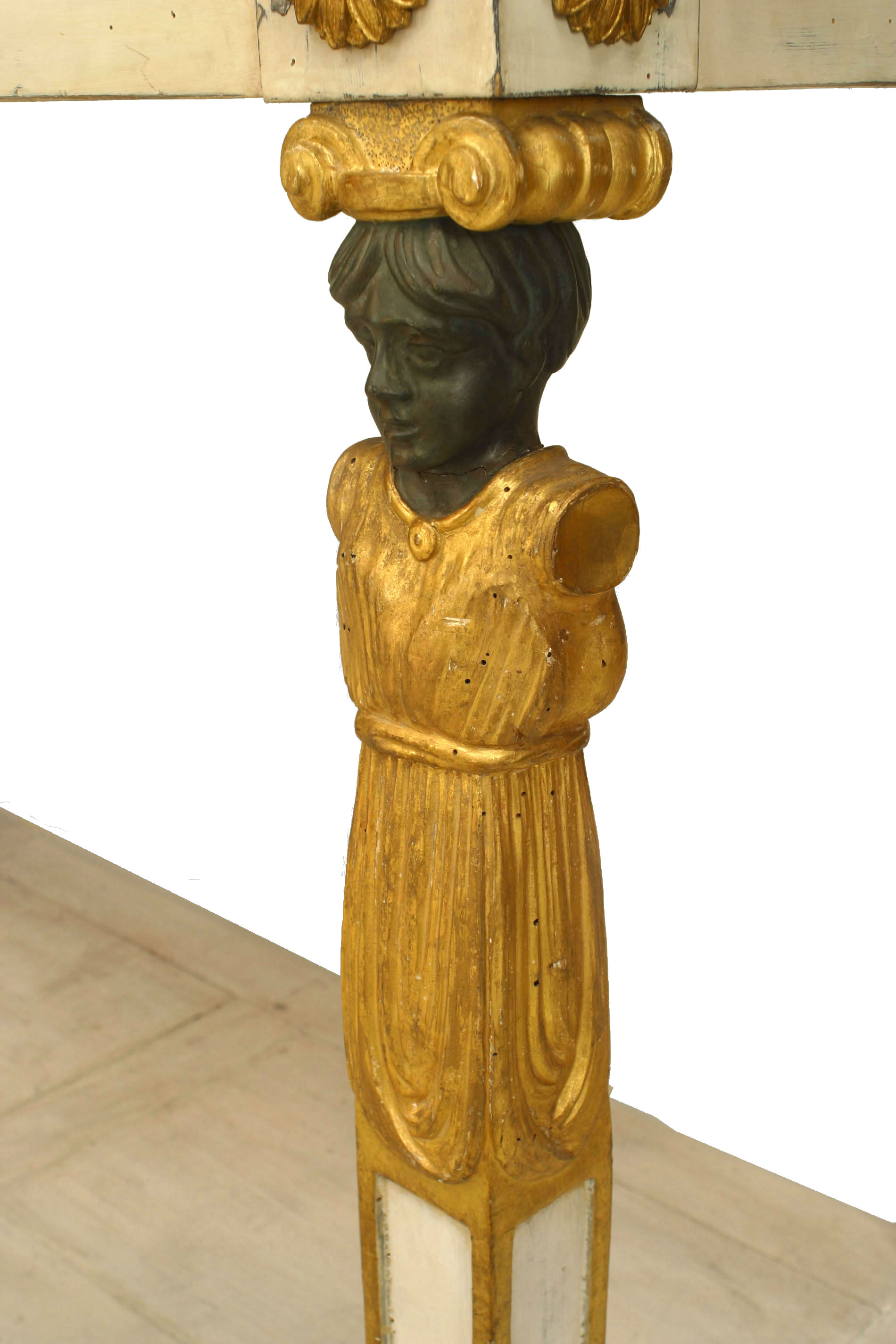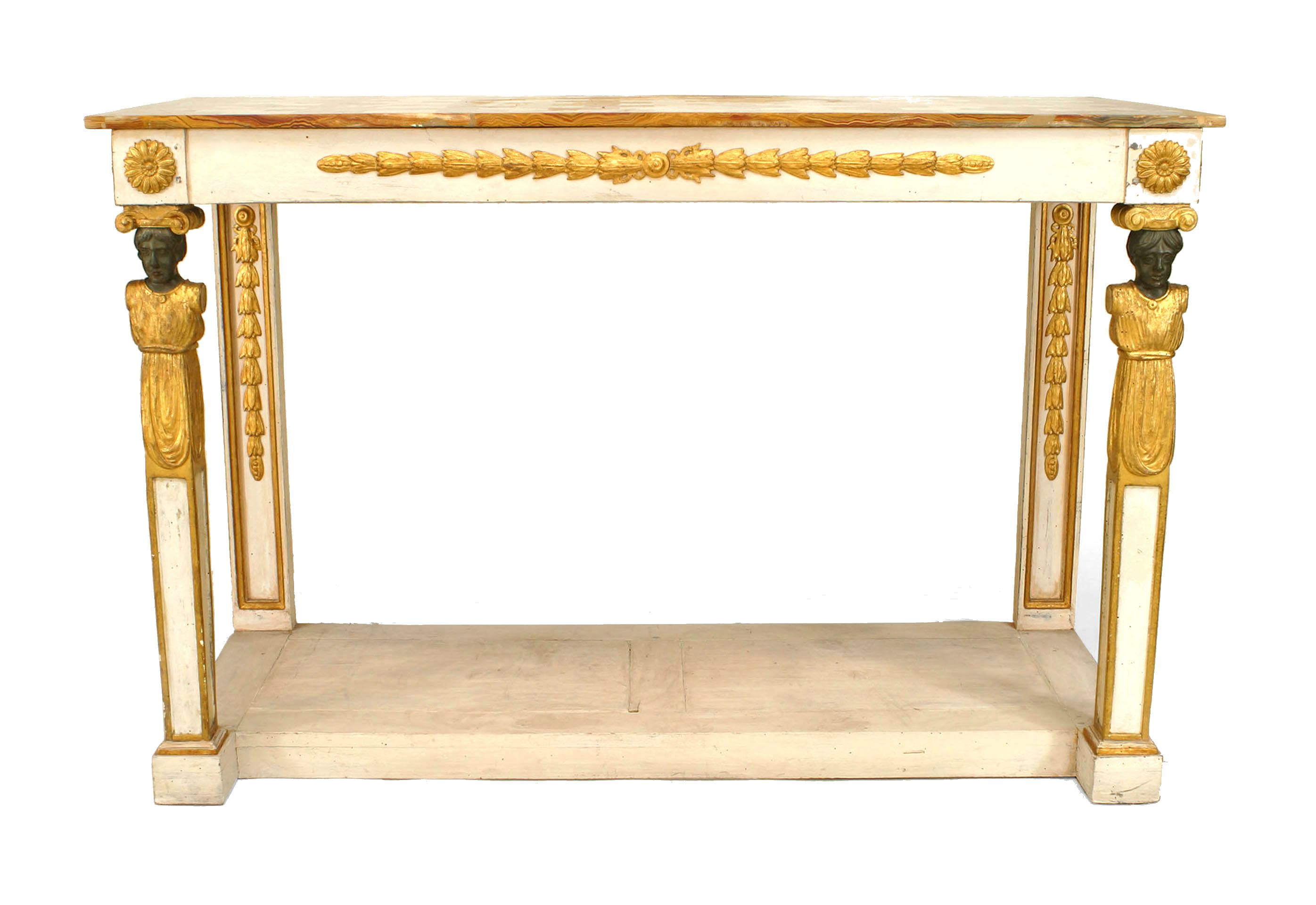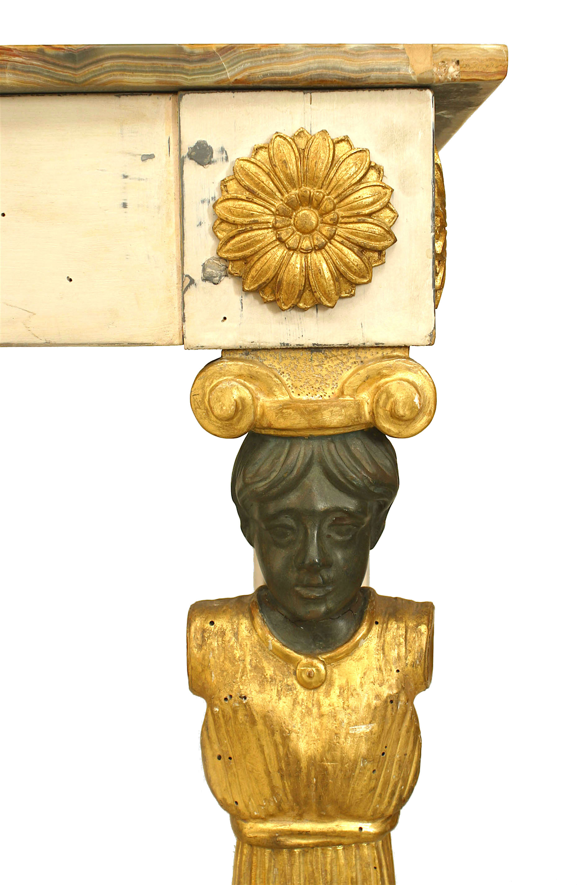 PAIR of Italian Neo-classic (18/19th Century) parcel gilt & white painted console tables with specimen onyx tops above male pilasters on a platform base. (Estate of Robert Metzger) (PRICED AS PAIR)