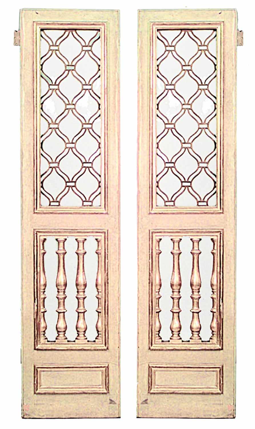 PAIR of Italian Neo-classic style (20th Century) parcel gilt & cream painted doors with leaded glass inset panels above lower balustrade grilled panels (PRICED AS PAIR)..