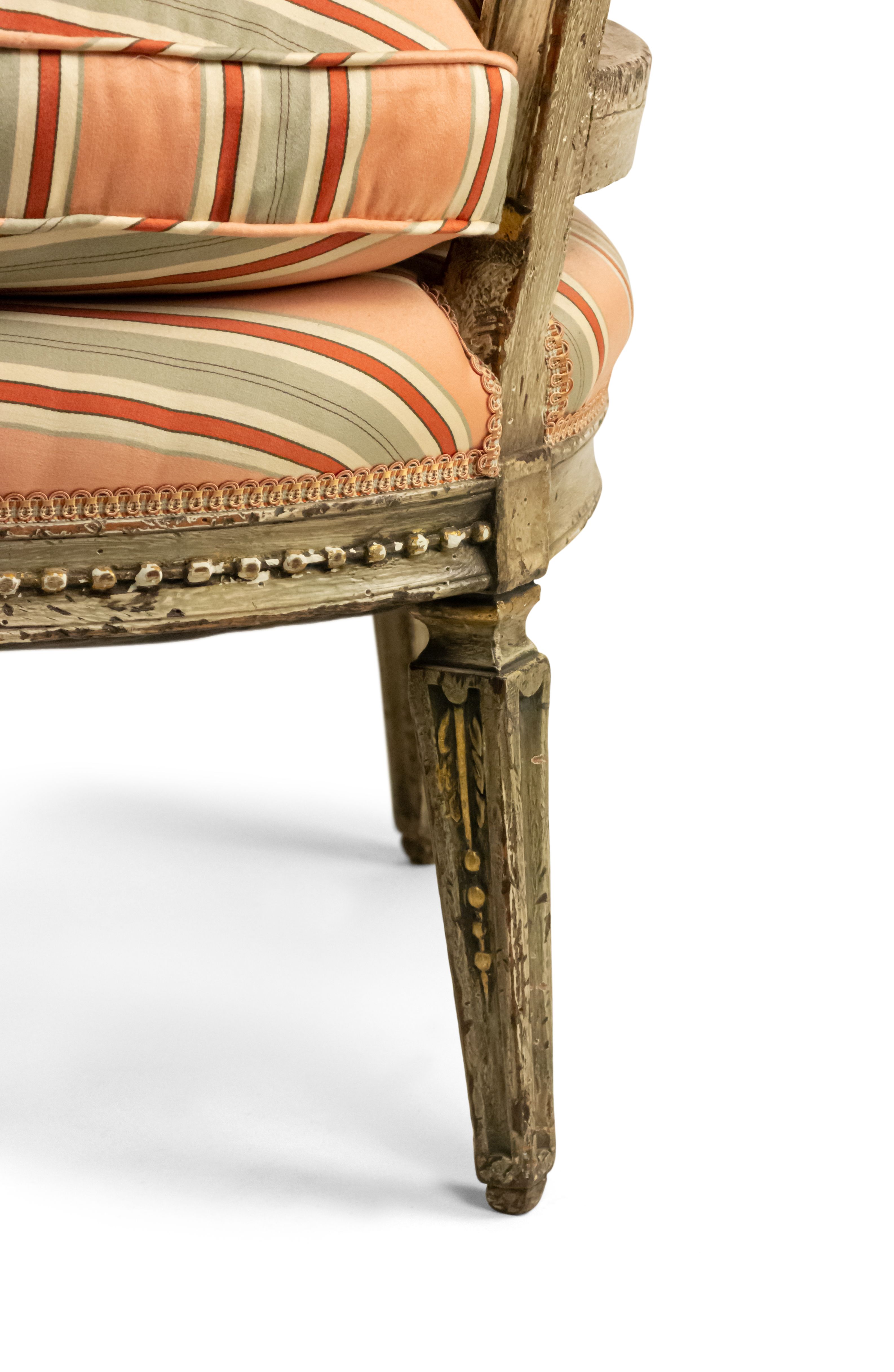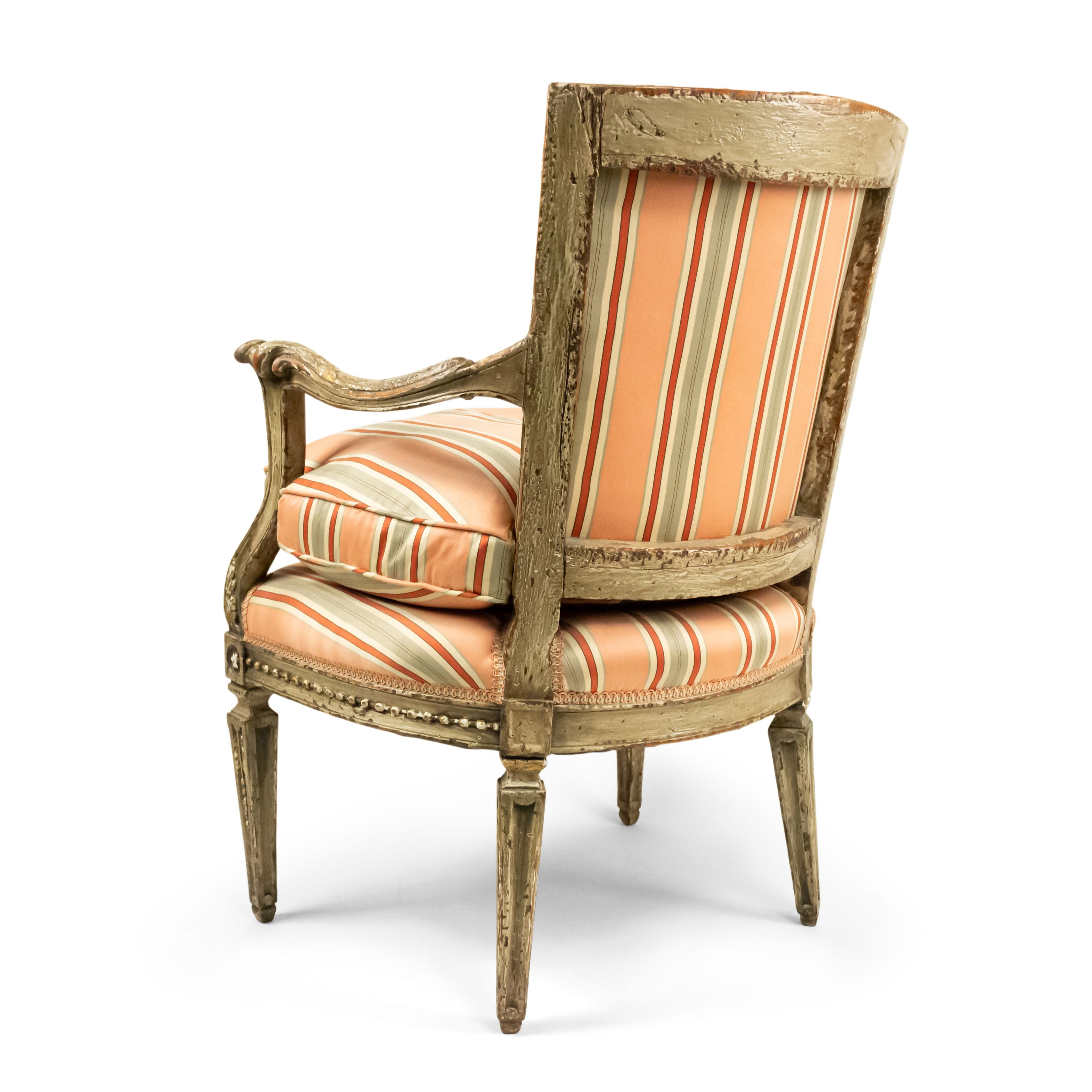Italian Neo-classic (18th Cent) Piedmontese grey painted open arm chair with scroll carved arms and square tapered legs upholstered in pink stripe damask