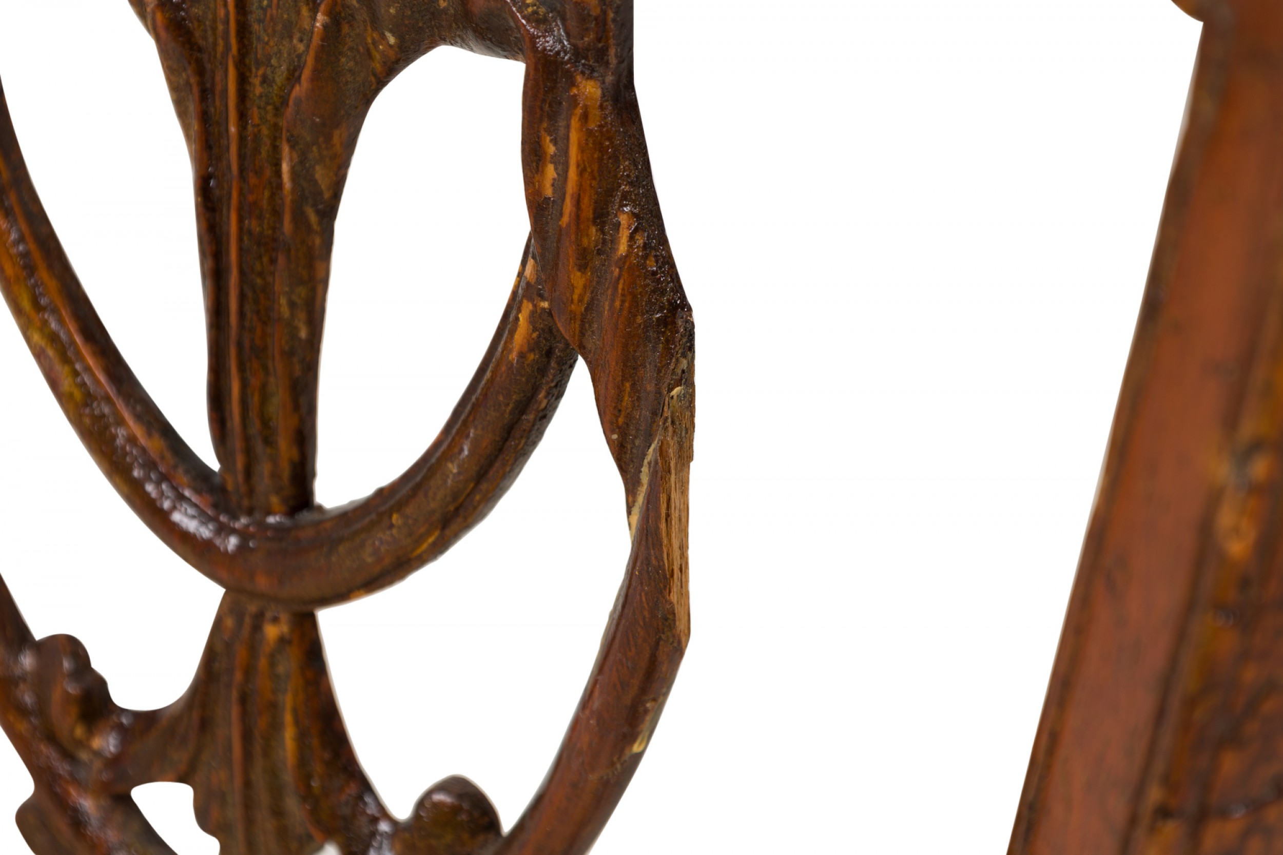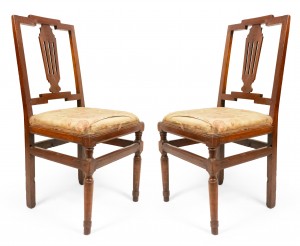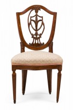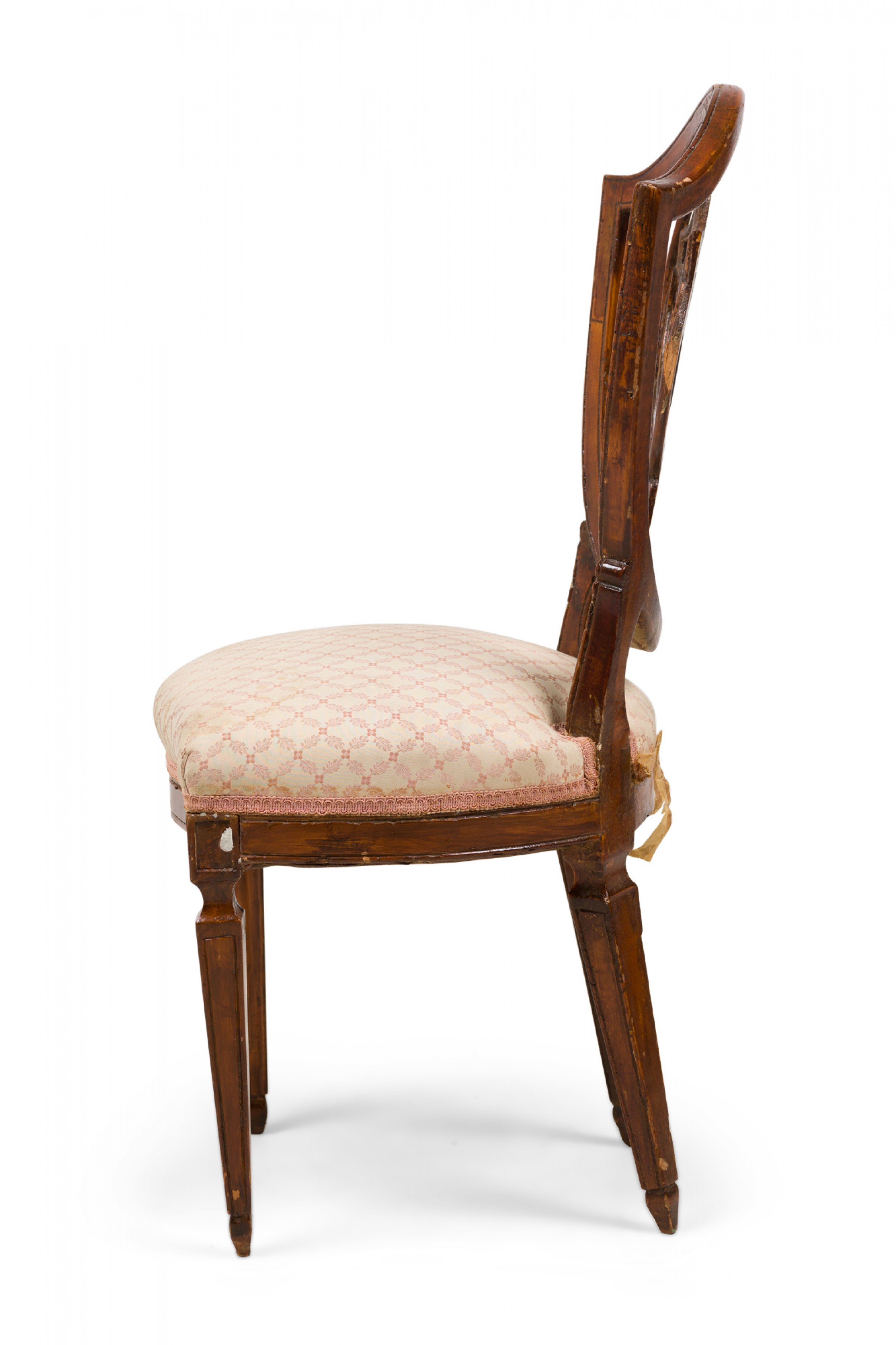 Italian Neo-Classic side chair with an openwork shield form back, carved decorative splat, padded seat upholstered in floral patterned beige fabric with embroidered trim, and 4 shaped legs with incised highlights tapering down to spade feet.