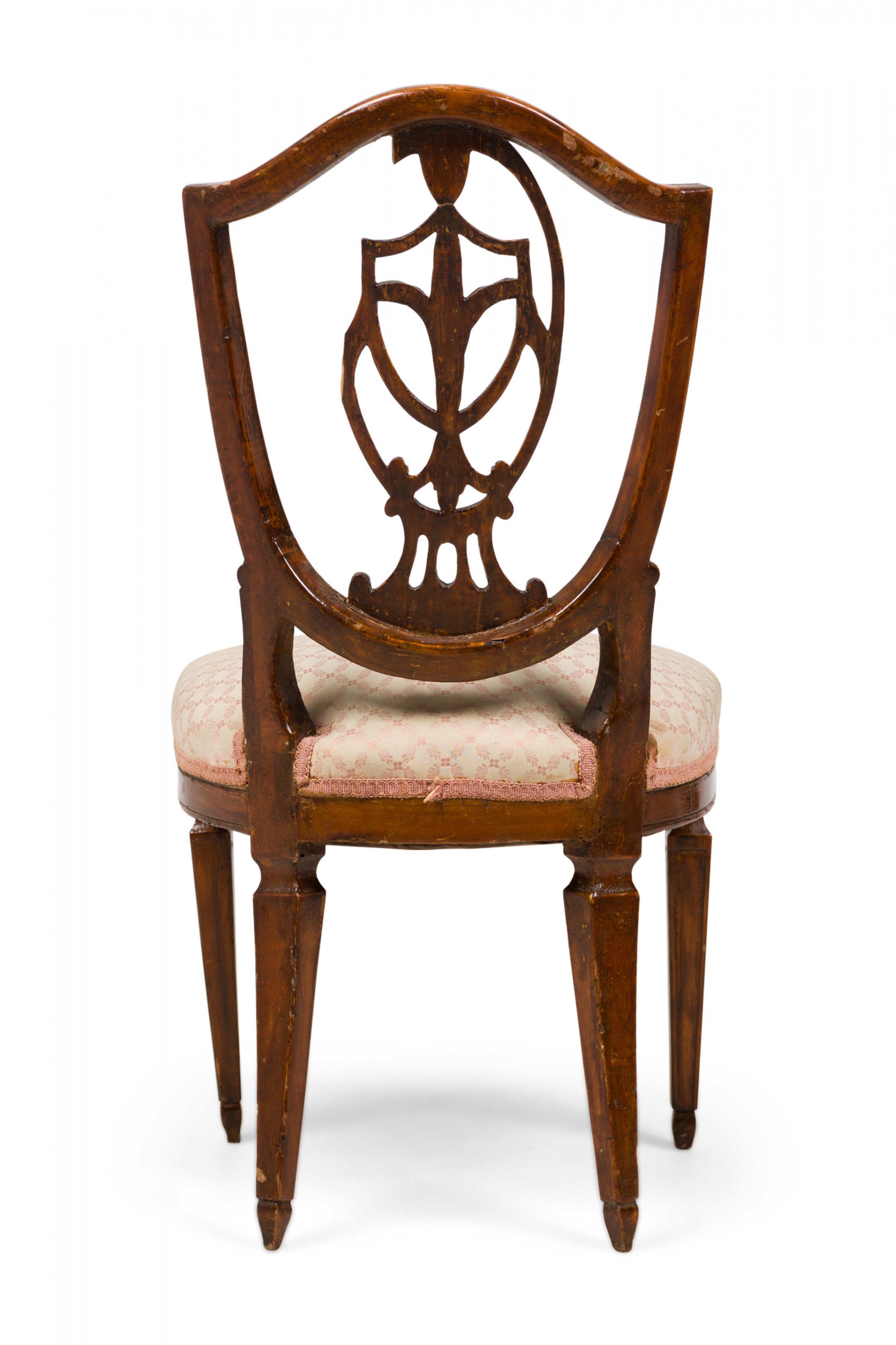 Italian Neo-Classic side chair with an openwork shield form back, carved decorative splat, padded seat upholstered in floral patterned beige fabric with embroidered trim, and 4 shaped legs with incised highlights tapering down to spade feet..