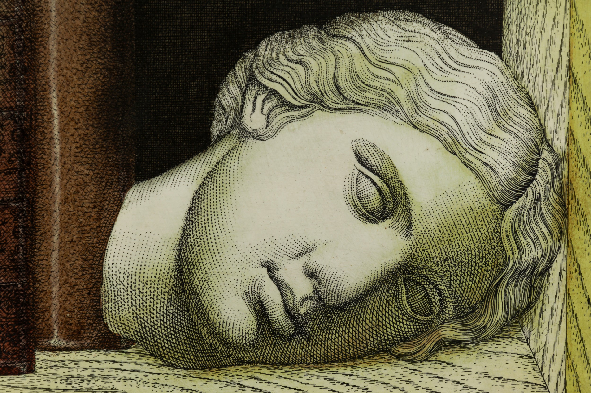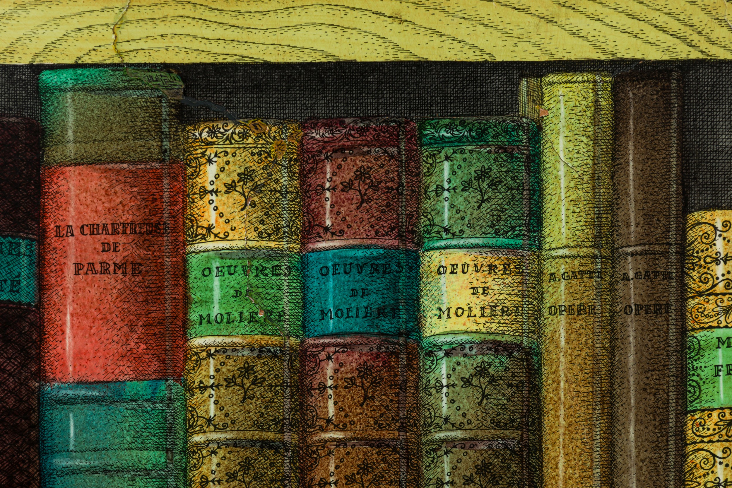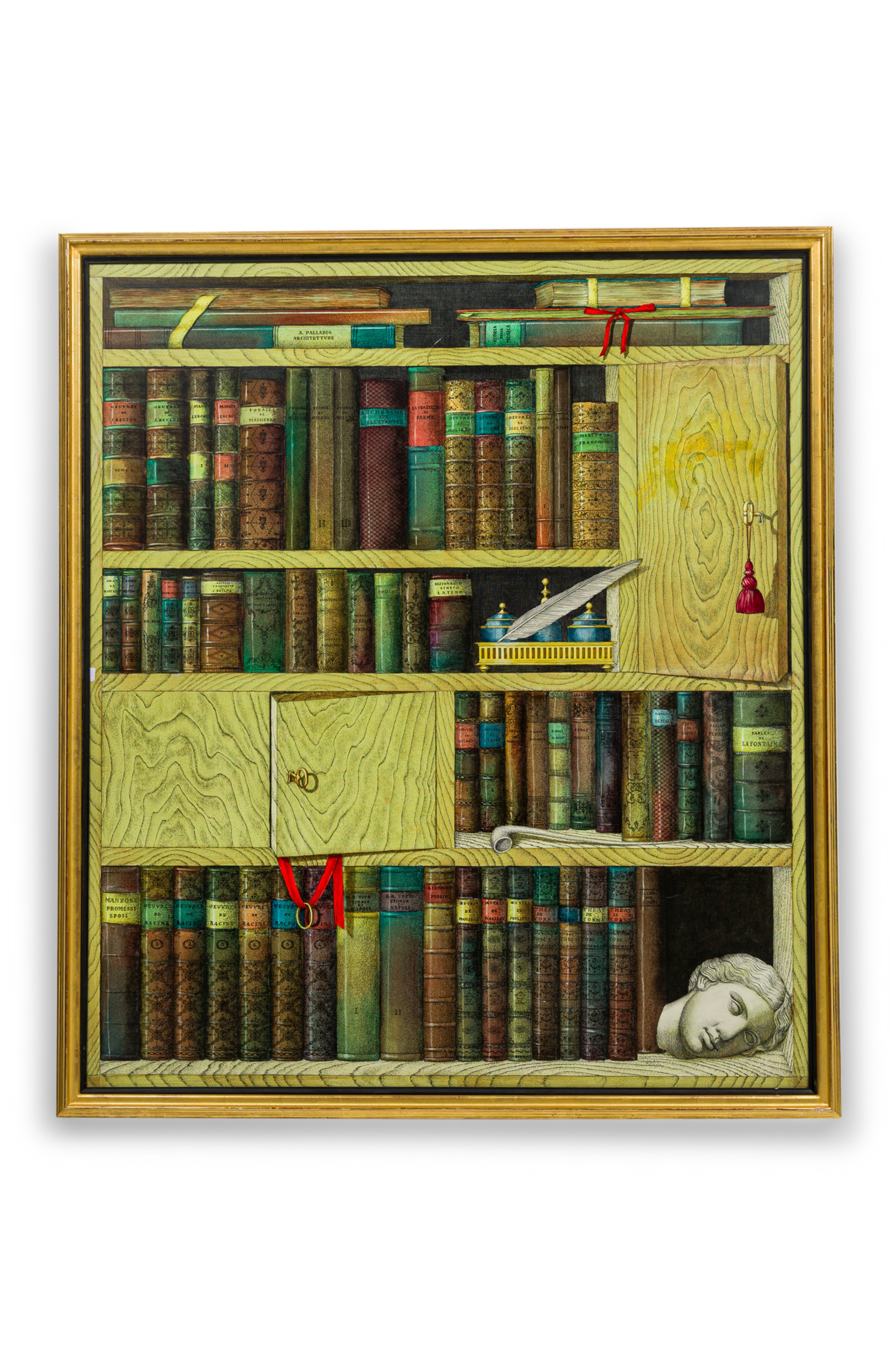Italian Mid-Century large framed print on a wooden panel board of an ornate bookcase with inkwells, writing plume, pipe and a bust in a black and gilt frame (attr: FORNASETTI).