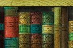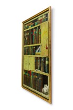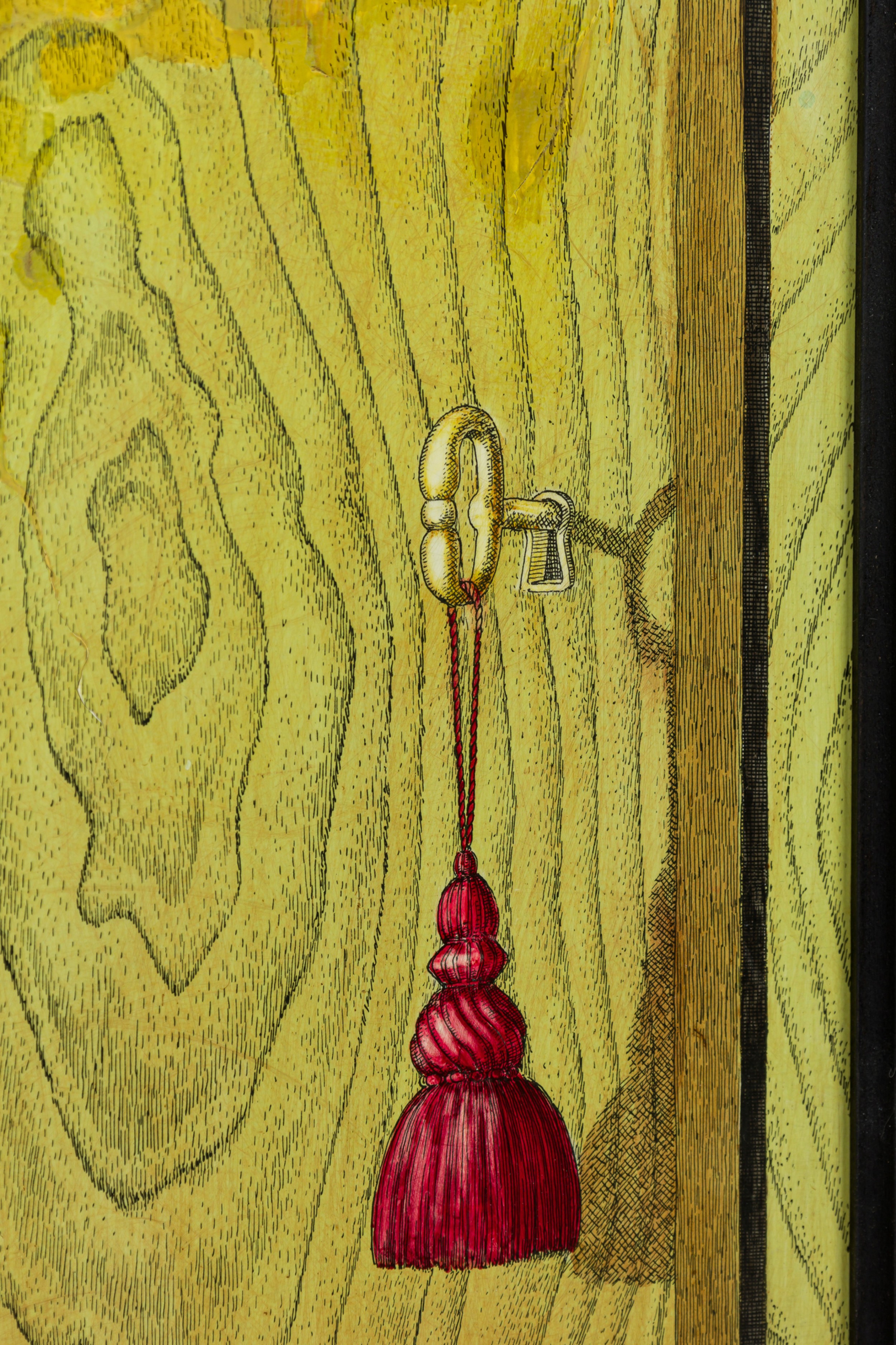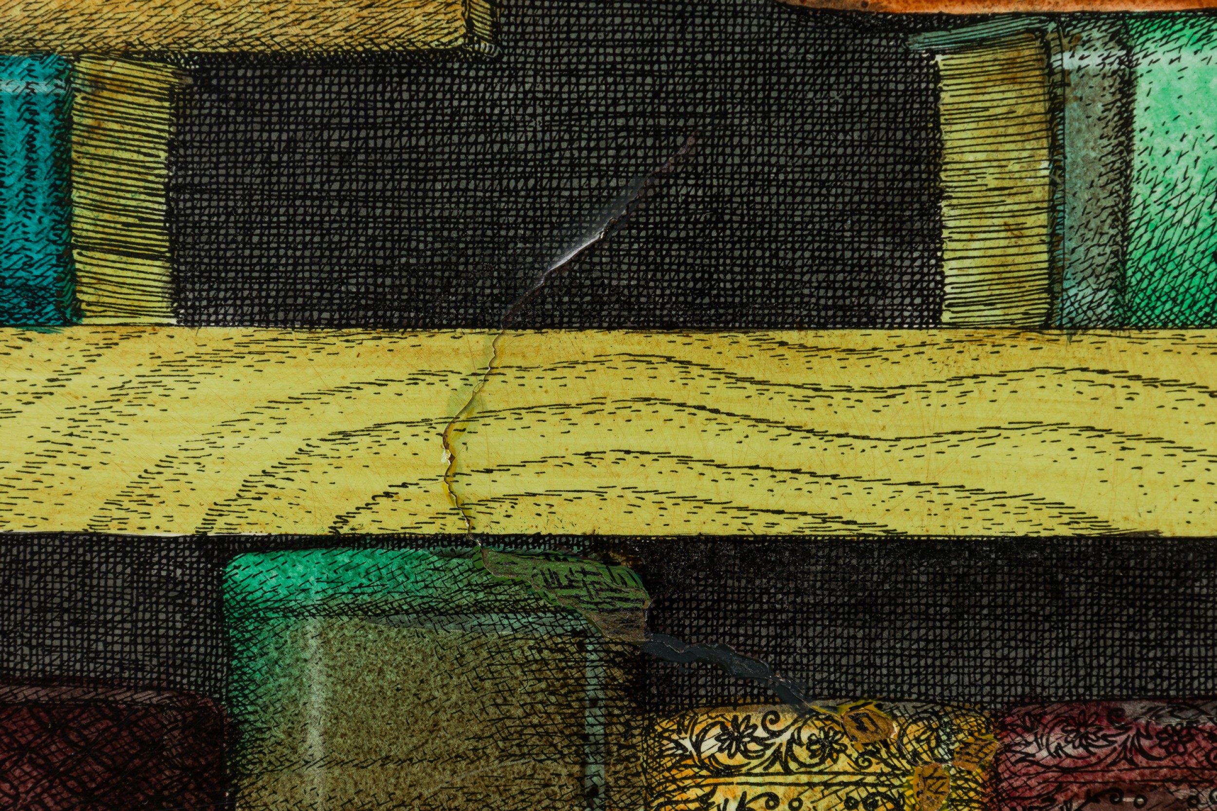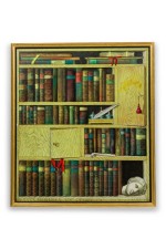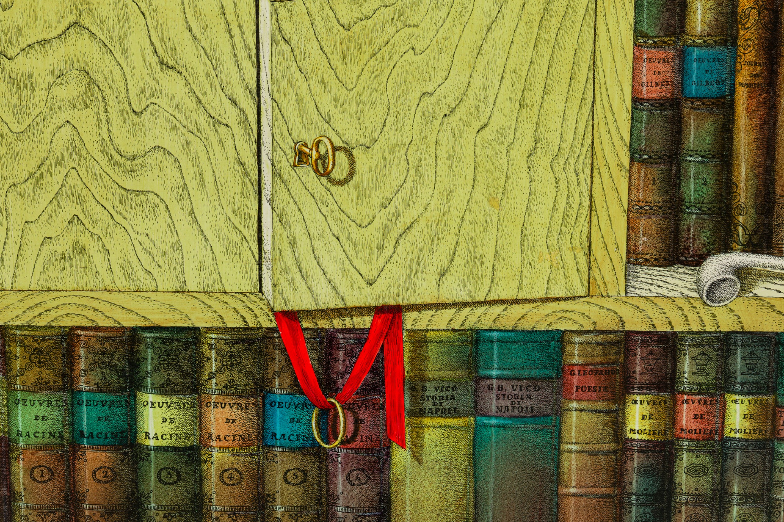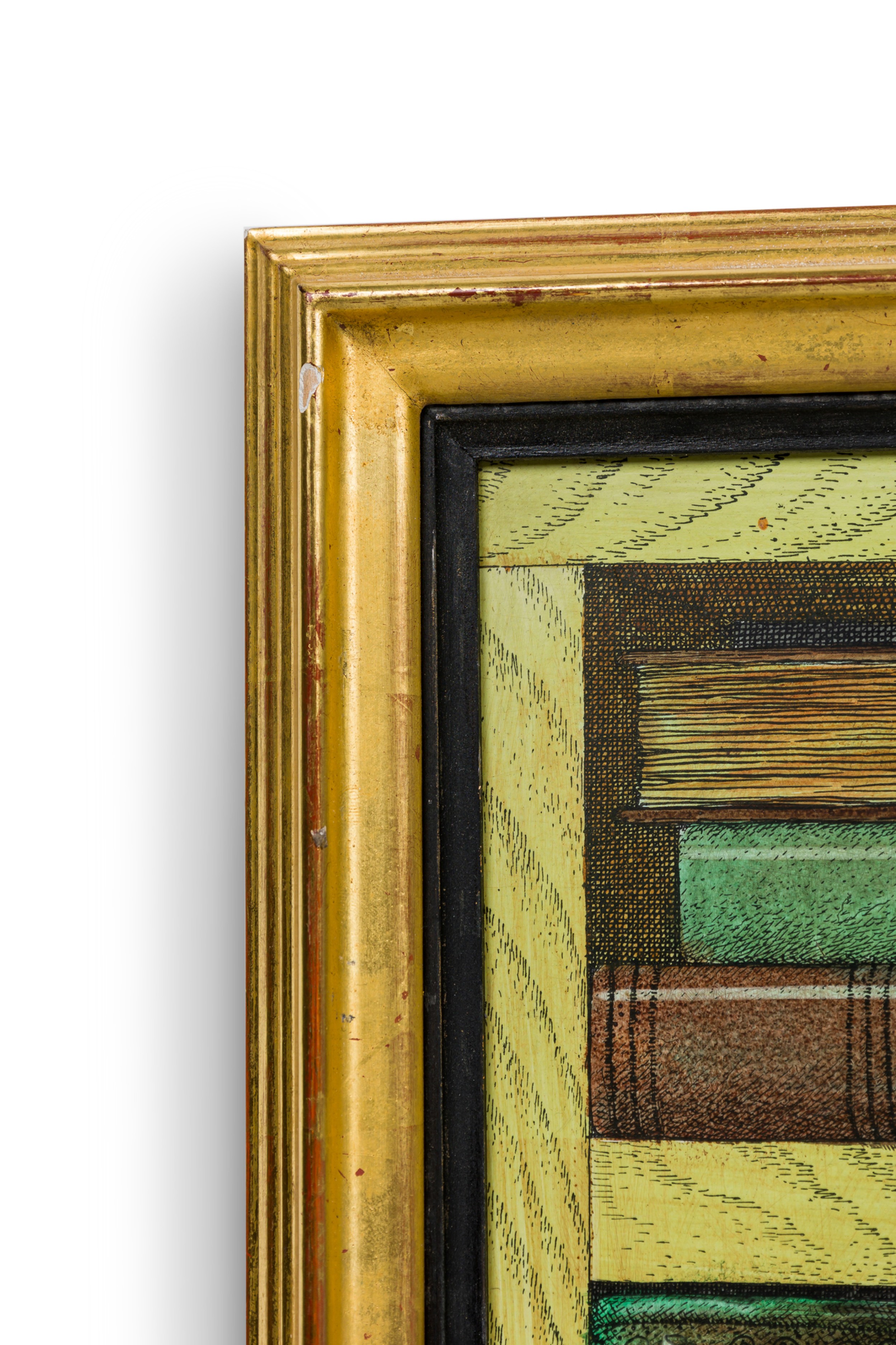 Italian Mid-Century large framed print on a wooden panel board of an ornate bookcase with inkwells, writing plume, pipe and a bust in a black and gilt frame (attr: FORNASETTI)