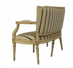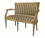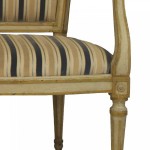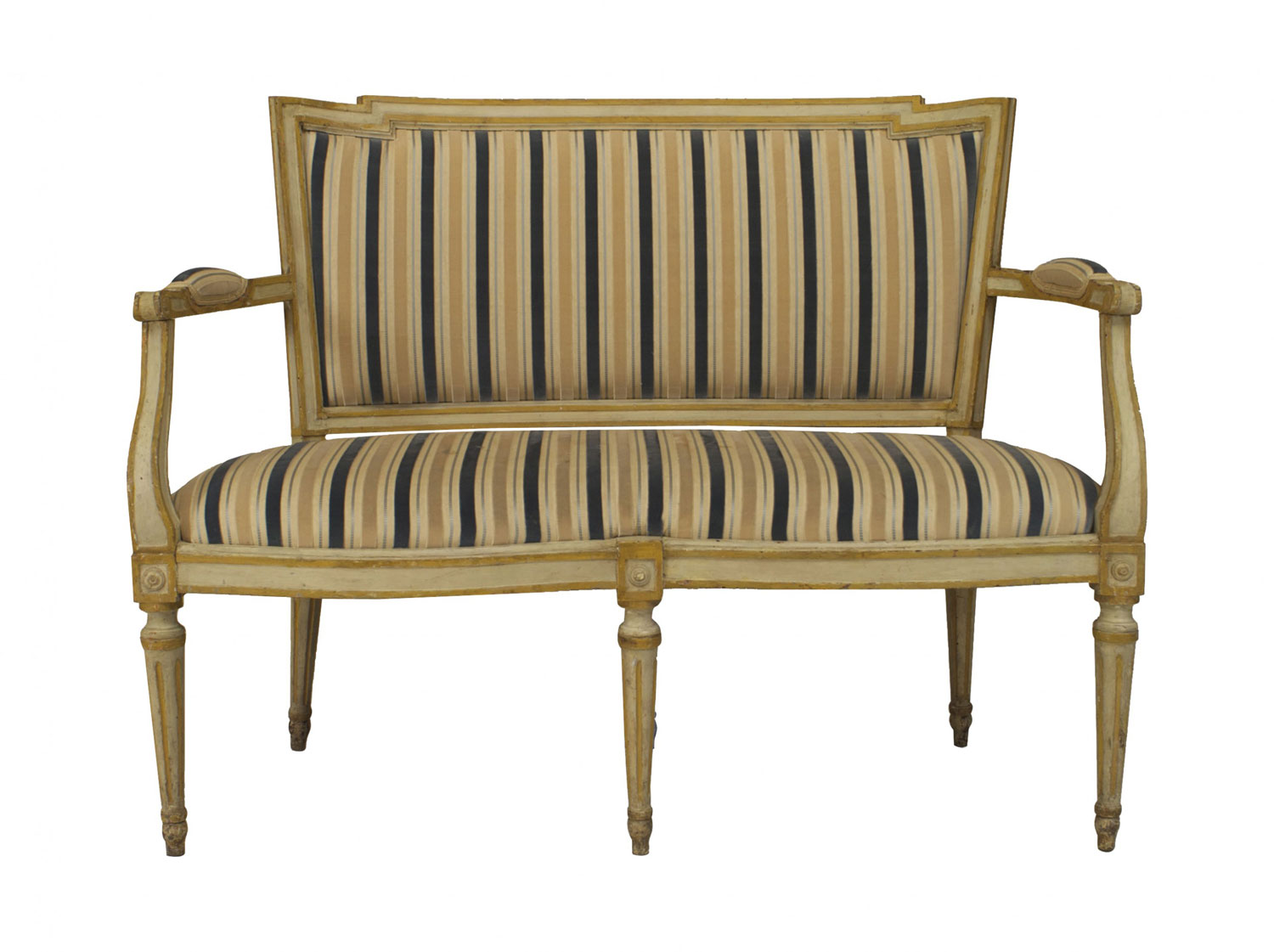 Italian Neo-classic (18/19th Cent) white painted and gold trimmed loveseat with a shaped front and center leg with striped upholstered seat and back