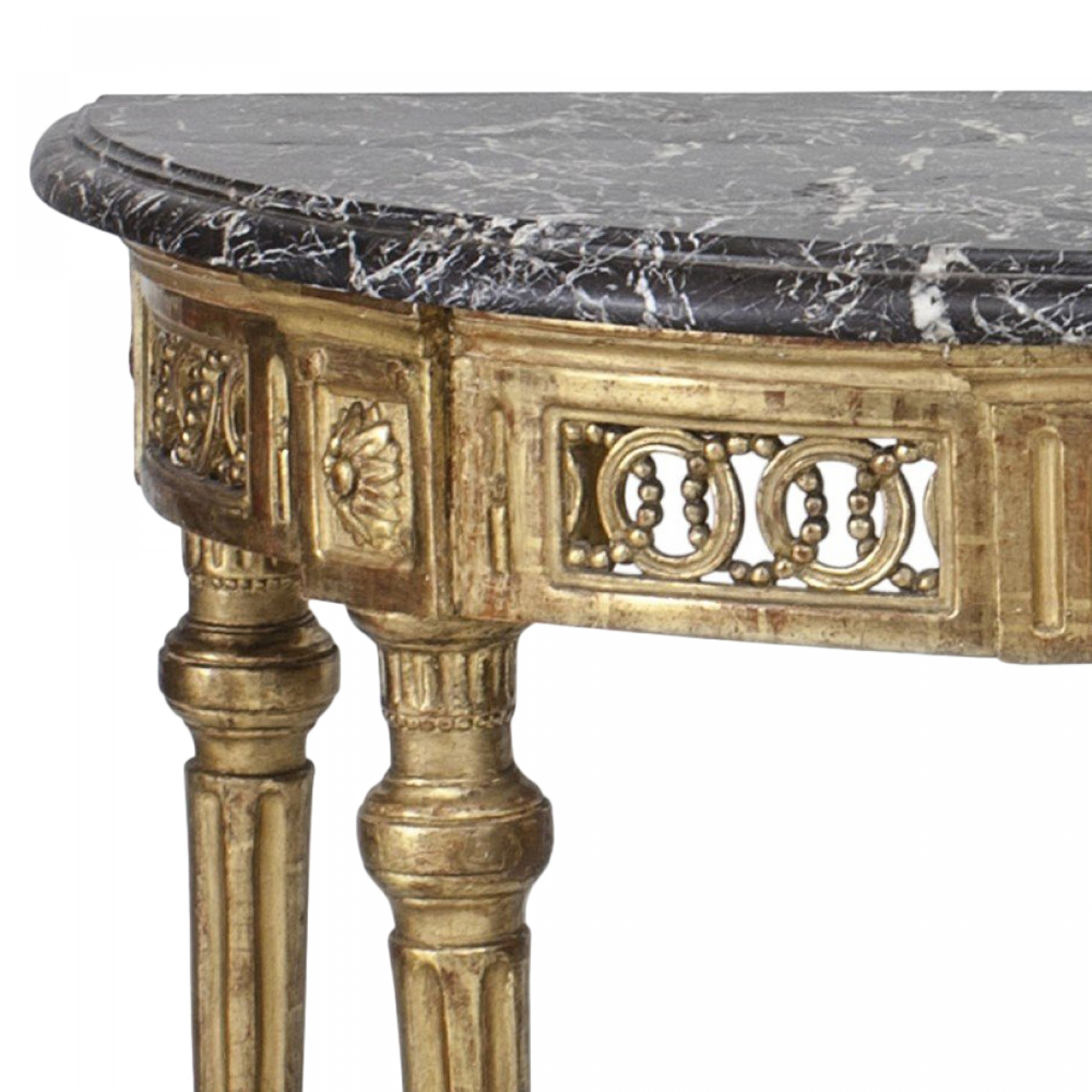 Italian Neo-classic-style (18th Century) gilt demilune shaped console table with fluted tapered legs supporting a filigree apron with a fluted center panel under a black marble top..