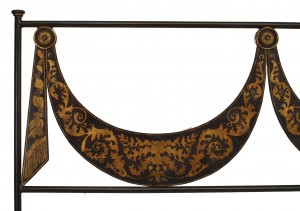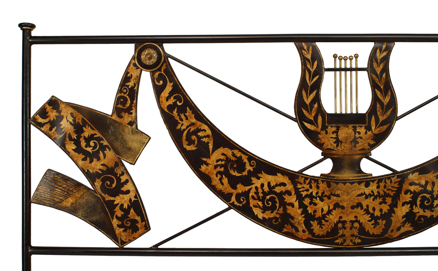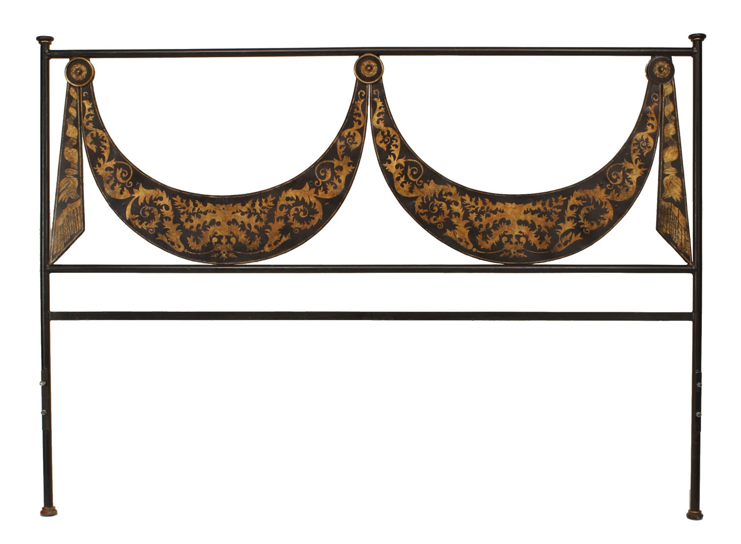 Italian Neo-classic-style (Mid-20th Century) black tole king size bed with swag design gold decorative trim with lyre design on headboard (includes: headboard and footboard, does not include rails).
