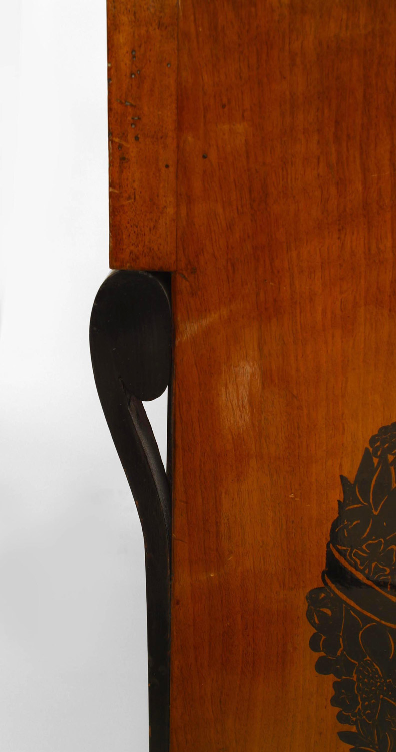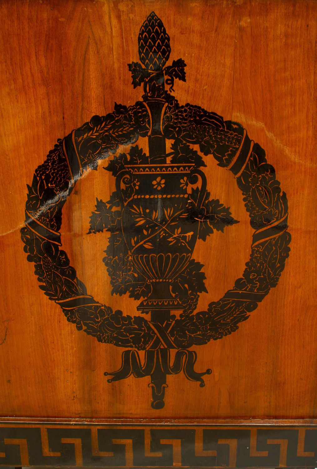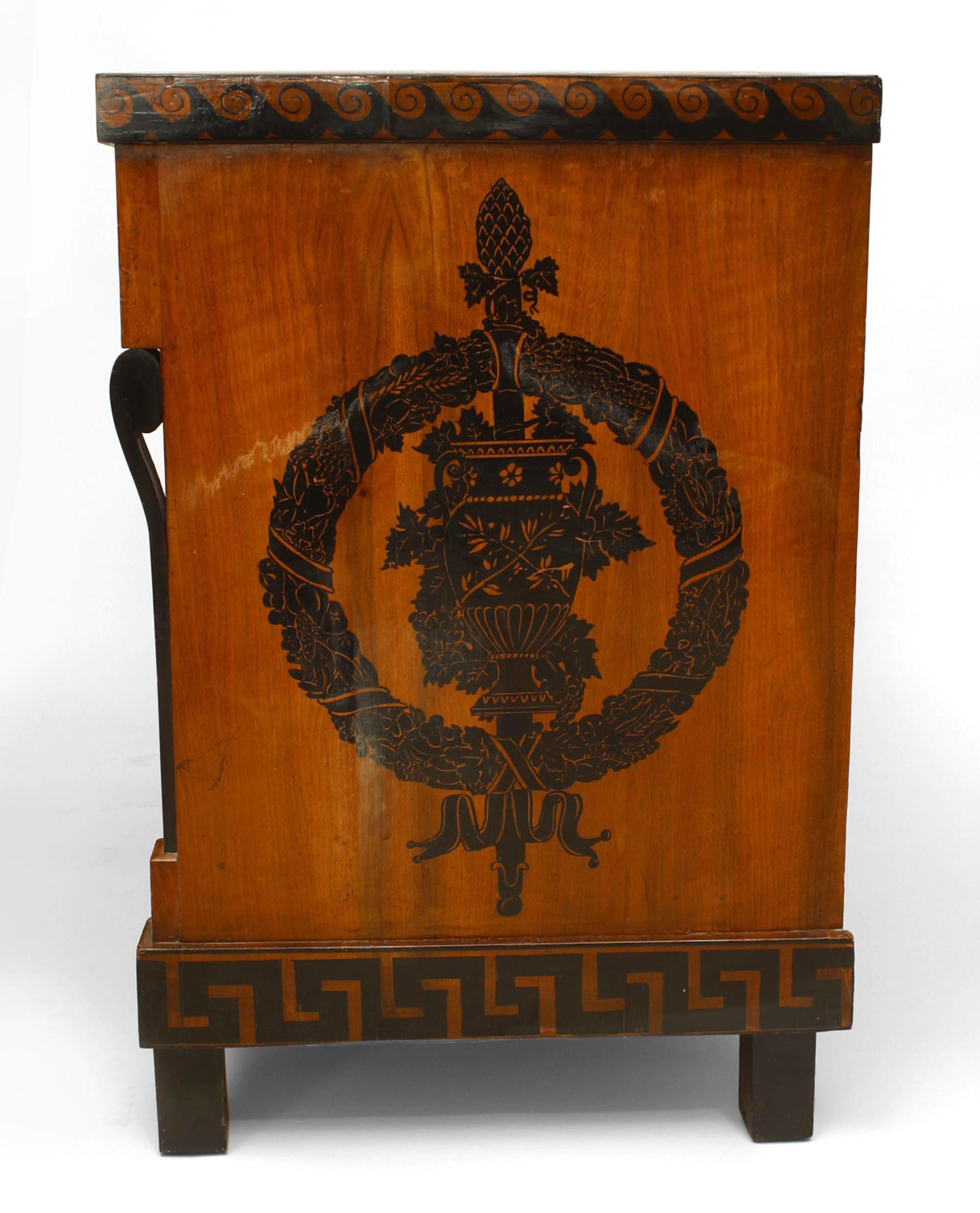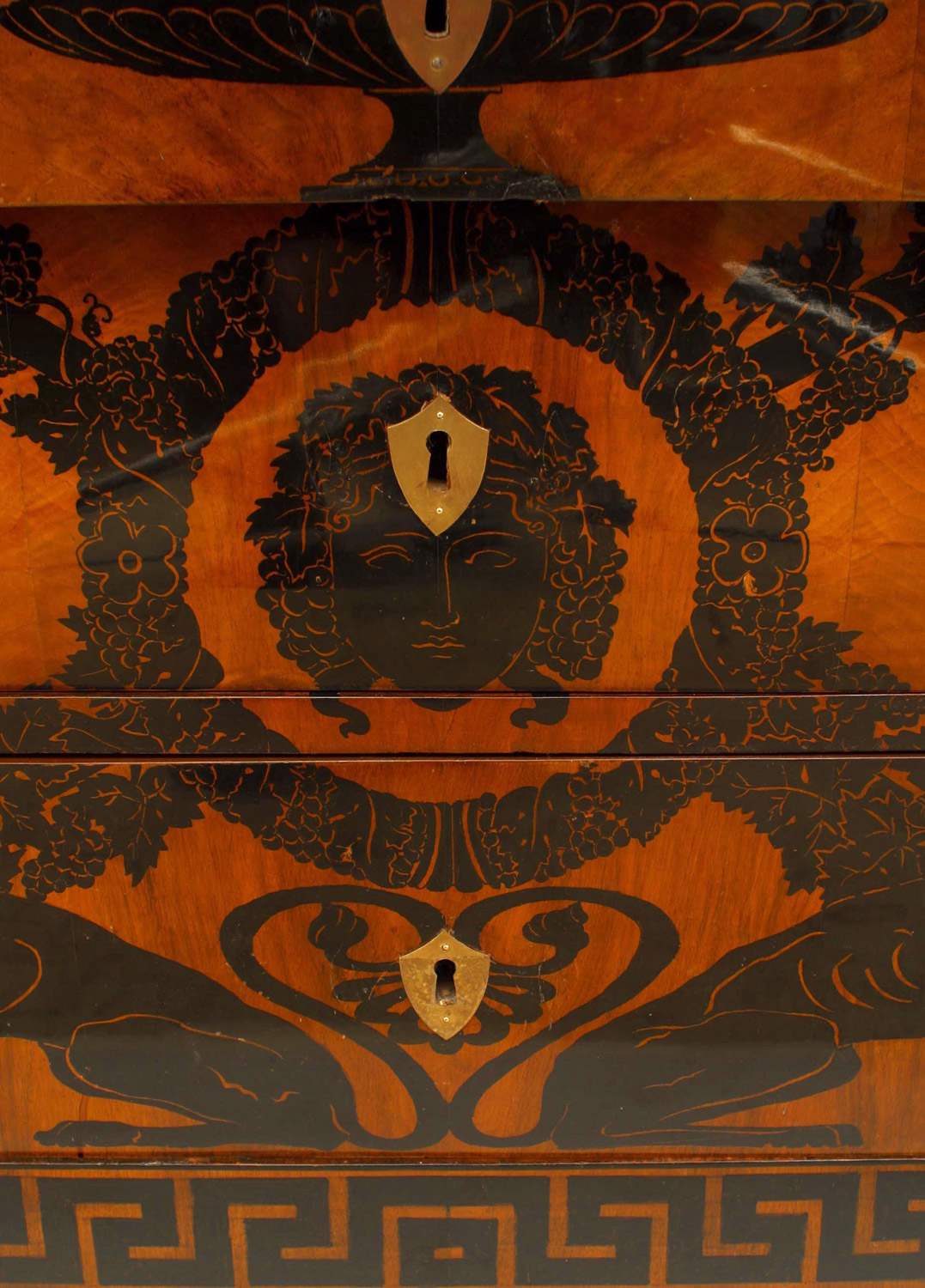 Italian Neo-classic (Early 19th Century) walnut chest with 3 drawers and decorated with ebonized penwork of wreaths, heads and other various motifs.