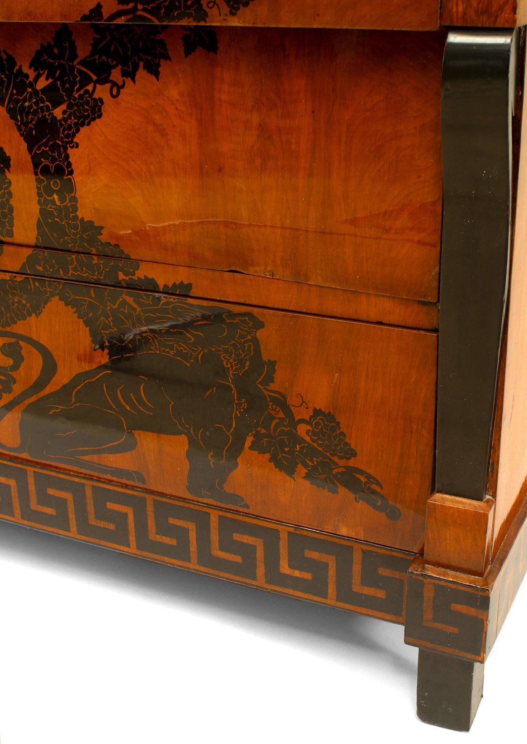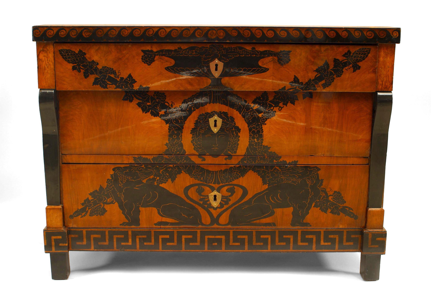 Italian Neo-classic (Early 19th Century) walnut chest with 3 drawers and decorated with ebonized penwork of wreaths, heads and other various motifs..