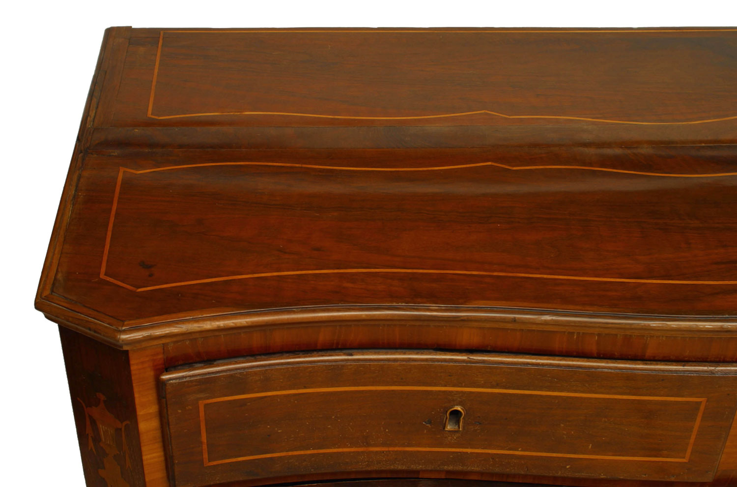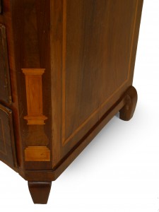 Italian Neo-classic walnut chest with inlaid banding on top and canted corners having an inlaid obelisk design with a serpentine top over a 2 drawers above 3 drawers.