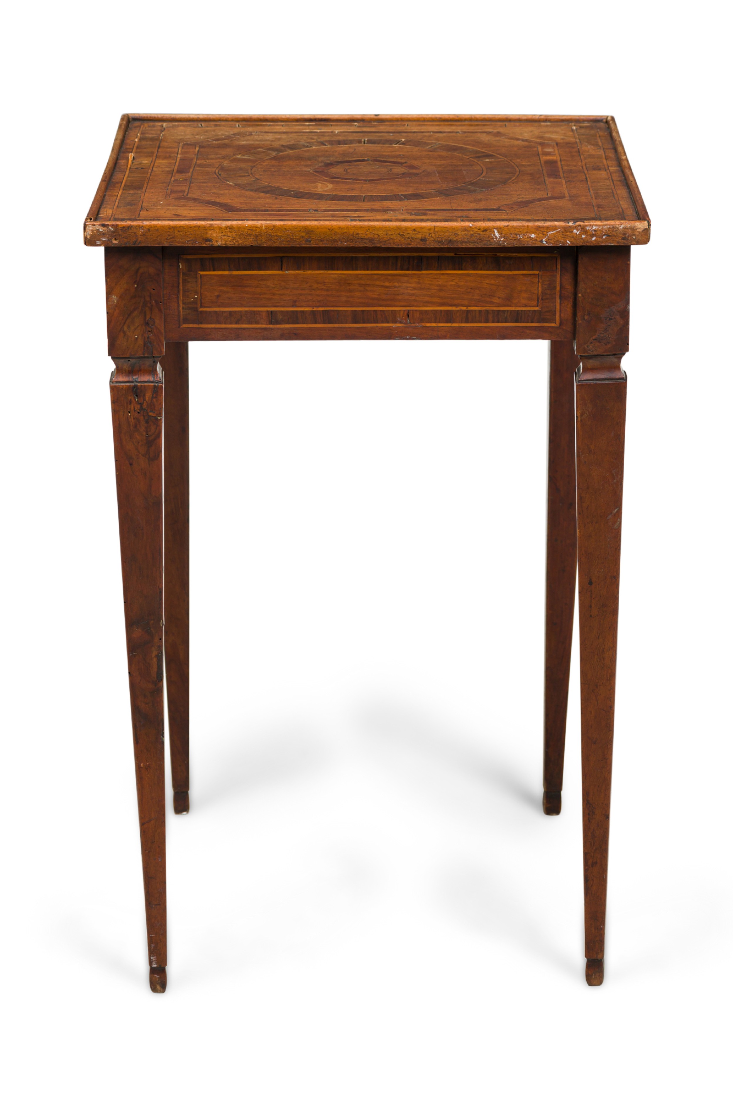 Italian Neo-Classic (19th Century) square walnut end / side table with a top featuring an inlaid design of concentric circles and geometric shapes, an inlaid apron, single drawer with a small brass drawer pull, and square tapered legs.