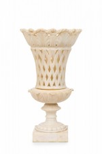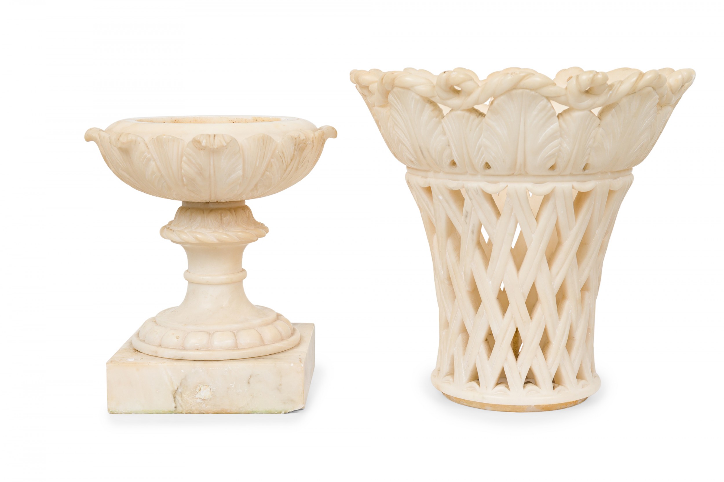 Italian Neo-Classic Grand Tour (19th Century) white alabaster centerpiece in an urn form with a rope and foliate design lip and diamond reticulated body, resting on a square white marble base..