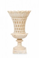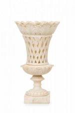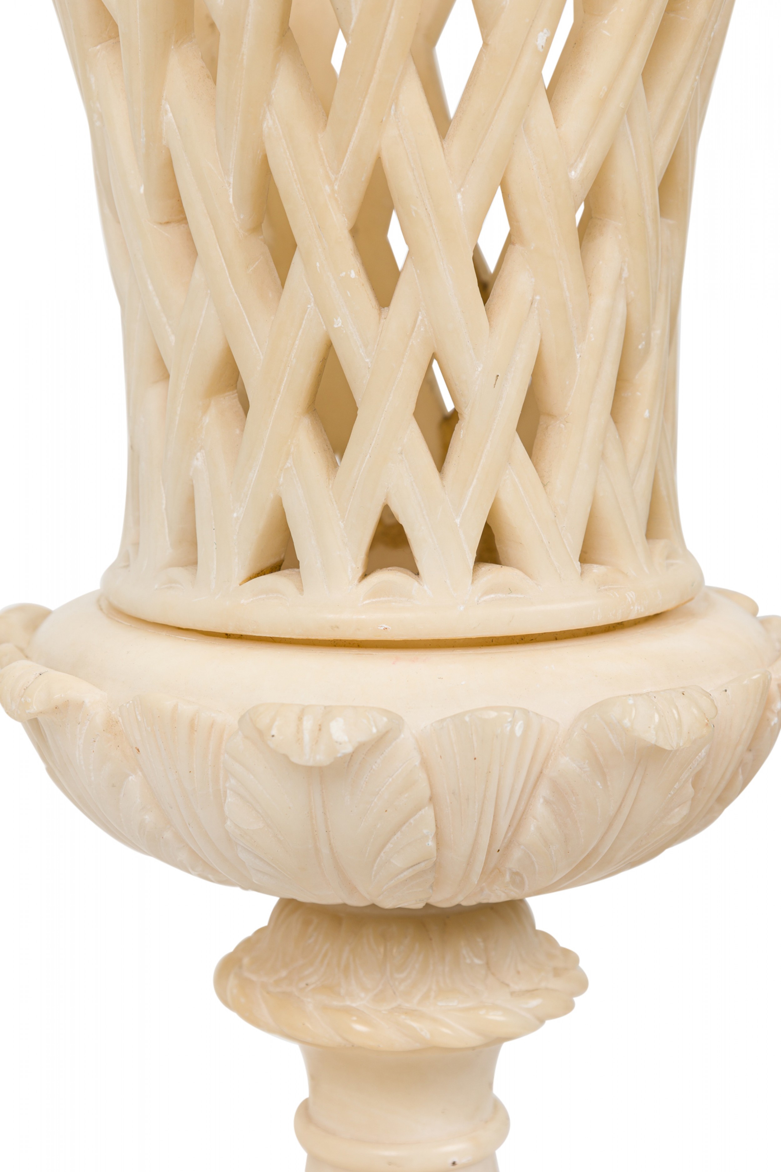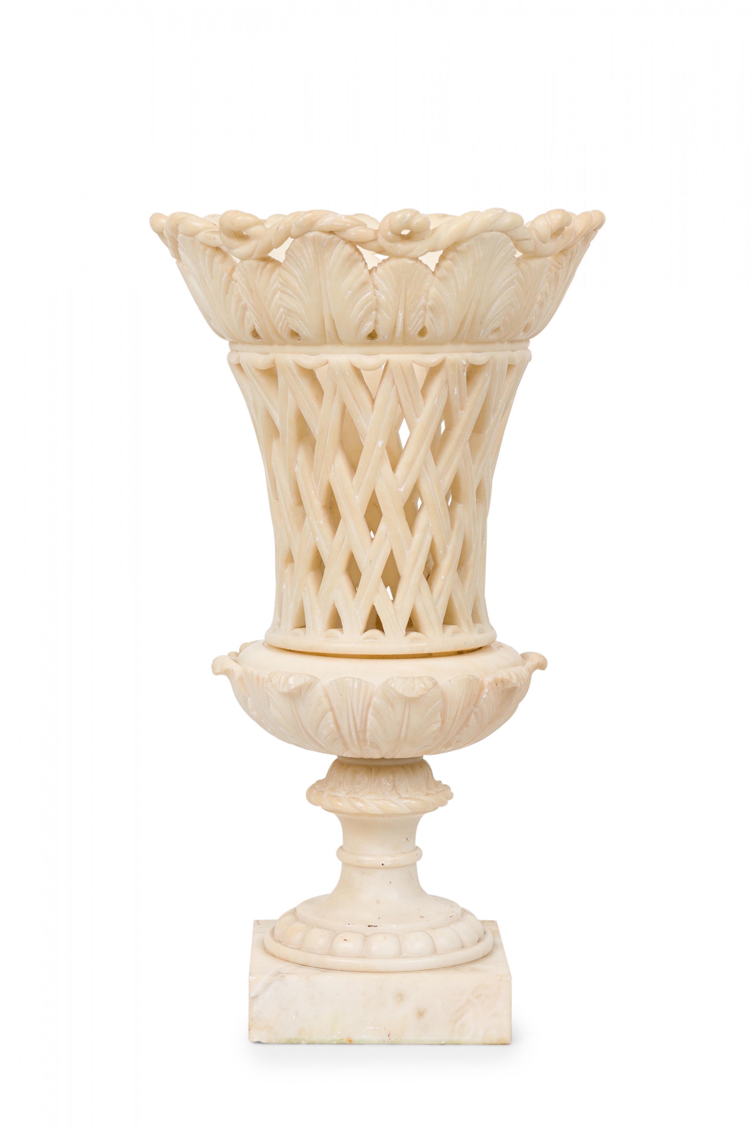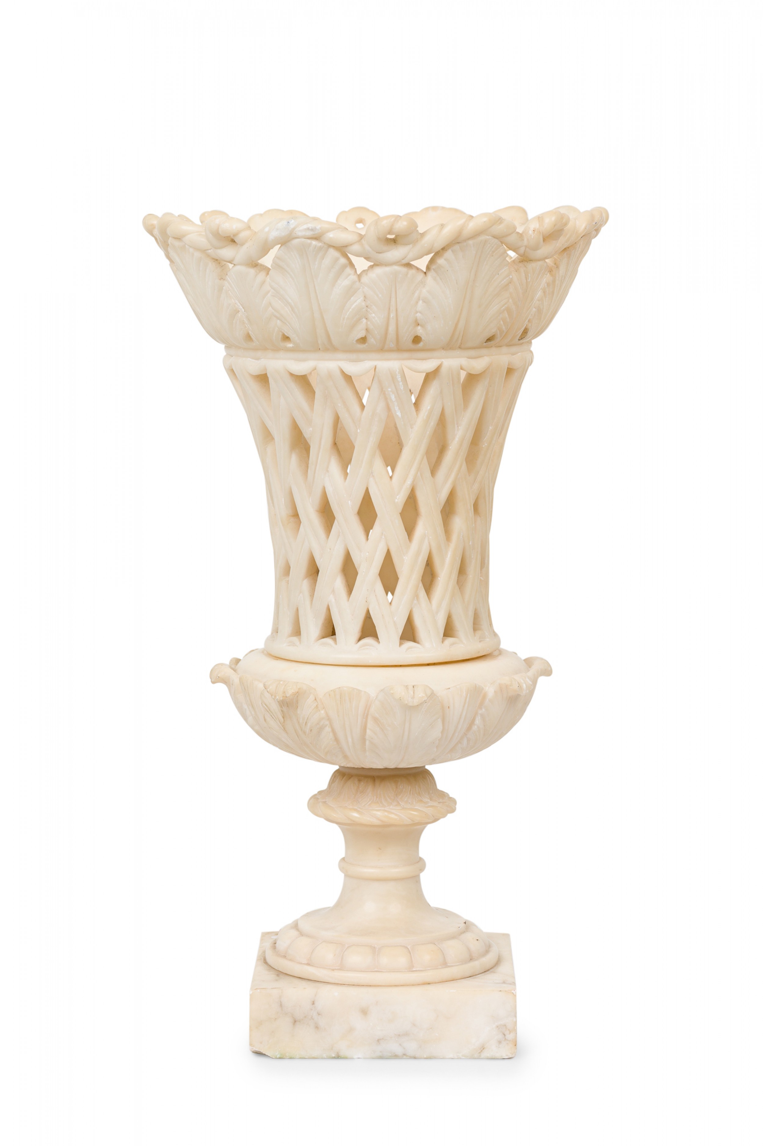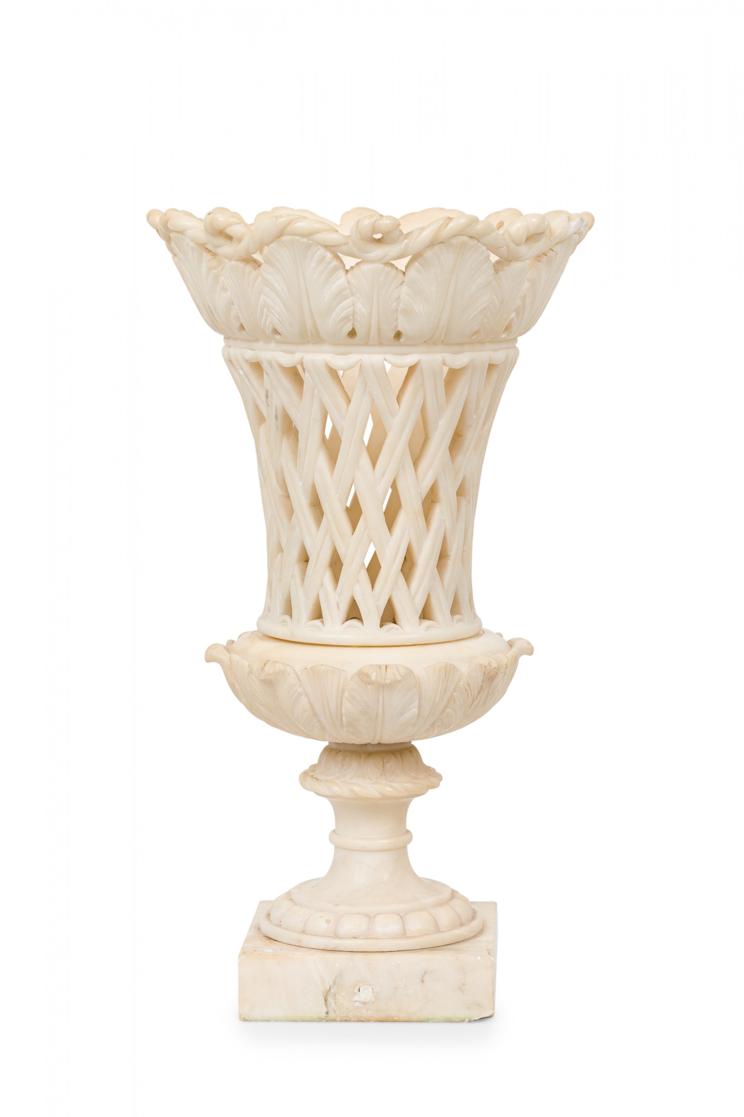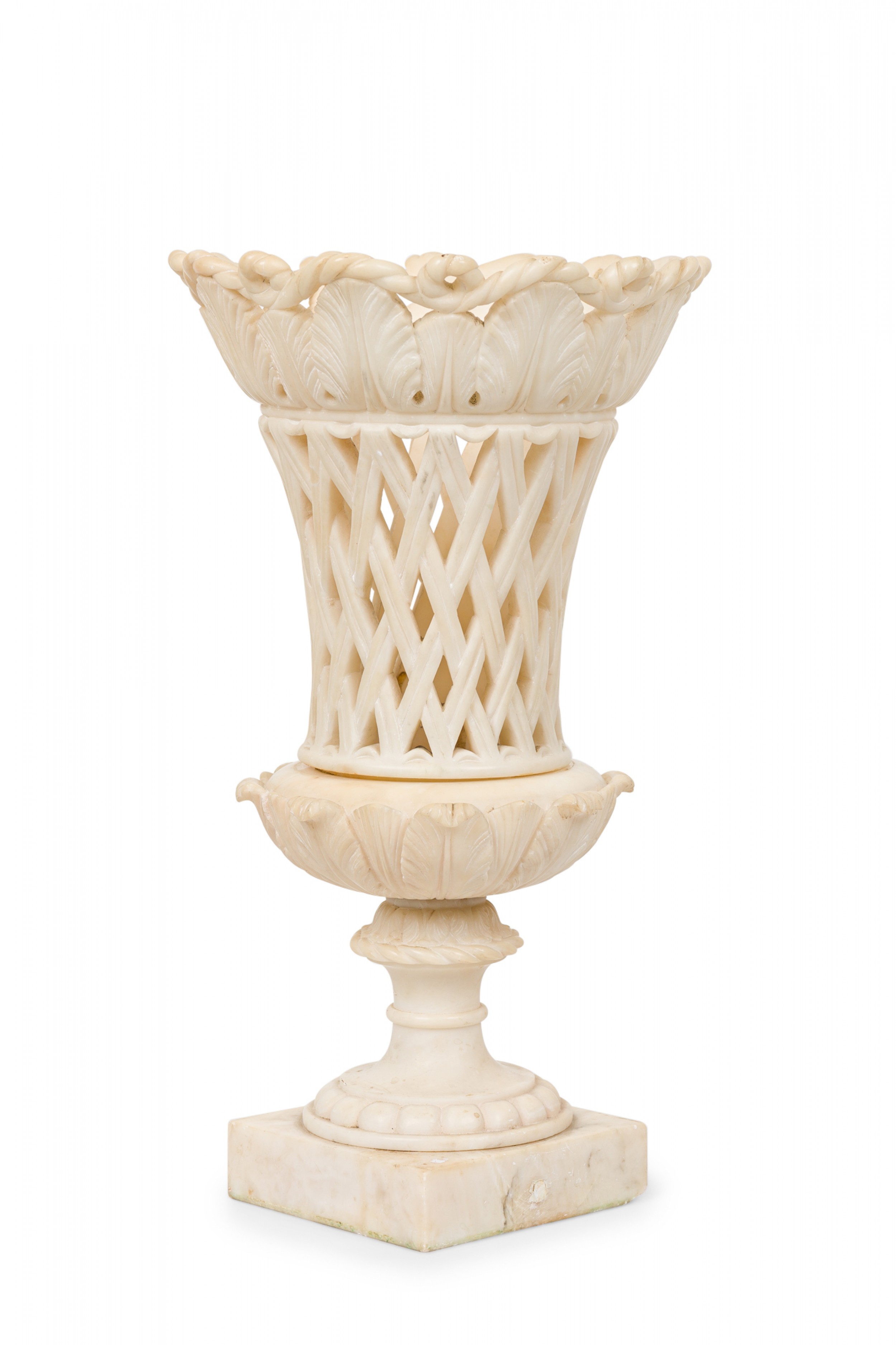 Italian Neo-Classic Grand Tour (19th Century) white alabaster centerpiece in an urn form with a rope and foliate design lip and diamond reticulated body, resting on a square white marble base.