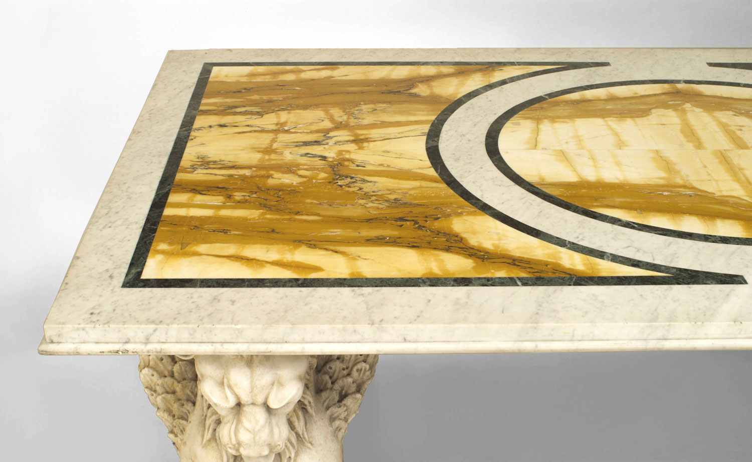 Italian Neo-classic (18th Century) center table with 2 white marble bases having carved winged lions and claw feet centering a rouge & Siena marble rondel supporting a later inlaid rectangular marble top.